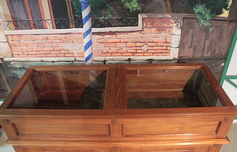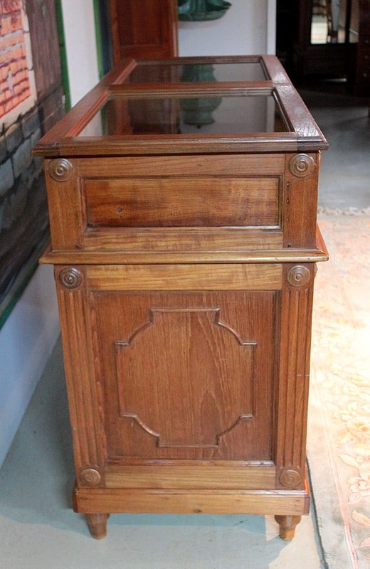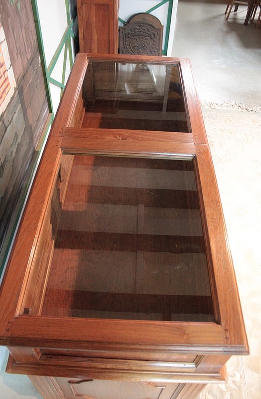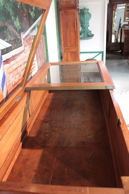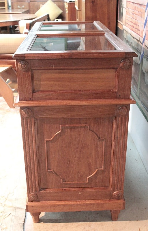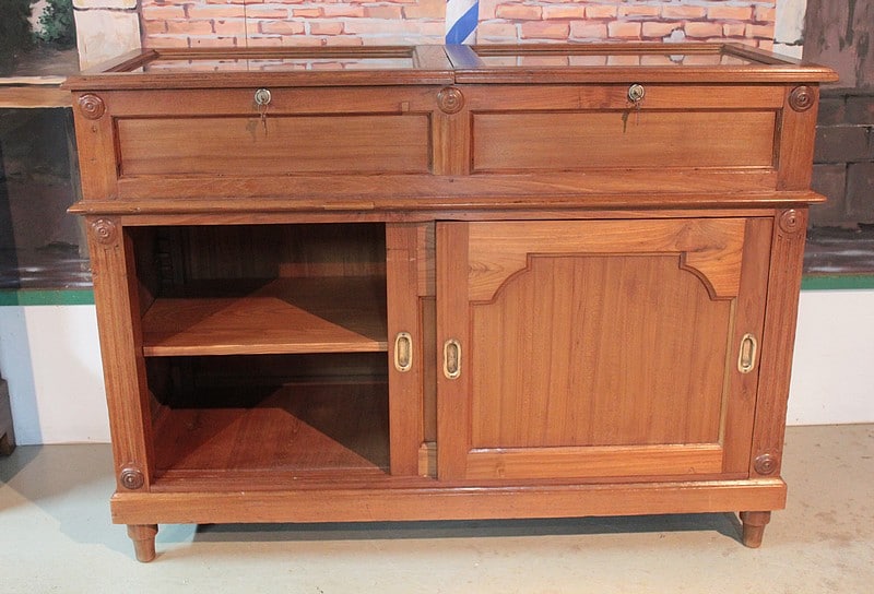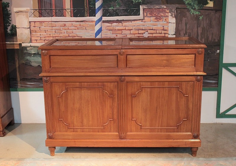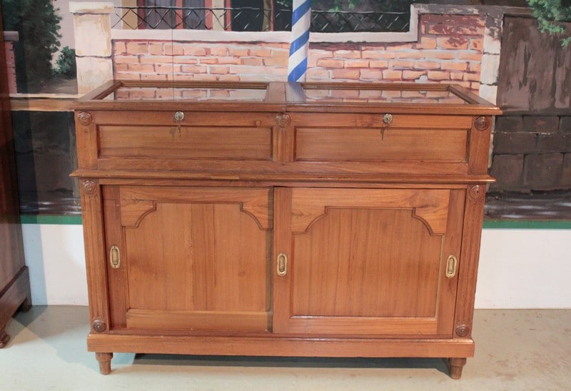 Présentoir de commerce en teck ouvrant par deux portes coulissantes à l’arrière et 2 portes vitrées fermant à clé, avec entourage bois, sur le dessus.