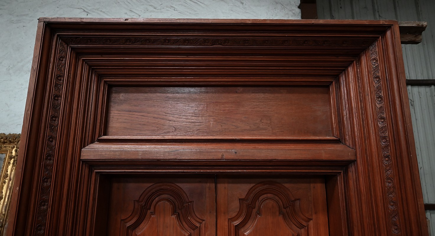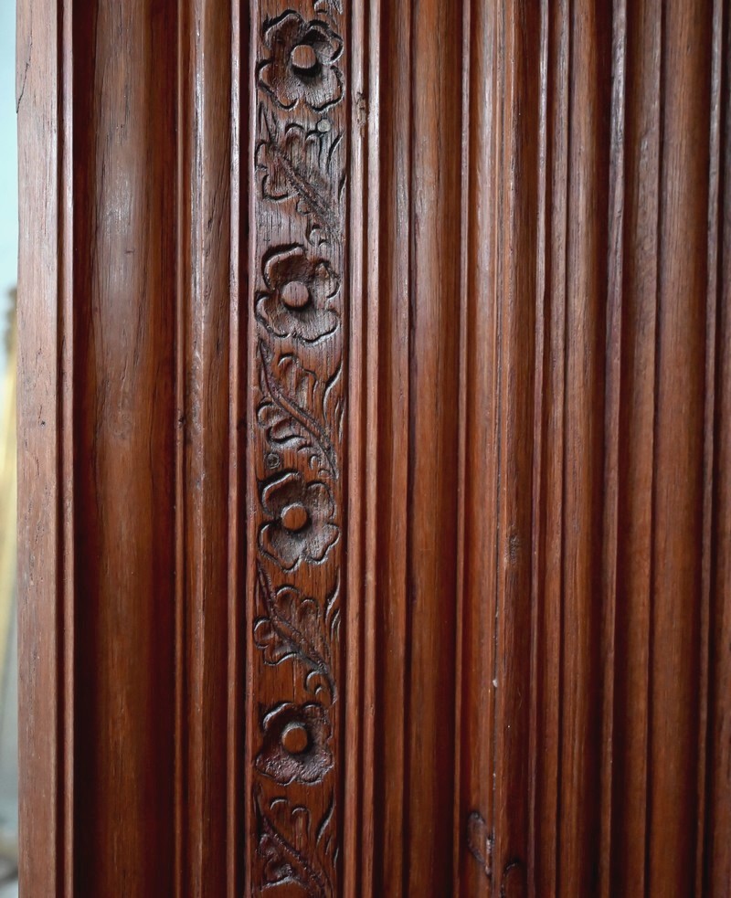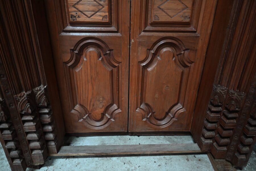 Anciennes portes indiennes en bois de teck sculpté par des maîtres artisans ébénistes de Vhedapuram, région de Pondichéry.
