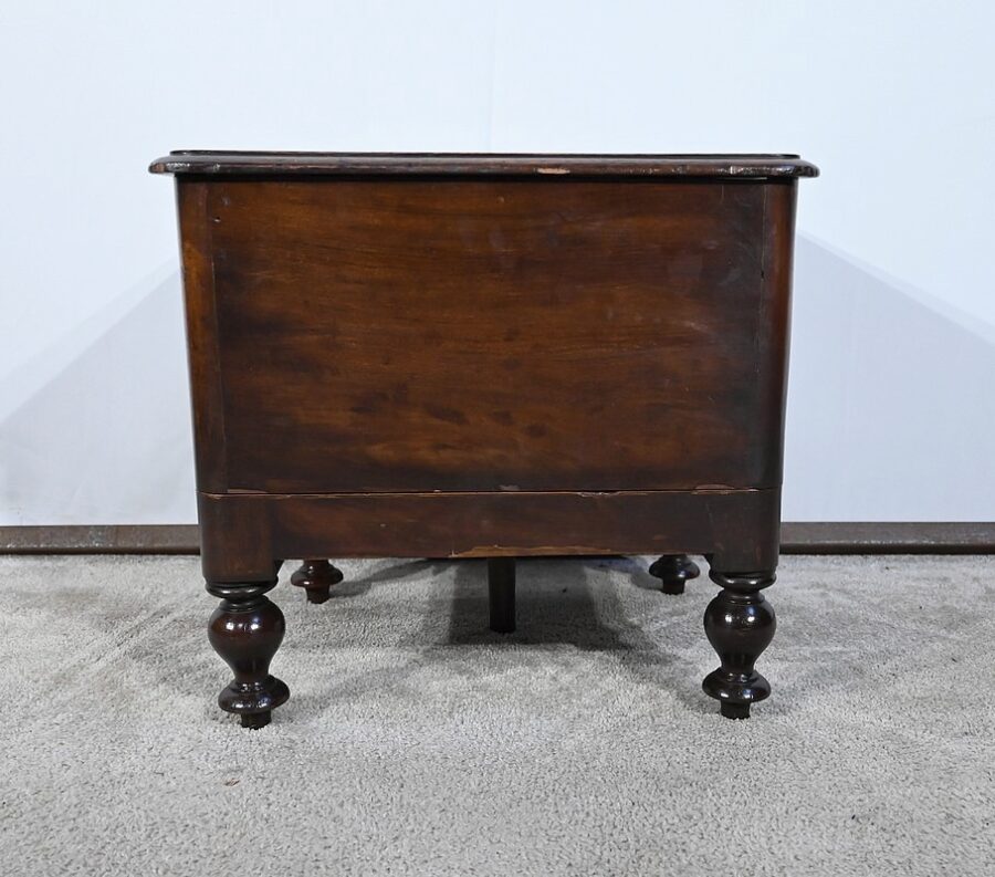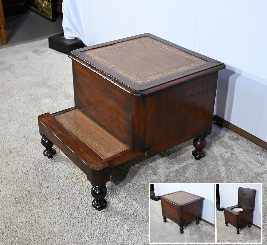 Commodités Anglaises d’époque Victorienne formant marche-pied. Ce petit mobilier atypique possède un dessus foncé d’un cuir fauve, comme la petite marche coulissante. Les cuirs possèdent chacun une vignette dorée et une vignette à froid.
