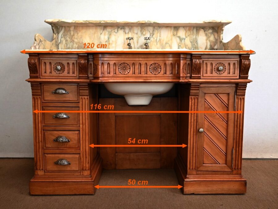 Ce meuble, en merisier massif avec intérieur en chêne, est sommé d’un marbre Breche du Benou jaune, originaire de la commune de Bieille dans les Pyrénées-Atlantiques. Ce dessus à réserve est mouluré à l’arête d’un bec-de-corbin. Celui-ci est équipé d’une vasque pivotante en porcelaine, avec système d’évacuation des eaux, ainsi que de deux robinets en inox « Maurice Herbeau », pouvant être indépendamment raccordés à l’eau chaude et froide. Ils sont chapeautés par une tablette en marbre, supportée aux extrémités par deux éléments en console. La ceinture, en avancée et à décrochement en partie centrale, propose deux tiroirs latéraux. Cet ensemble repose sur deux caissons sur plinthes. Celui de gauche ouvre par quatre tiroirs identiques, à poignées coquille en métal argenté. Celui de droite se compose d’une porte sur pommelles, munie d’un bouton de tirage et façonnée de lamelles rainurées en diagonales. L’intérieur propose une étagère réglable puisque sur crémaillères.