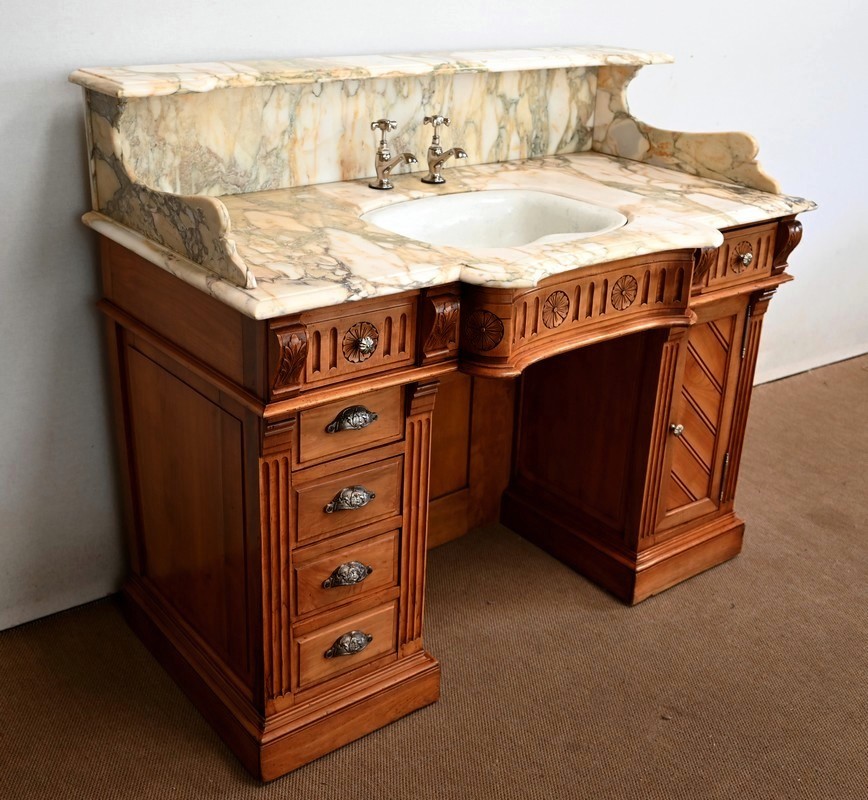 Ce meuble, en merisier massif avec intérieur en chêne, est sommé d’un marbre Breche du Benou jaune, originaire de la commune de Bieille dans les Pyrénées-Atlantiques. Ce dessus à réserve est mouluré à l’arête d’un bec-de-corbin. Celui-ci est équipé d’une vasque pivotante en porcelaine, avec système d’évacuation des eaux, ainsi que de deux robinets en inox « Maurice Herbeau », pouvant être indépendamment raccordés à l’eau chaude et froide. Ils sont chapeautés par une tablette en marbre, supportée aux extrémités par deux éléments en console. La ceinture, en avancée et à décrochement en partie centrale, propose deux tiroirs latéraux. Cet ensemble repose sur deux caissons sur plinthes. Celui de gauche ouvre par quatre tiroirs identiques, à poignées coquille en métal argenté. Celui de droite se compose d’une porte sur pommelles, munie d’un bouton de tirage et façonnée de lamelles rainurées en diagonales. L’intérieur propose une étagère réglable puisque sur crémaillères.