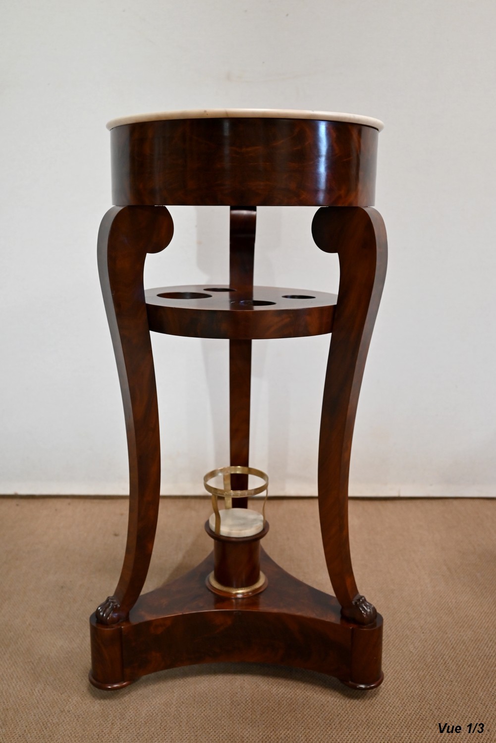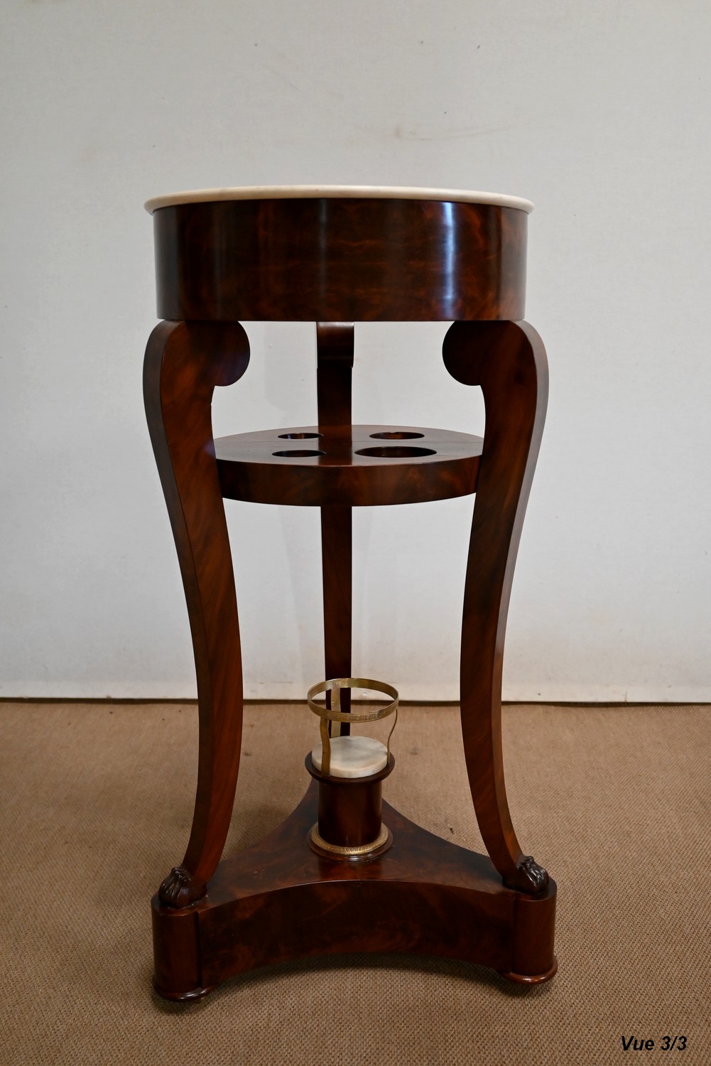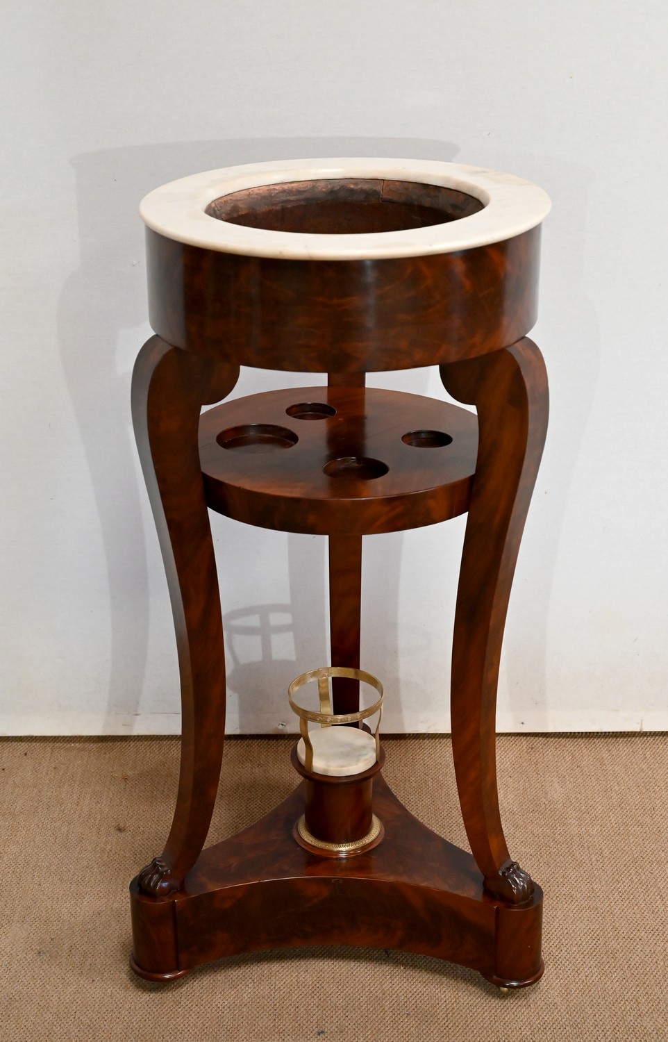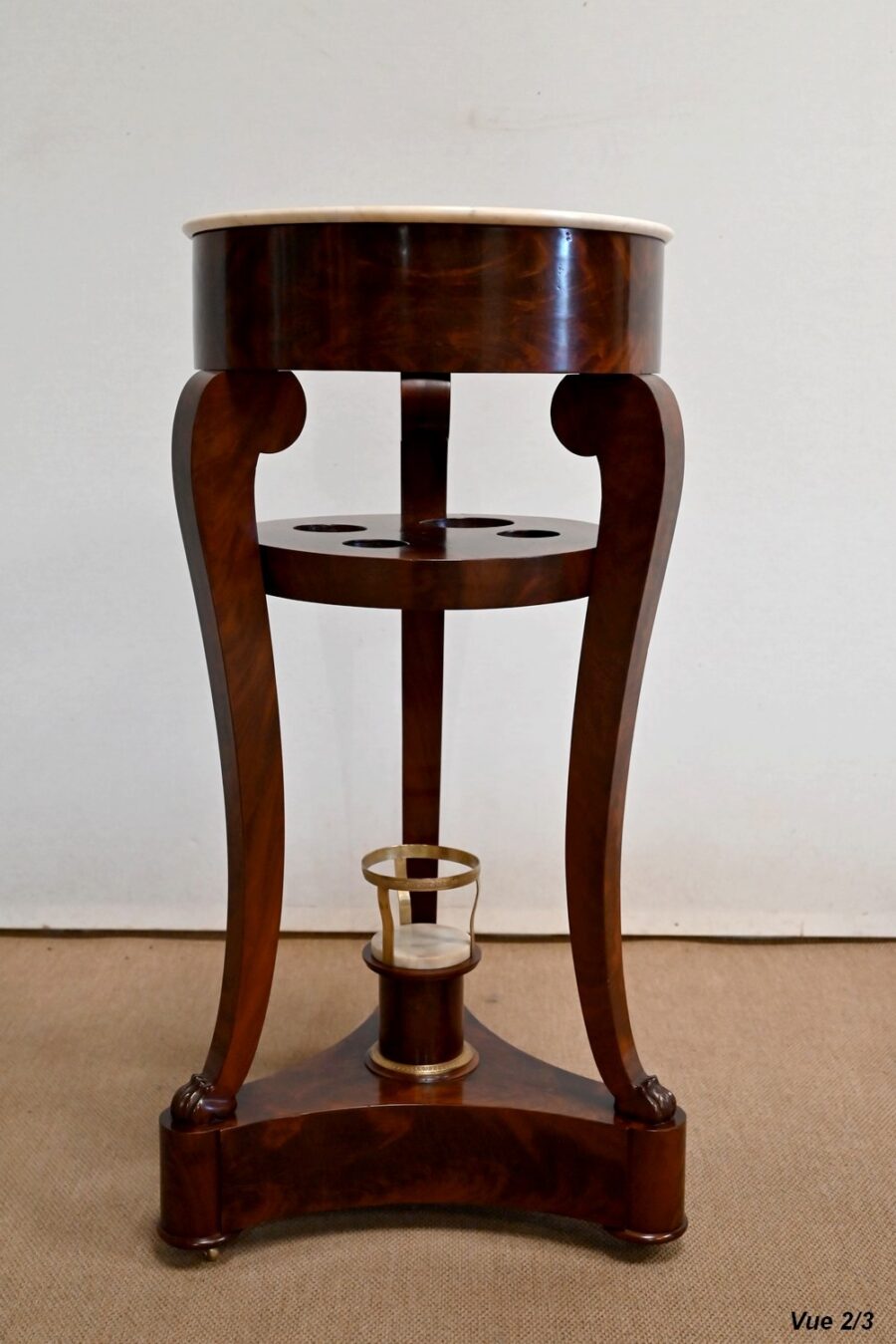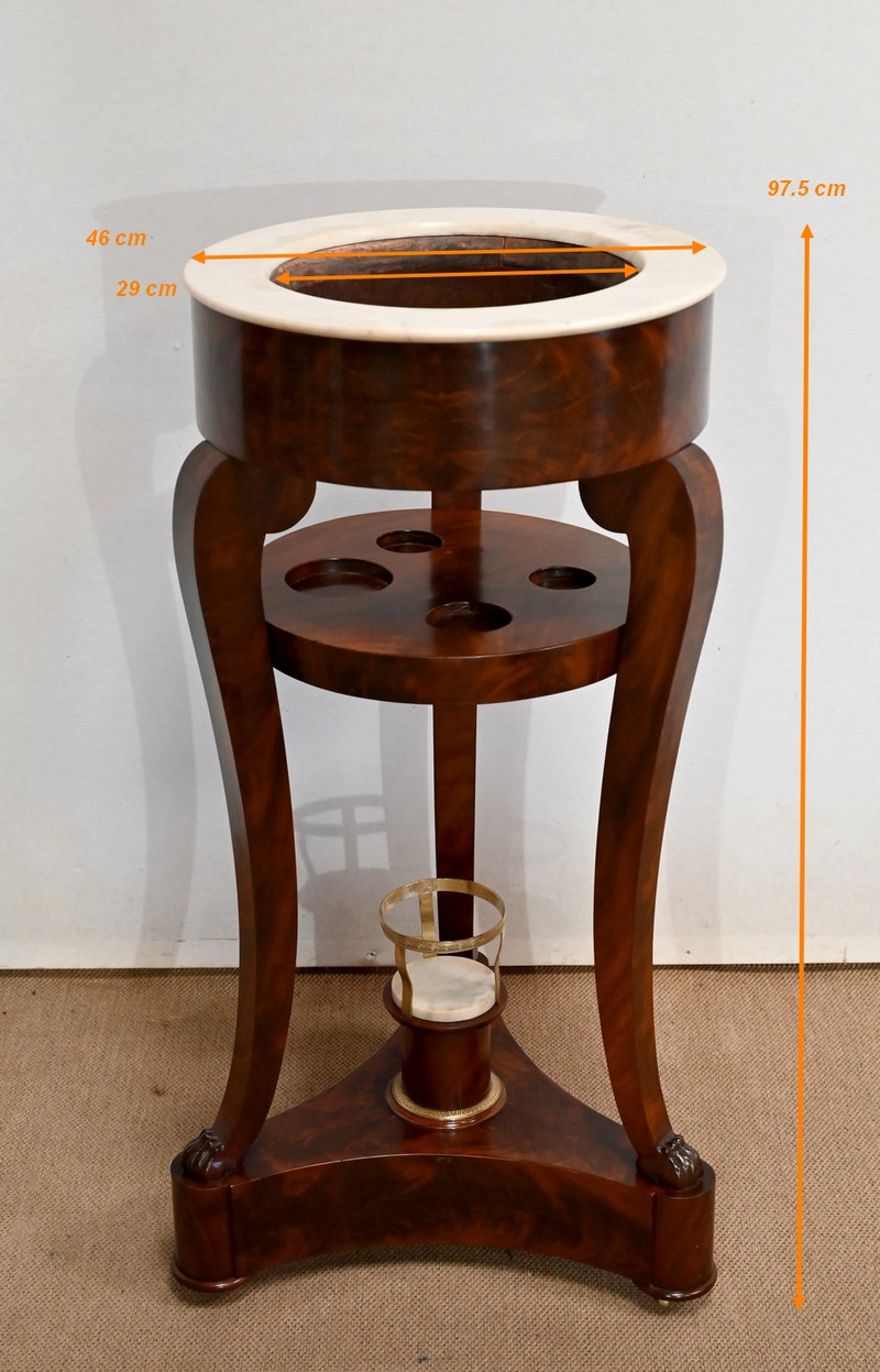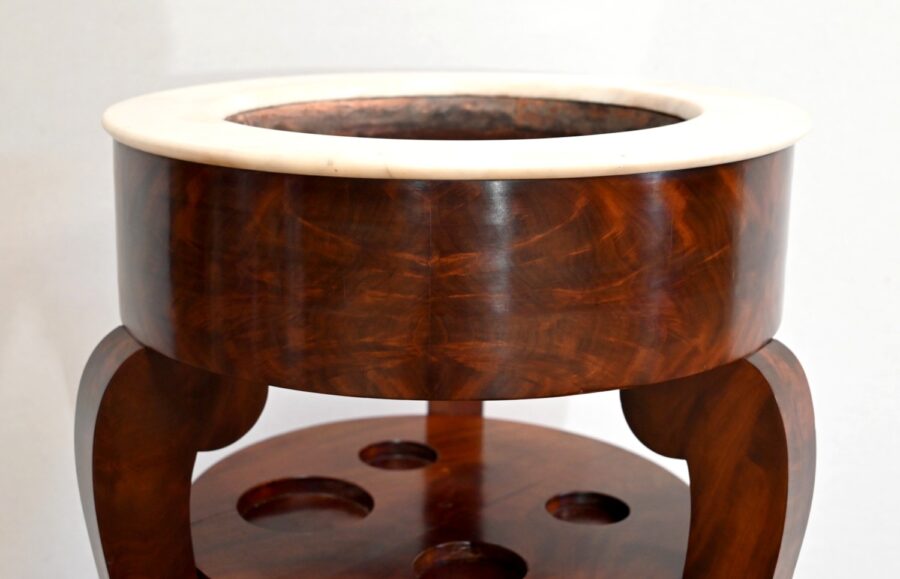 L’ensemble repose sur trois pieds légèrement galbés, s’affinant vers le bas, se finissant par des griffes de lion. Ceux-ci reposent sur un socle en hélice en placage de ronce d’acajou, sur roulettes. Un élément cylindrique dont la base a une bague en laiton ciselé, de motifs Empire y est disposé. Son dessus possède un marbre, surmonté d’un élément également en laiton, servant sans doute, à y poser une réserve d’eau.