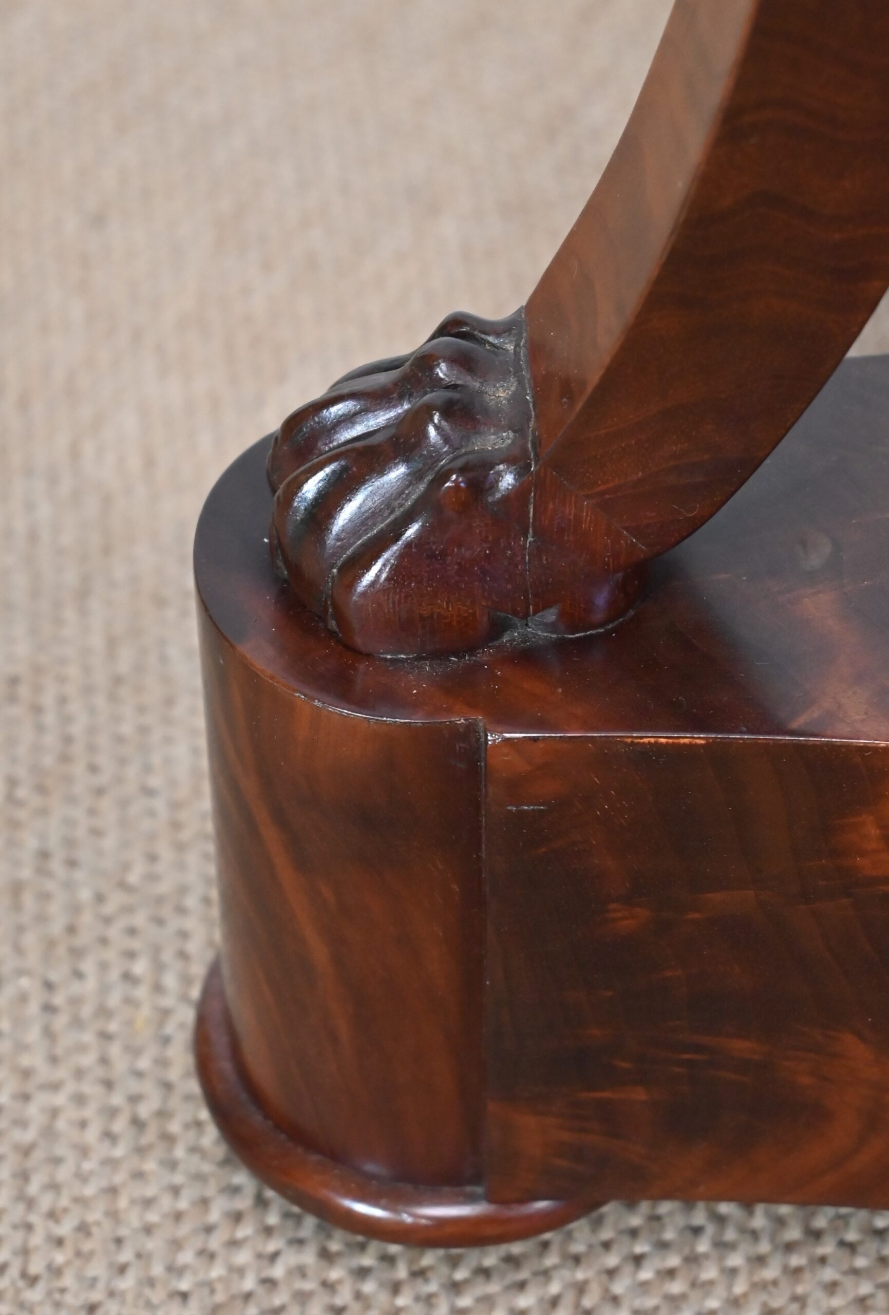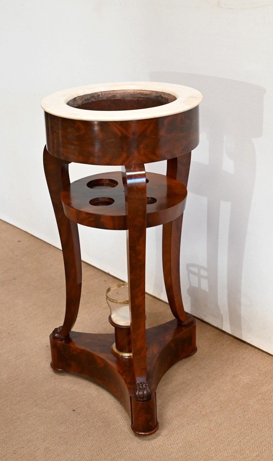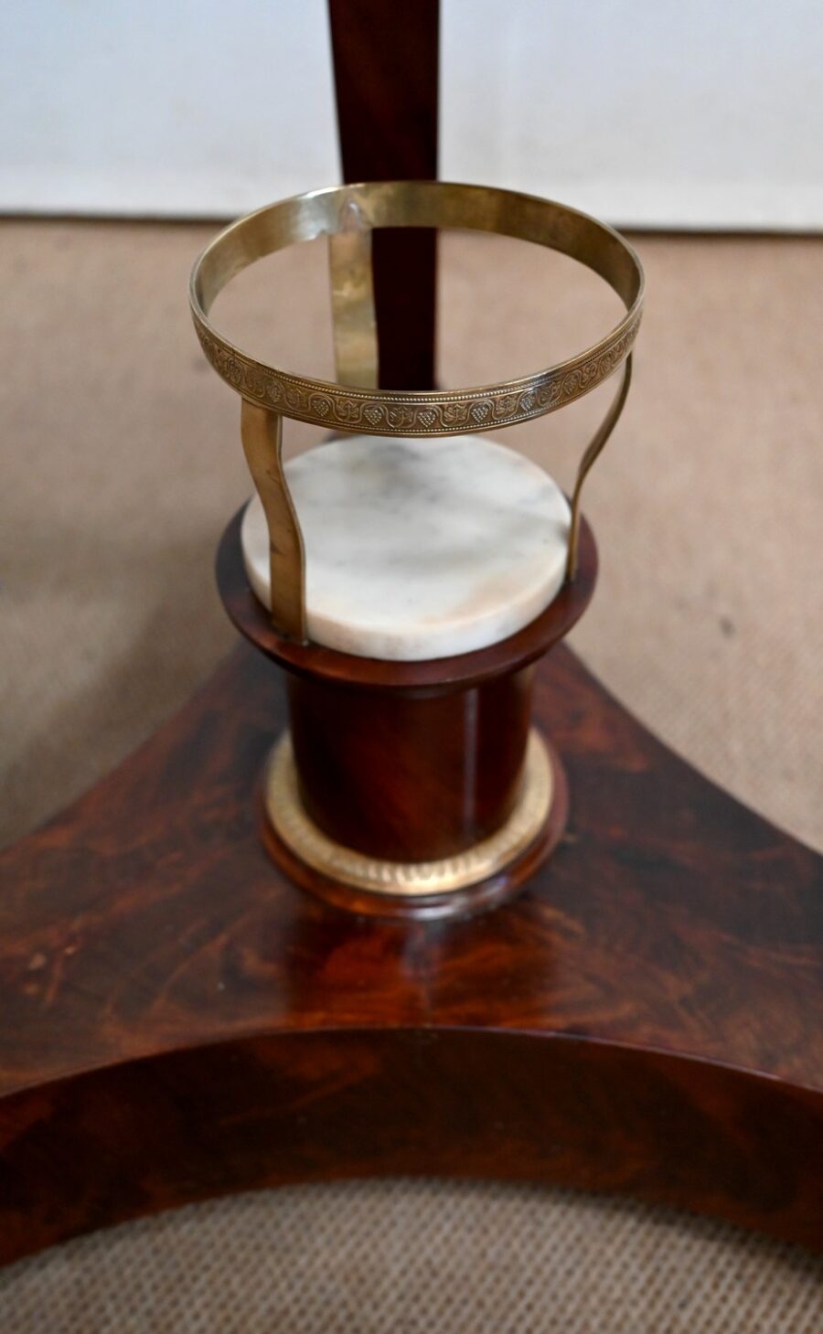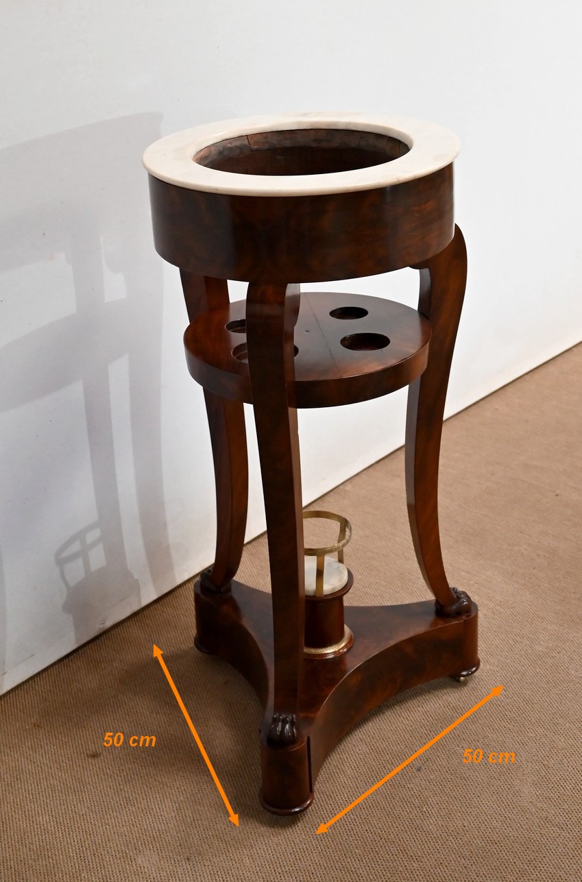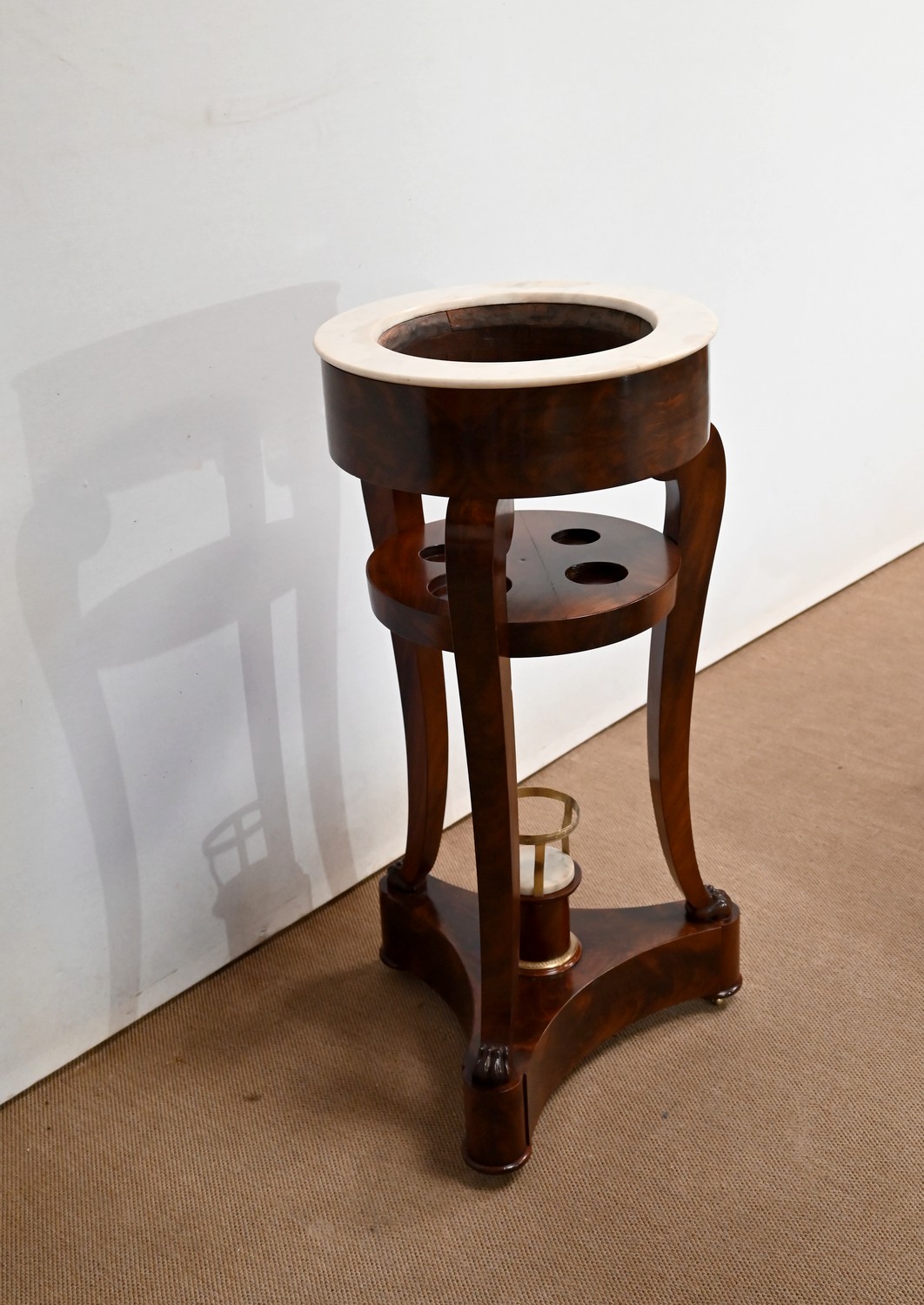 L’ensemble repose sur trois pieds légèrement galbés, s’affinant vers le bas, se finissant par des griffes de lion. Ceux-ci reposent sur un socle en hélice en placage de ronce d’acajou, sur roulettes. Un élément cylindrique dont la base a une bague en laiton ciselé, de motifs Empire y est disposé. Son dessus possède un marbre, surmonté d’un élément également en laiton, servant sans doute, à y poser une réserve d’eau.
