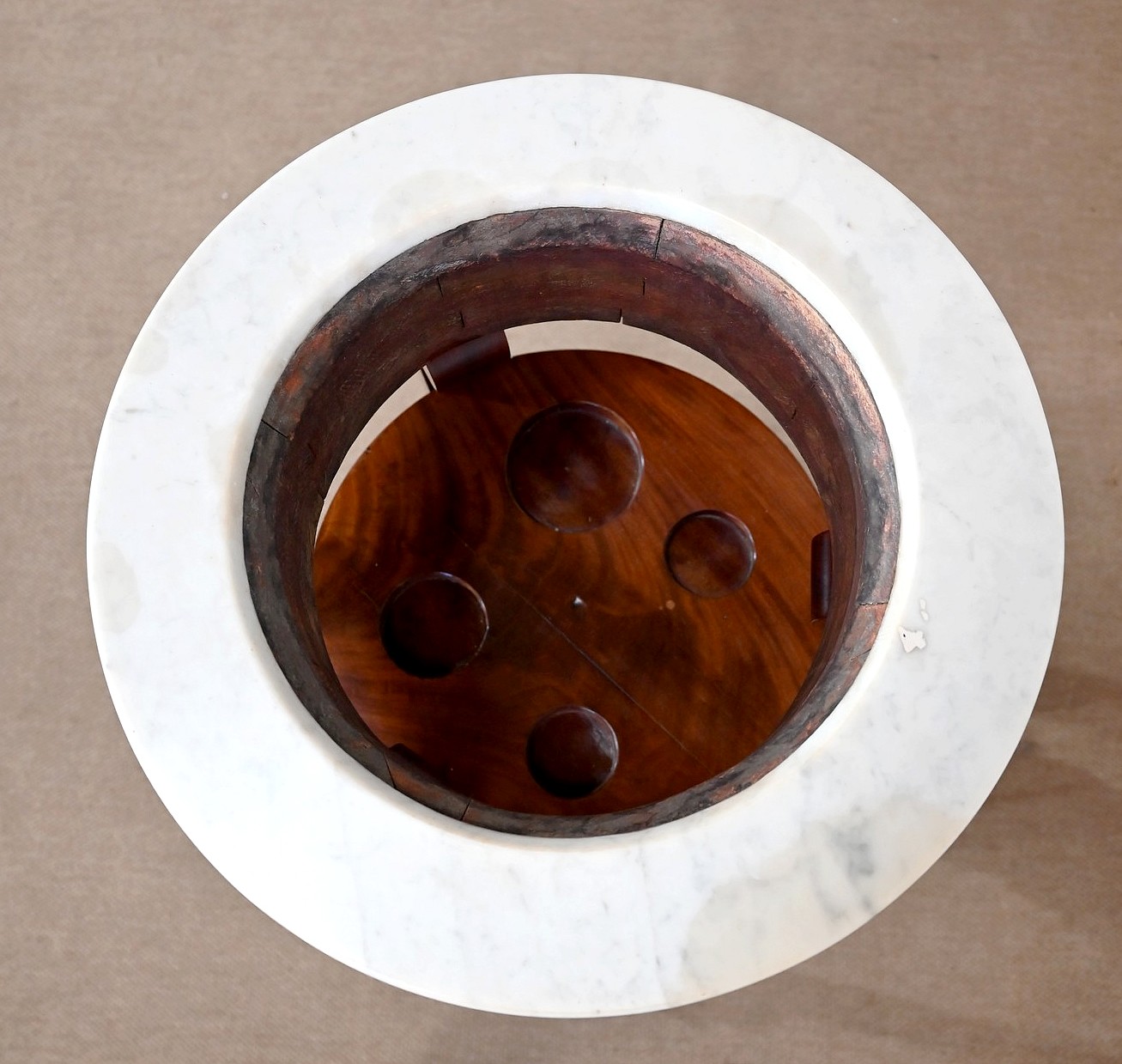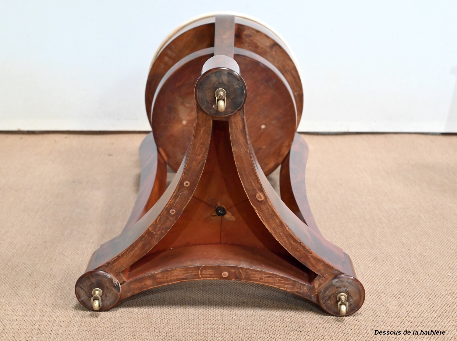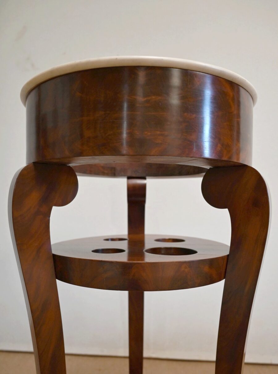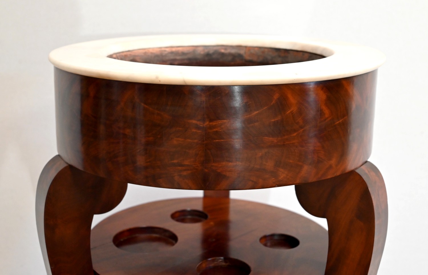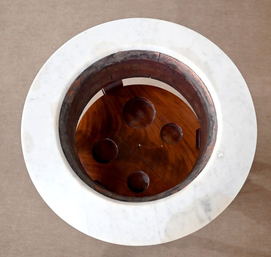 Barbière d’homme, ronde, en placage de ronce d’acajou, composée d’une importante ceinture, dont le pourtour est recouvert d’un marbre de carrare veiné blanc.