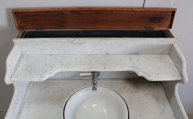 La partie haute en marbre est découpée et moulurée à bec de corbin et agrémentée d’une vasque basculante signée ‘L’hygiène moderne, Lavabos, salles de bains, Paris, Déposé’. Un robinet dont le manche est en céramique permet de disposer de l’eau contenue dans le réservoir en zinc situé à l’arrière.