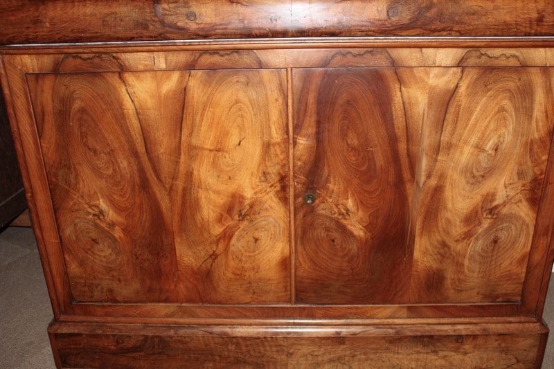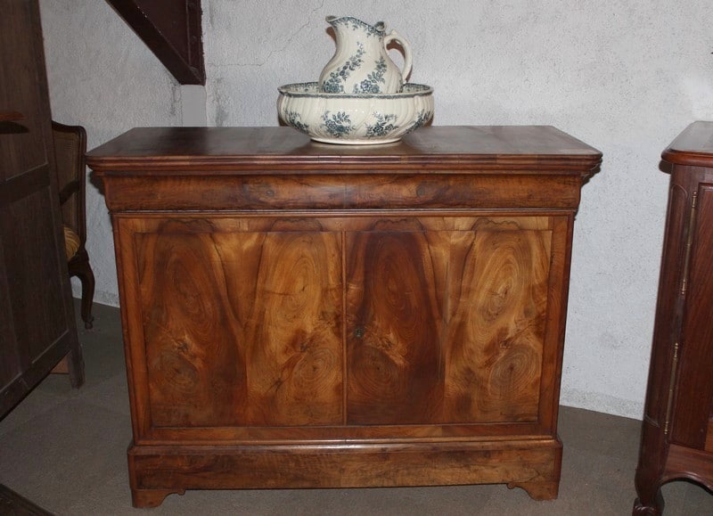 Meuble de toilette Louis-Philippe en placage de noyer. Il ouvre sur le dessus laissant apparaître un marbre et un miroir et par 2 portes et 1 tiroir dans la plinthe. L’intérieur est composé de 3 tiroirs et 1 étagère. Très beau ramage du bois aux teintes lumineuses. Époque : seconde moitié du XIXe (1860). Parfait état et finition uniquement cirée.