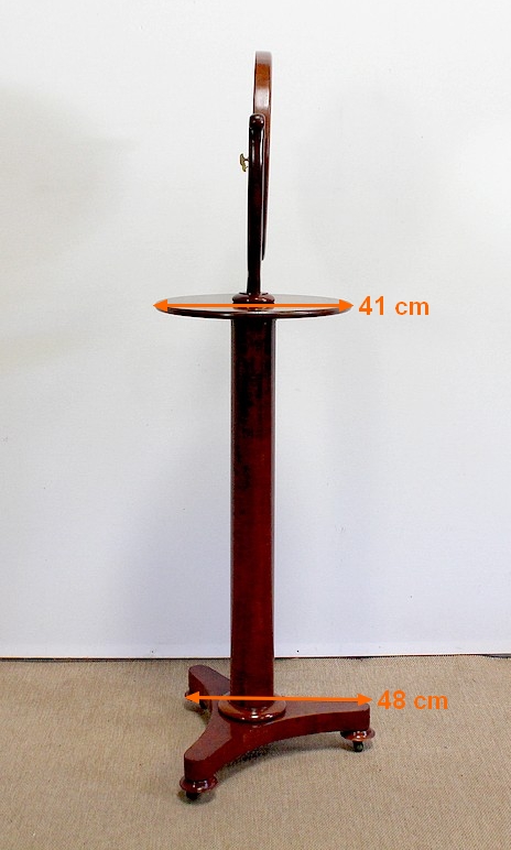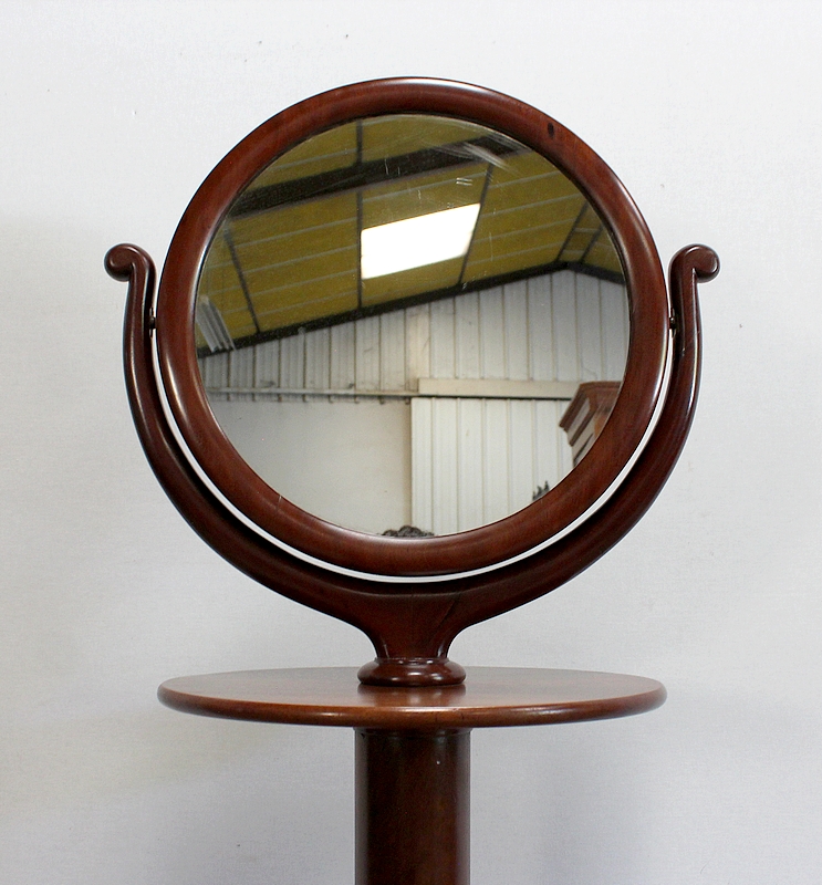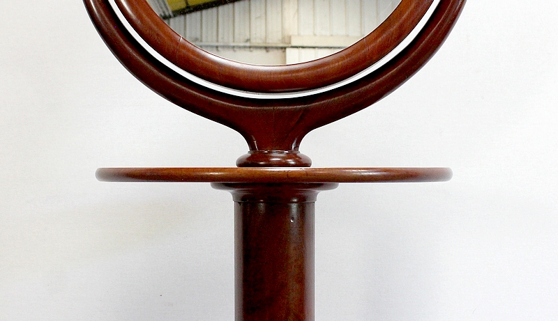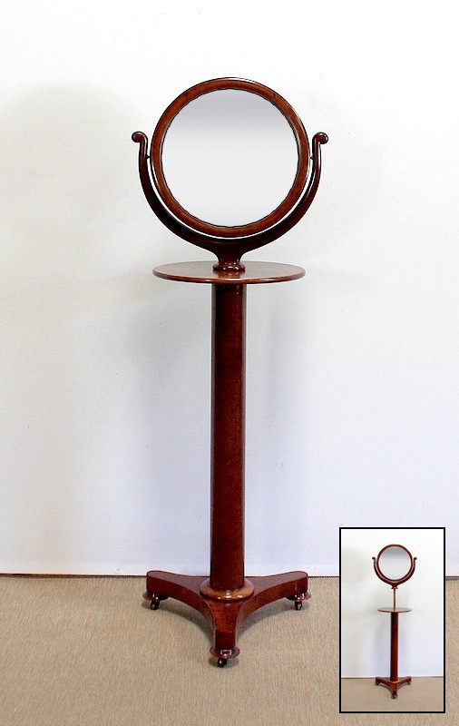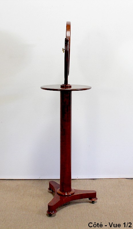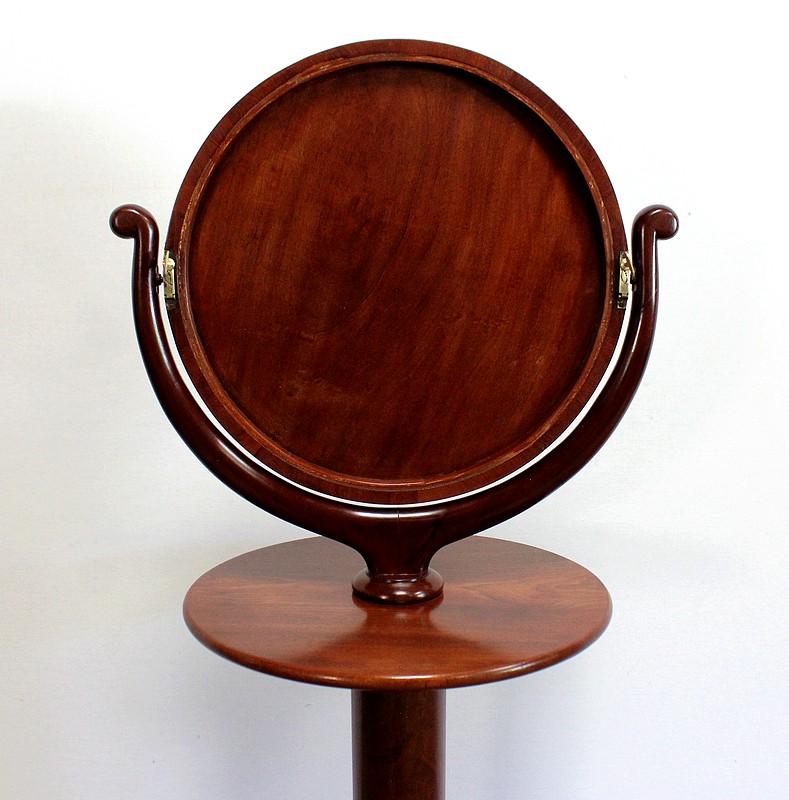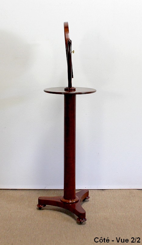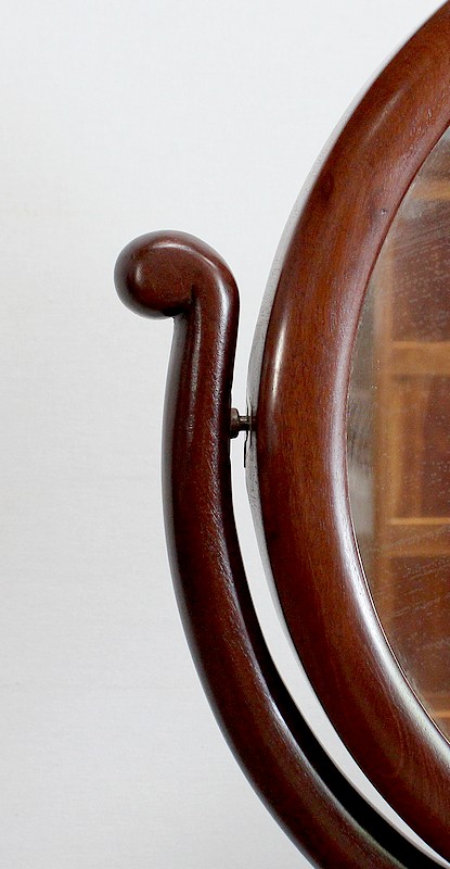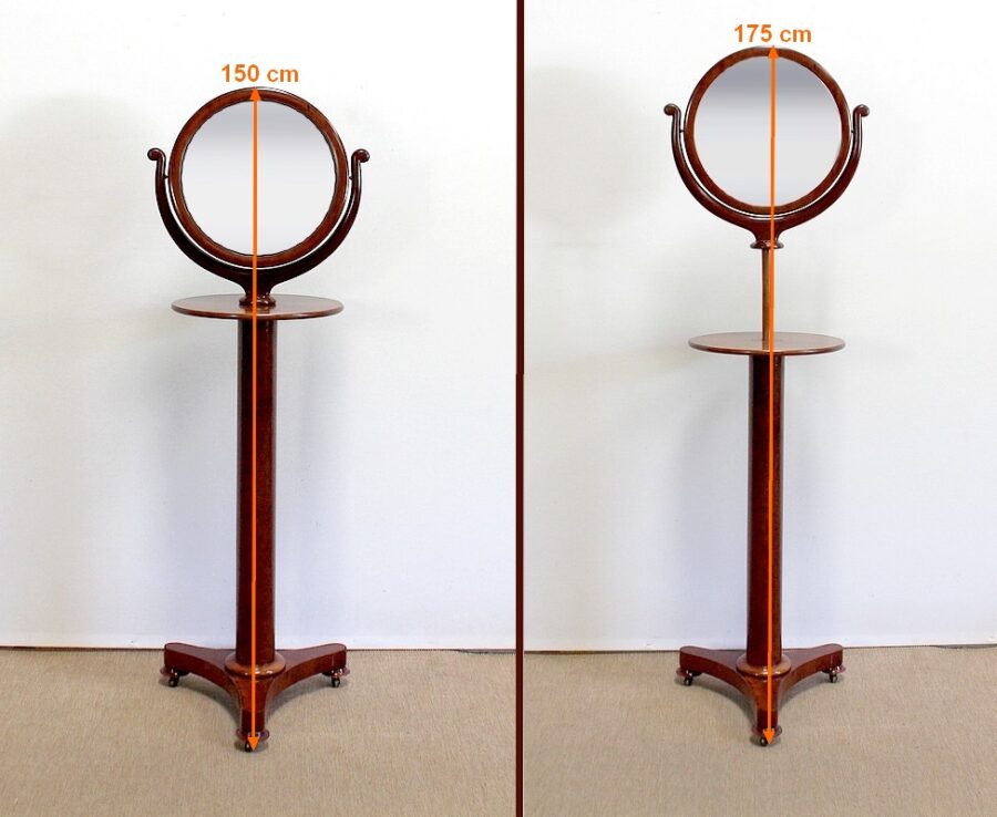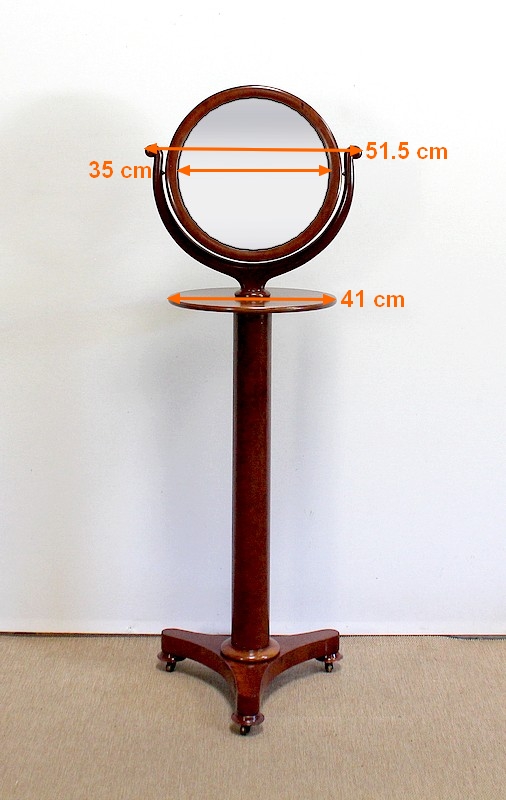 Bel ensemble en Acajou de Cuba massif et en placage d’Acajou muni d’un miroir au mercure basculant, entouré d’un élément de bois arrondi, façonné en demi-cercle et se terminant par des volutes. Des vis »Papillon » agrémentent la partie arrière pour faciliter l’orientation de la glace.