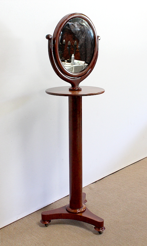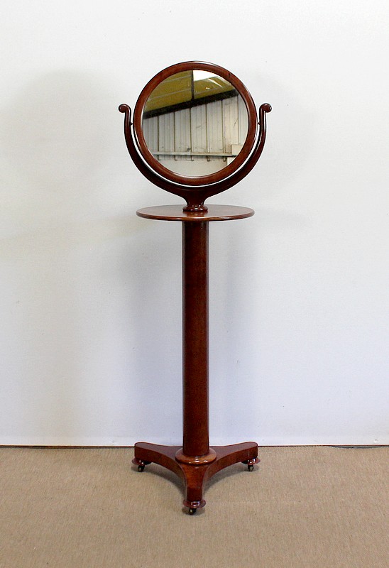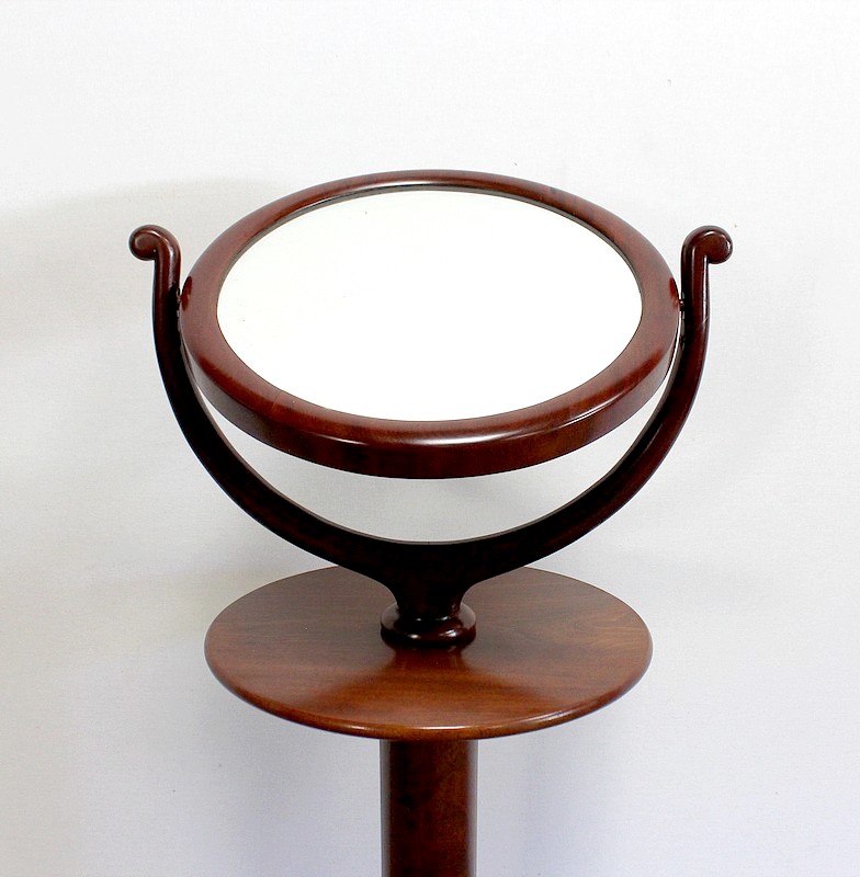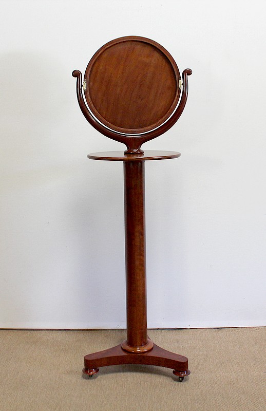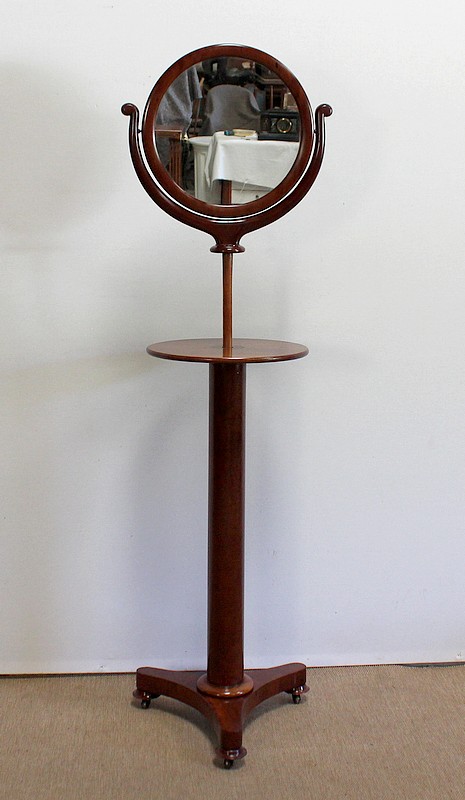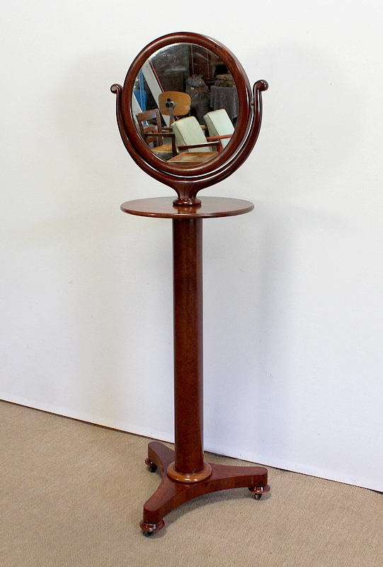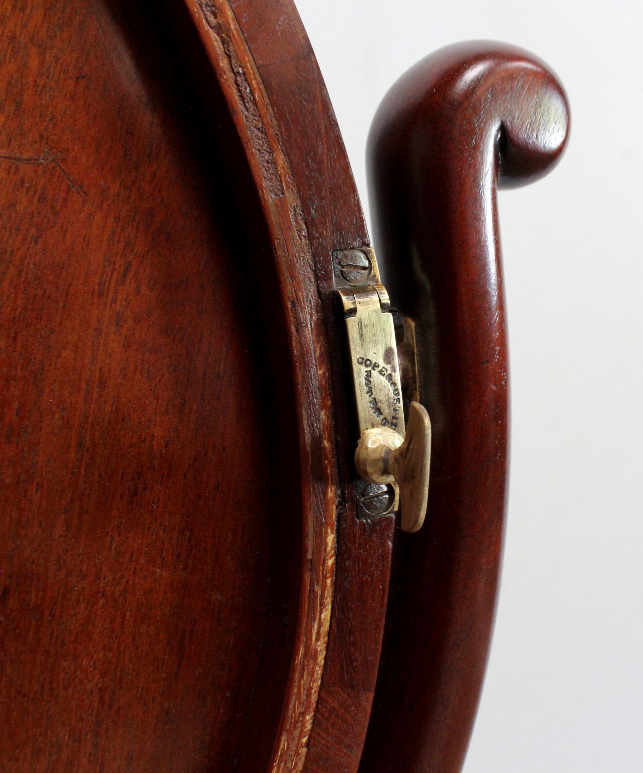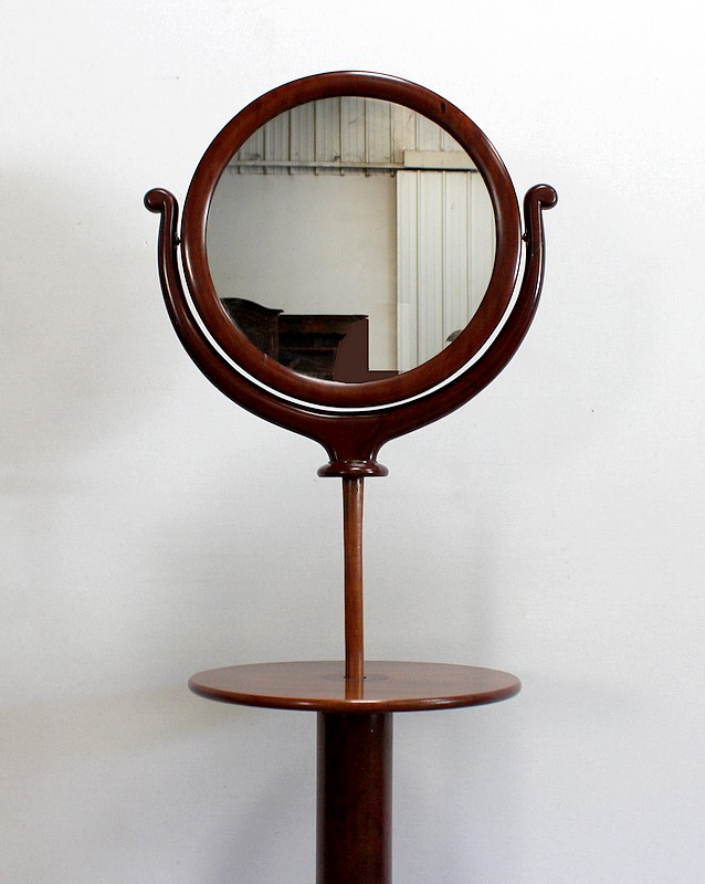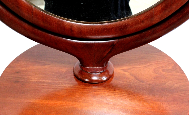 Bel ensemble en Acajou de Cuba massif et en placage d’Acajou muni d’un miroir au mercure basculant, entouré d’un élément de bois arrondi, façonné en demi-cercle et se terminant par des volutes. Des vis »Papillon » agrémentent la partie arrière pour faciliter l’orientation de la glace.