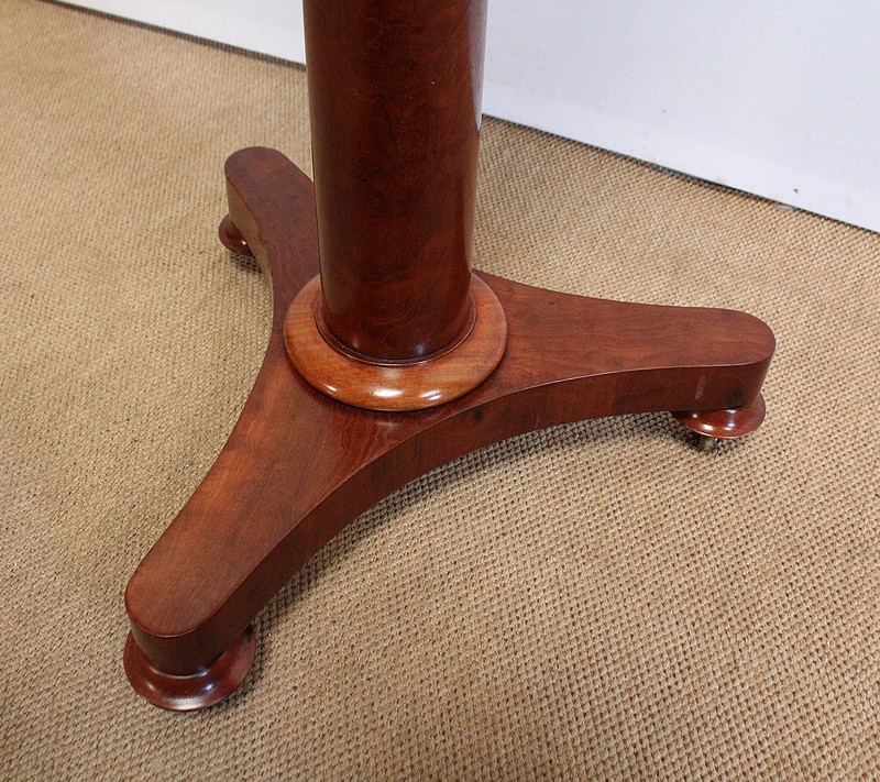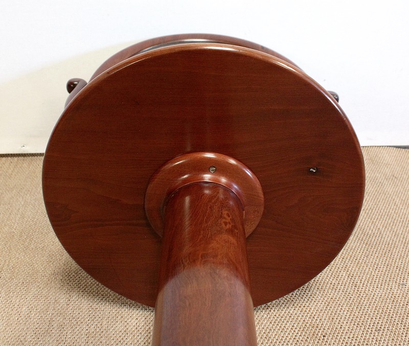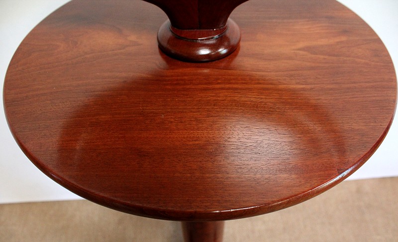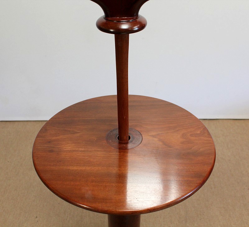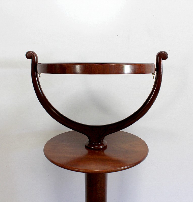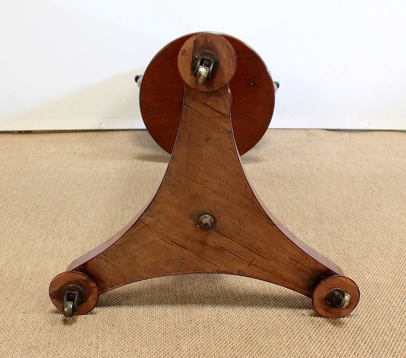 Au dessus de celui-ci nous retrouvons une tablette circulaire en acajou de cuba. En partie basse, une collerette surmonte un socle tripode aux formes concaves possédant des roulettes.