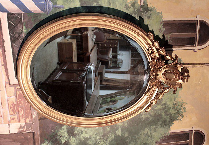 Glace ovale, entourage en bois doré, de style Louis XVI. Miroir biseauté. Époque : seconde moitié du XIXe