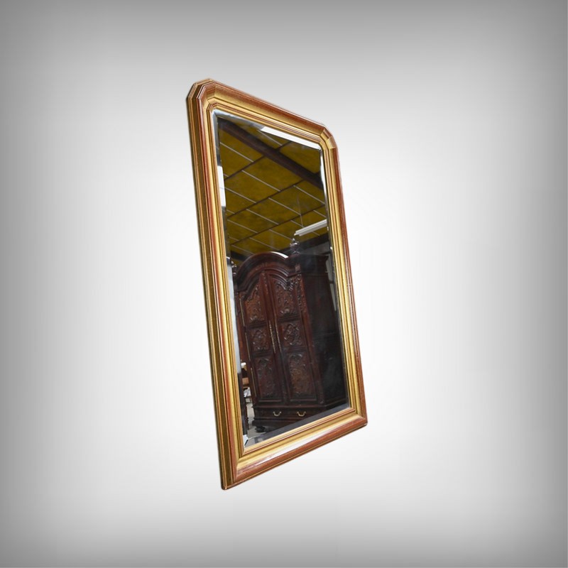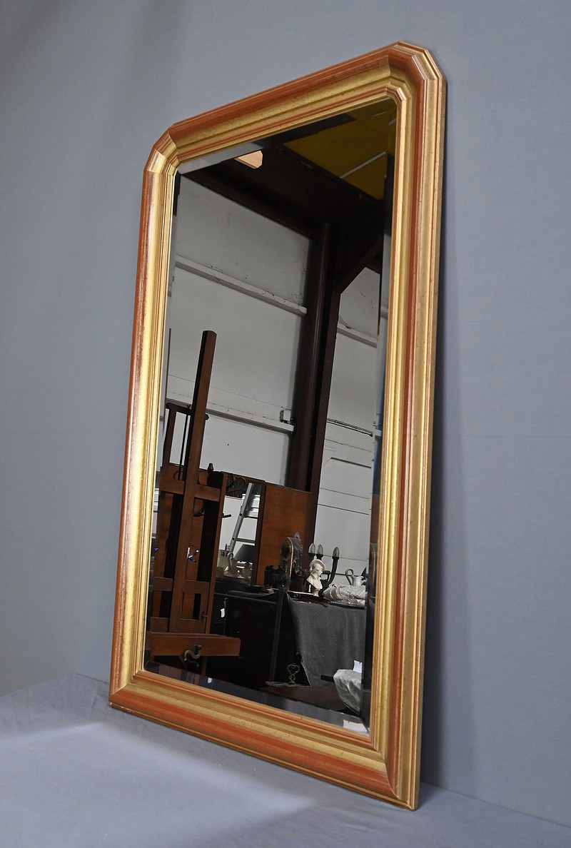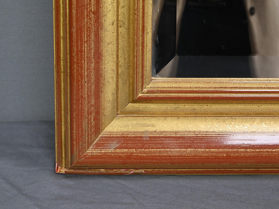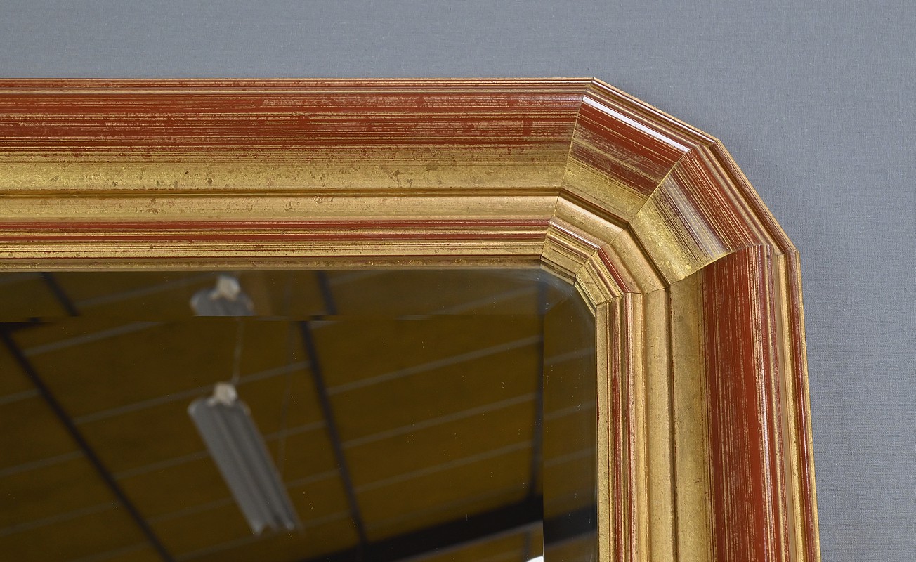 Ce grand miroir biseauté attire immédiatement le regard par son cadre doré nuancé de teintes rouges, qui lui confère une allure classique et élégante. Ses angles supérieurs sont coupés créant un contraste géométrique subtil qui accentue son caractère décoratif. Cette glace ne se contentera pas d’agrandir visuellement la pièce : Elle sera idéalement disposée dans un intérieur au style néo-classique où il pourra jouer à la fois un rôle fonctionnel et esthétique.