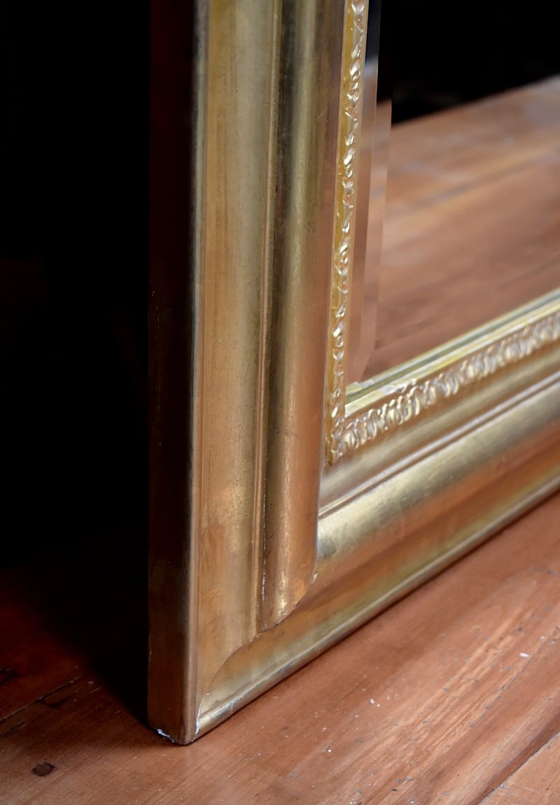 Grand miroir au mercure de style Transition en bois doré avec glace biseautée.