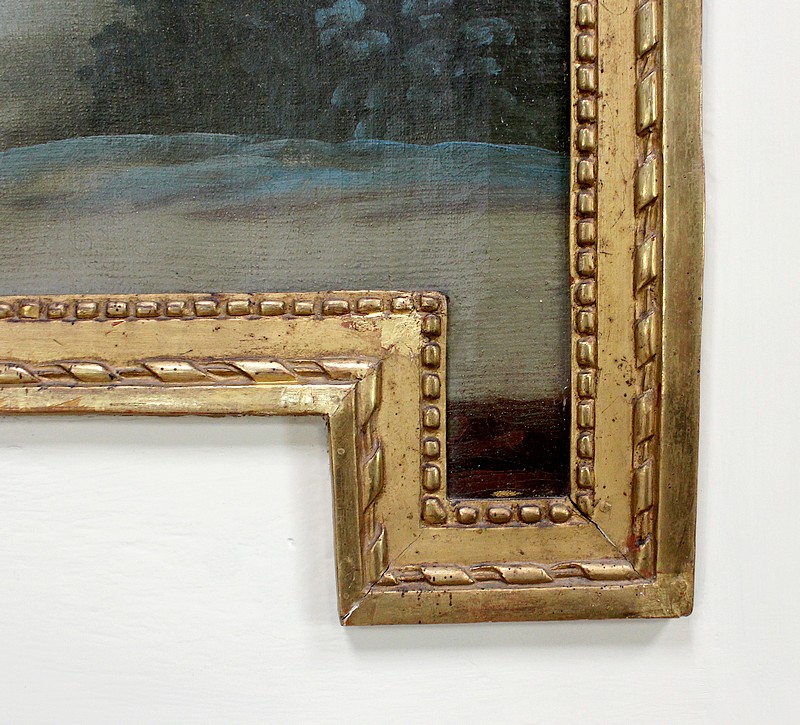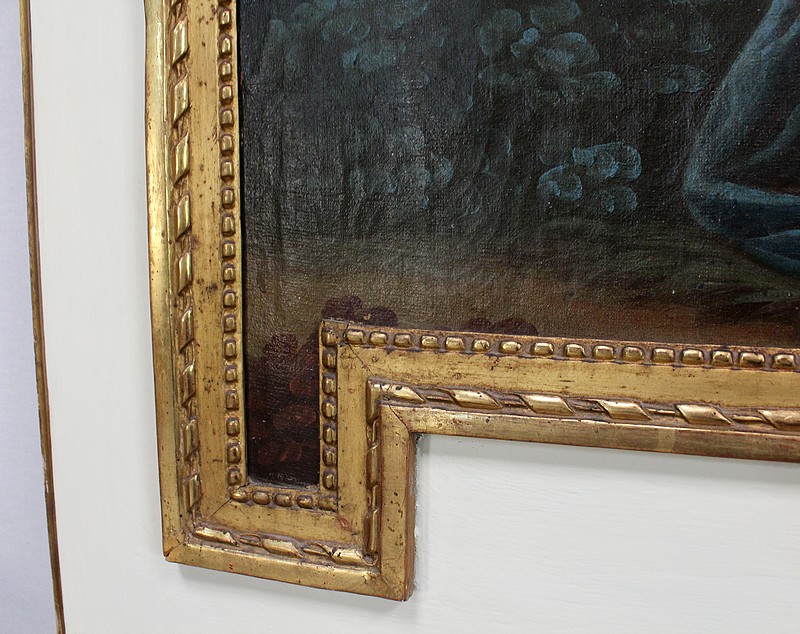Cette peinture est encadrée d’une moulure sculptée et dorée à l’or fin, plus fine que la partie inférieure. Celle-ci présente une guirlande de perles et une frise enrubannée. Ce cadre à coins grecs est sommé de deux cabochons en partie haute.