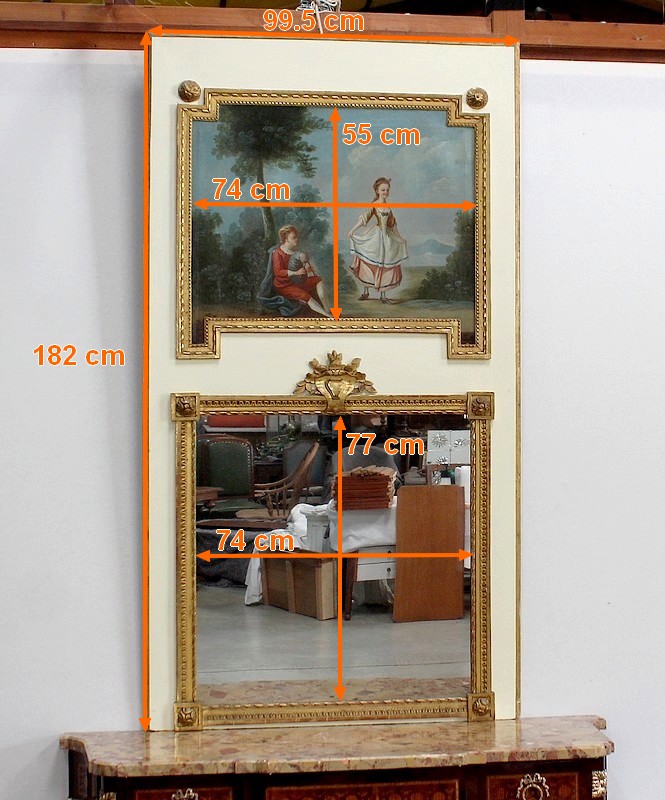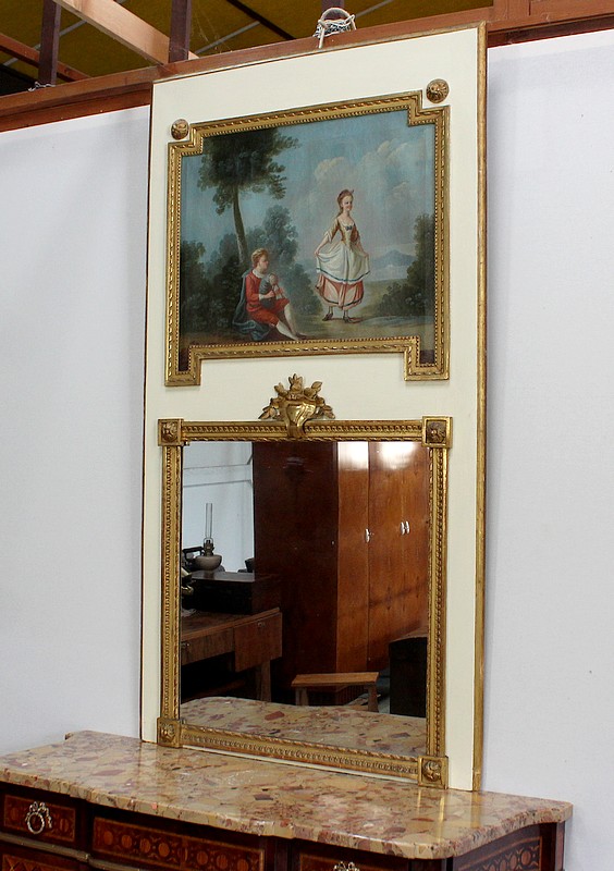 Grand miroir trumeau sur fond bois de couleur crème composé d’une glace au mercure sommée d’une peinture sur toile, dans le style Louis XVI.