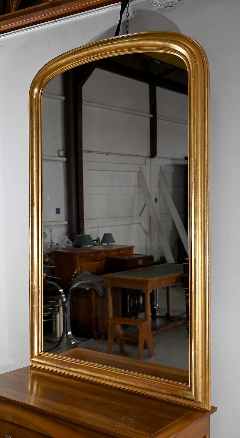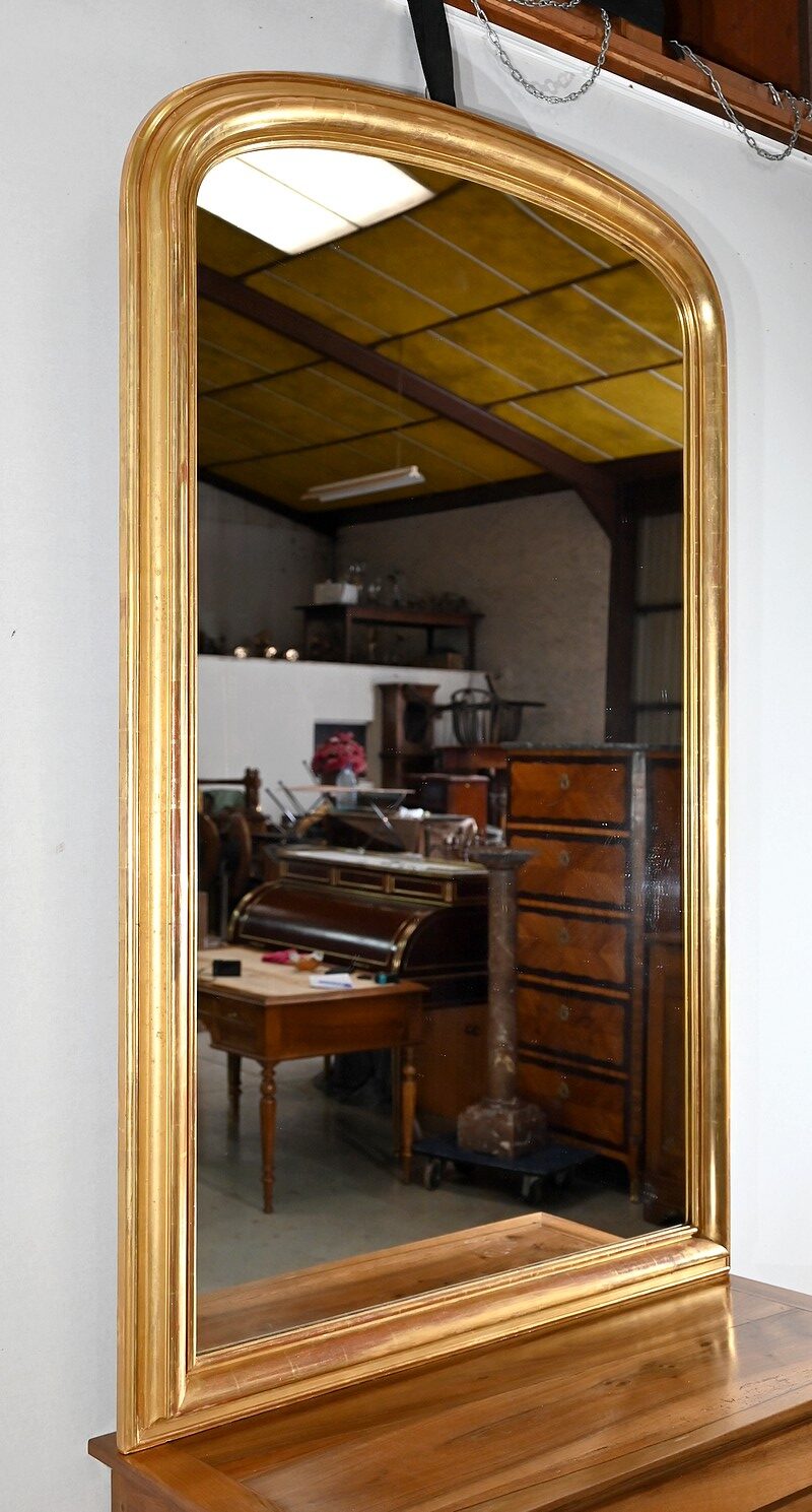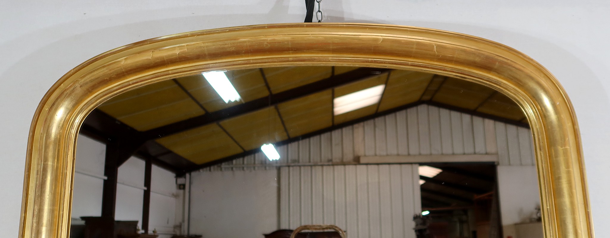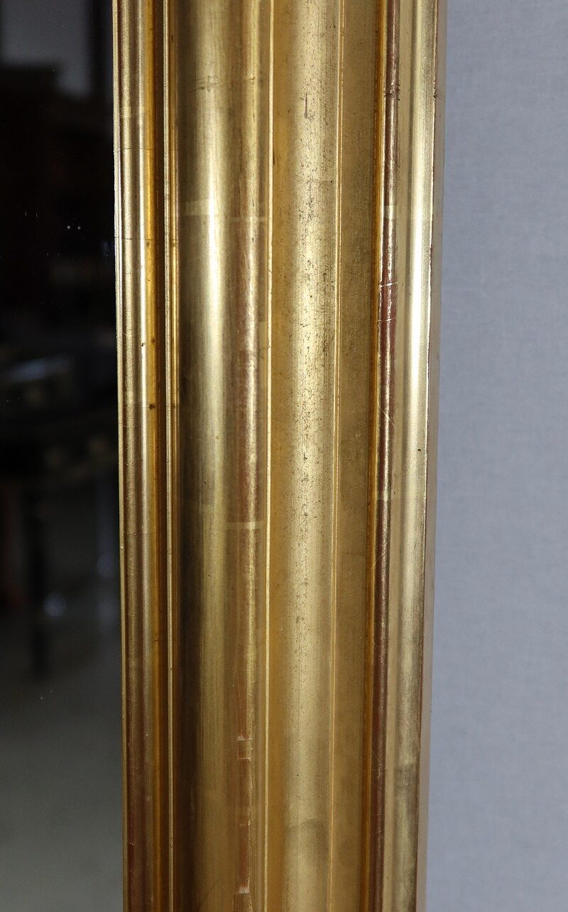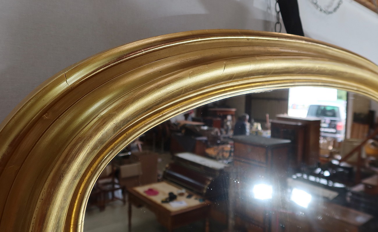 Grand miroir avec encadrement en bois doré à la feuille, arrondi en partie haute. Cet entourage est enjolivé d’une moulure centrale prédominante, et de plus modestes sur l’intérieur et l’extérieur.