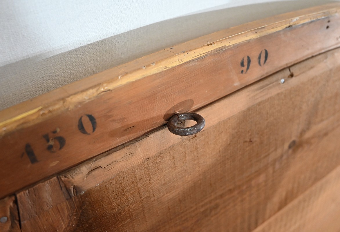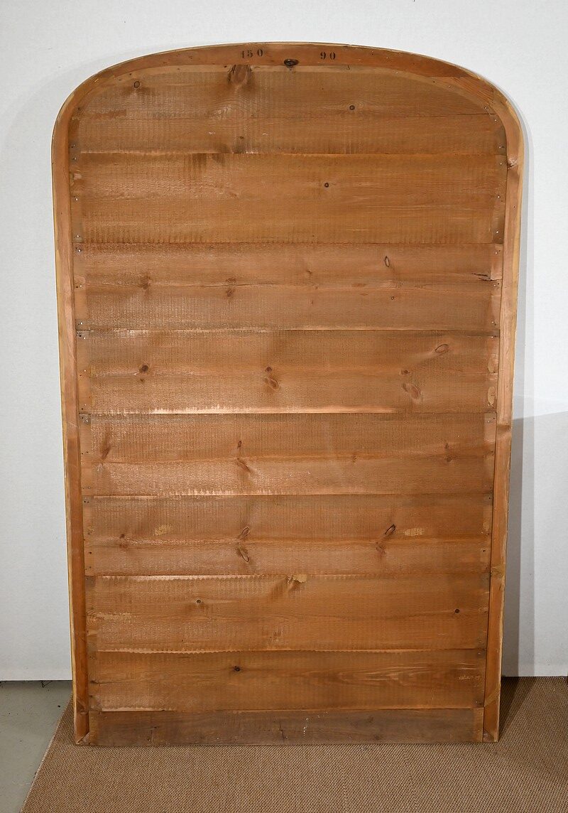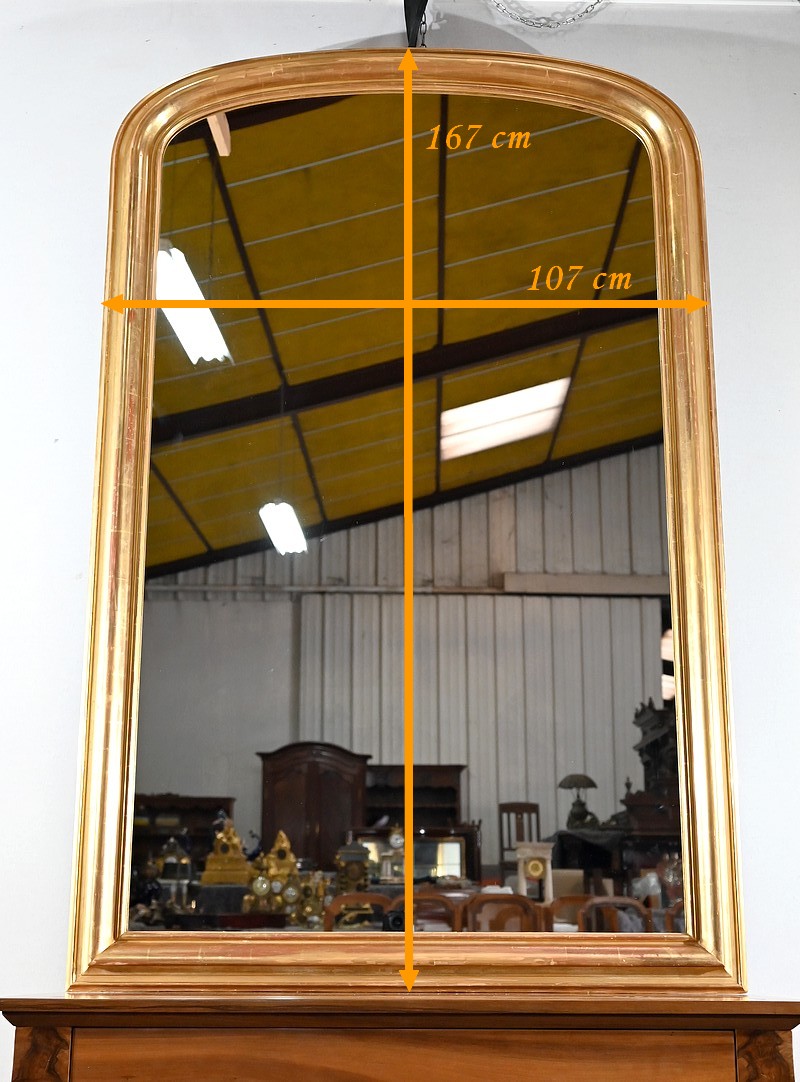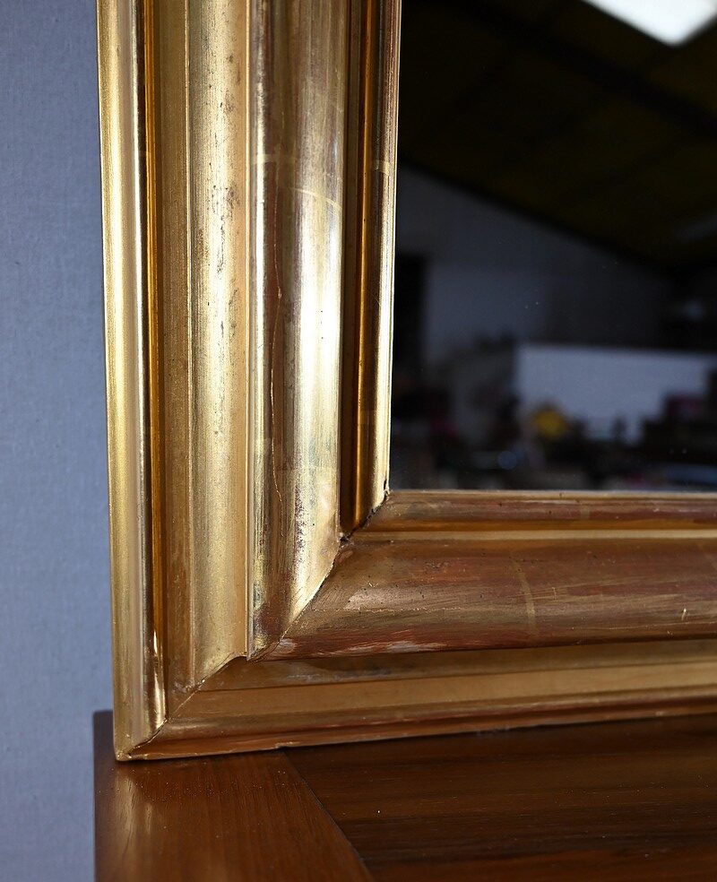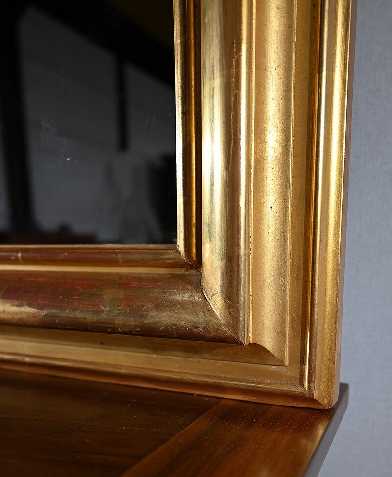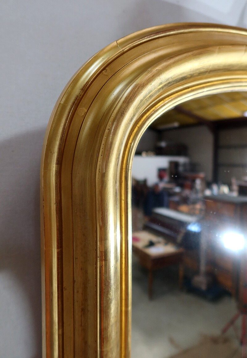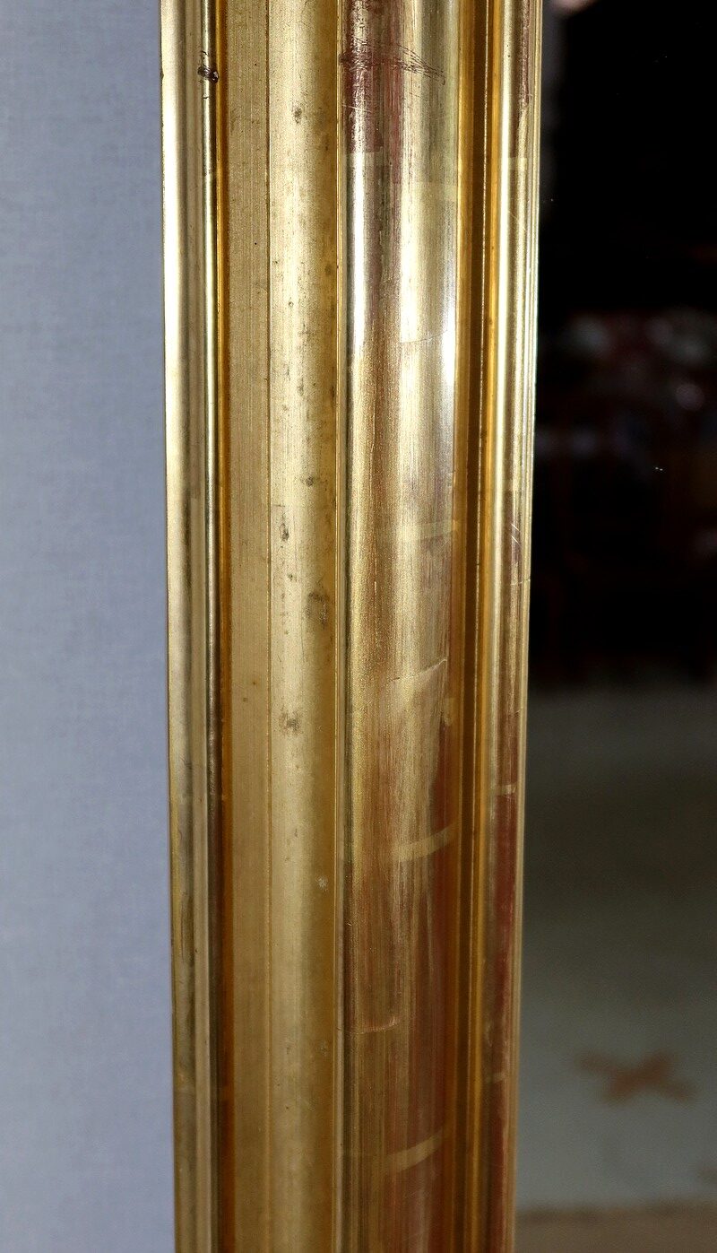 Grand miroir avec encadrement en bois doré à la feuille, arrondi en partie haute. Cet entourage est enjolivé d’une moulure centrale prédominante, et de plus modestes sur l’intérieur et l’extérieur.