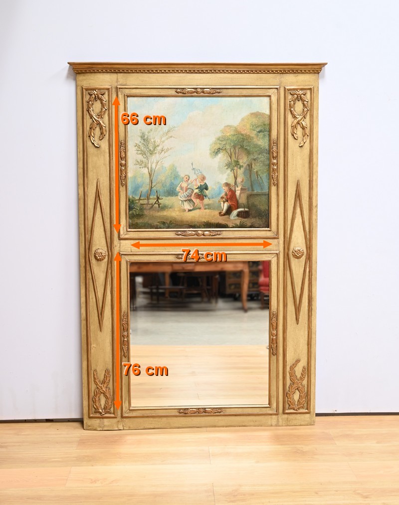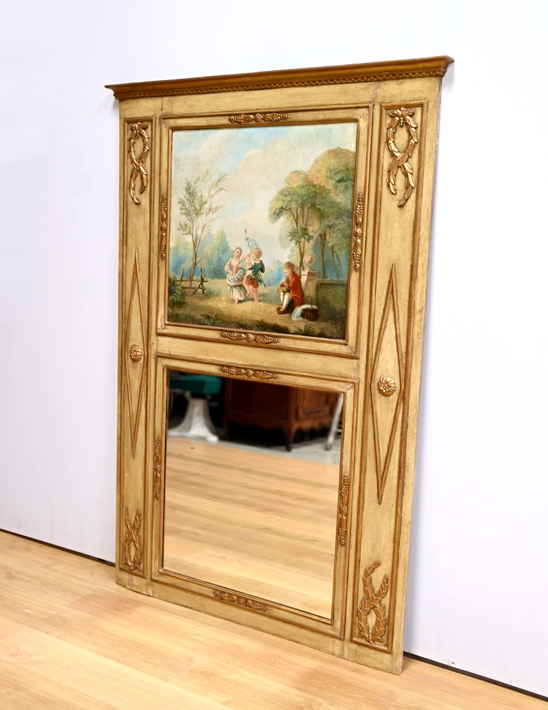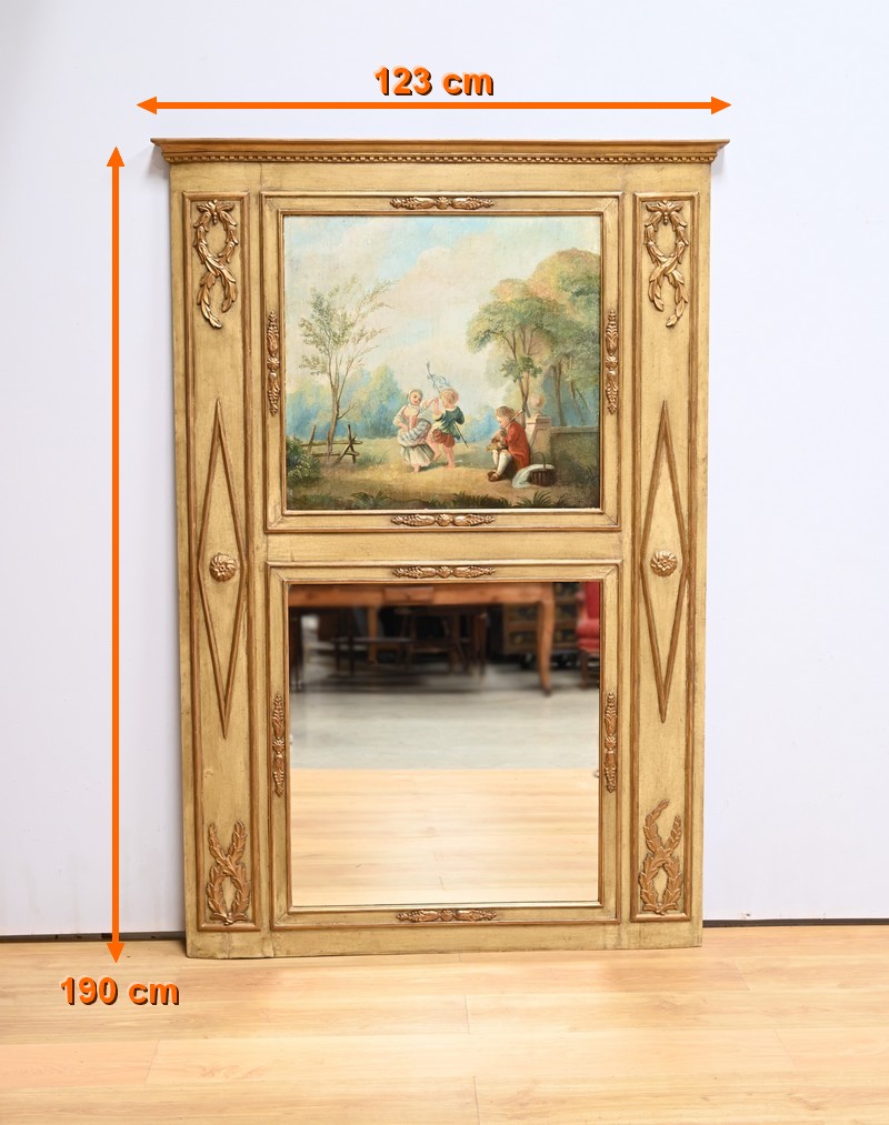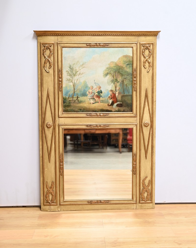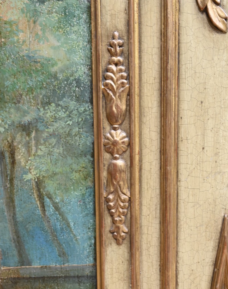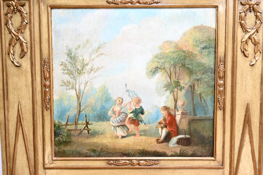 Cet important trumeau en bois laqué, couleur crème avec moulures dorées, arbore une peinture à l’huile sur bois de musiciens et danseurs dans un décor champêtre.