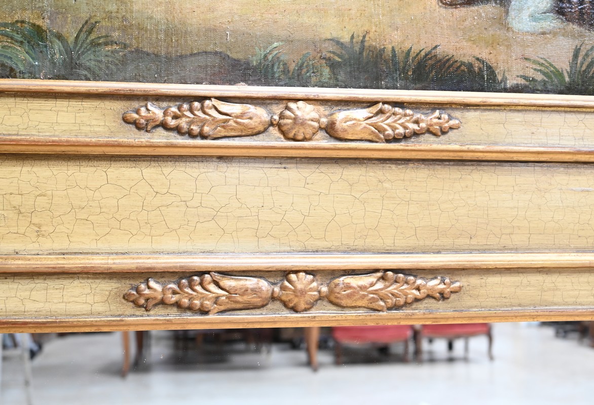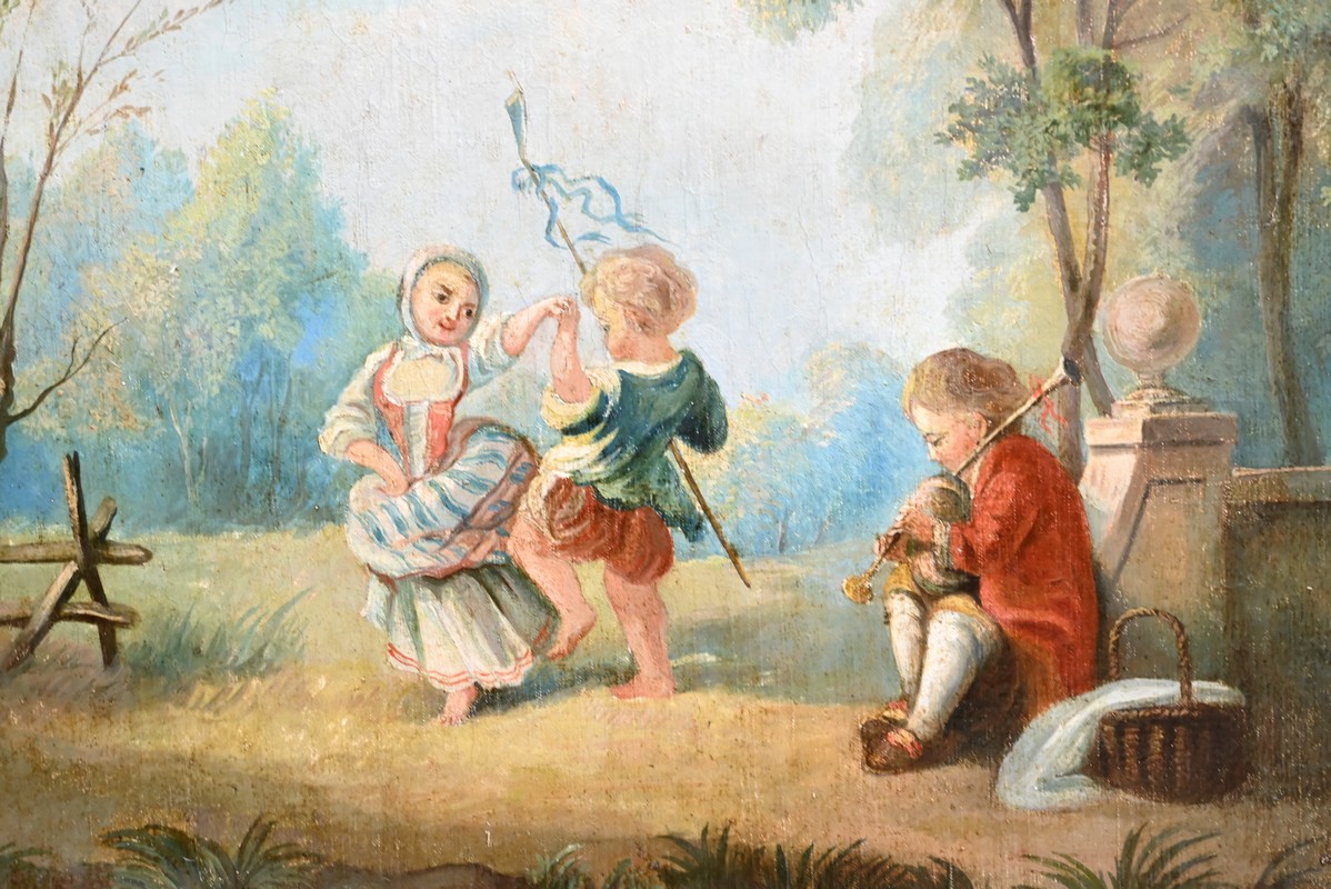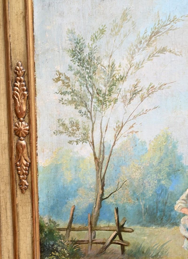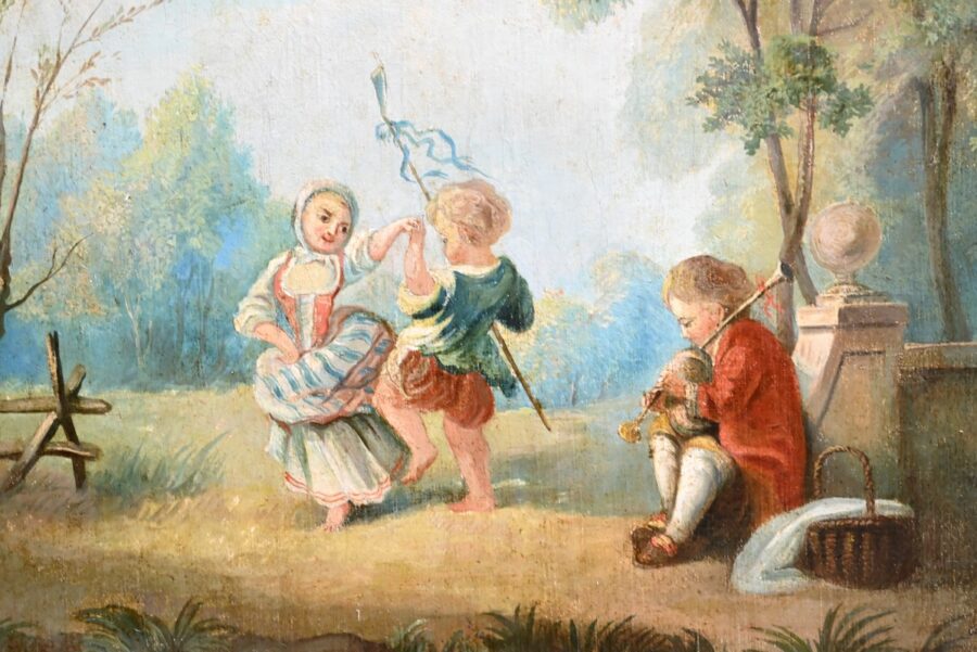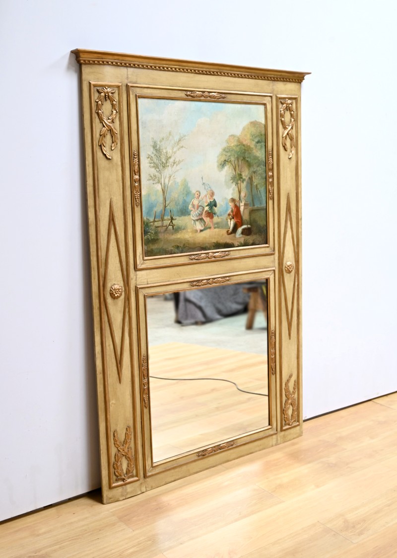 Cet important trumeau en bois laqué, couleur crème avec moulures dorées, arbore une peinture à l’huile sur bois de musiciens et danseurs dans un décor champêtre.