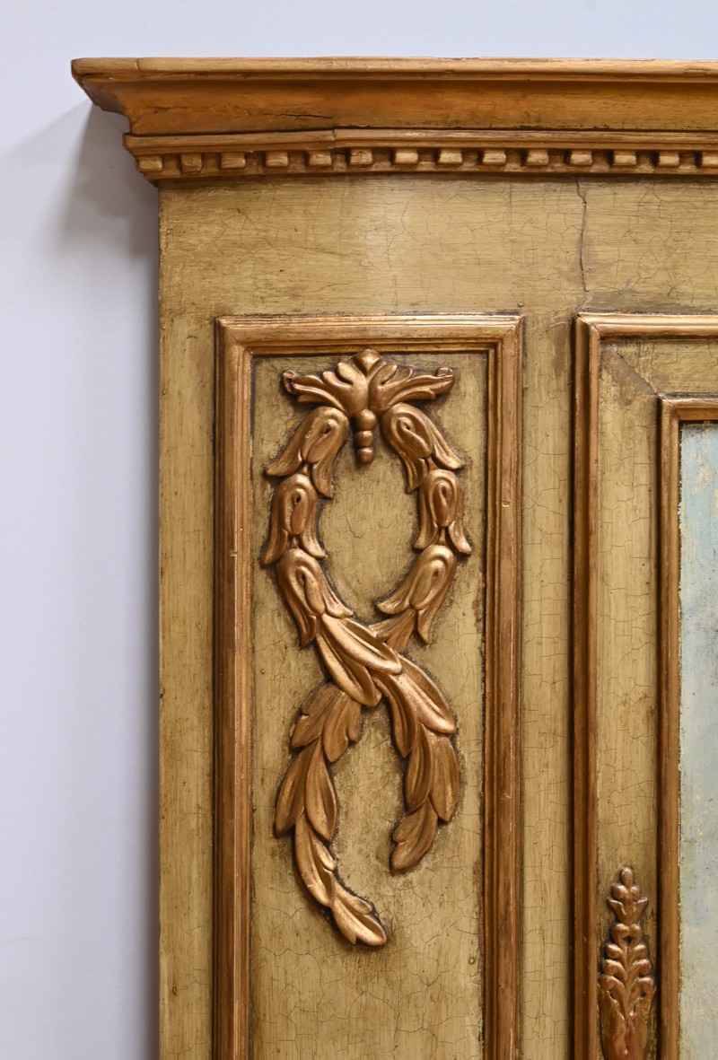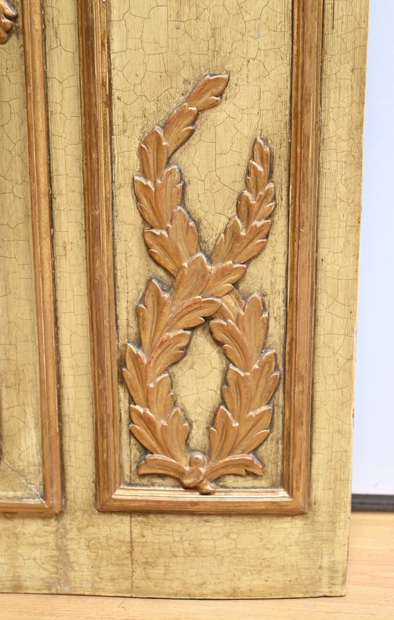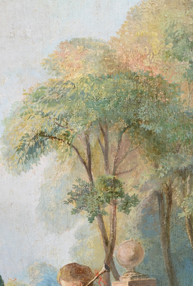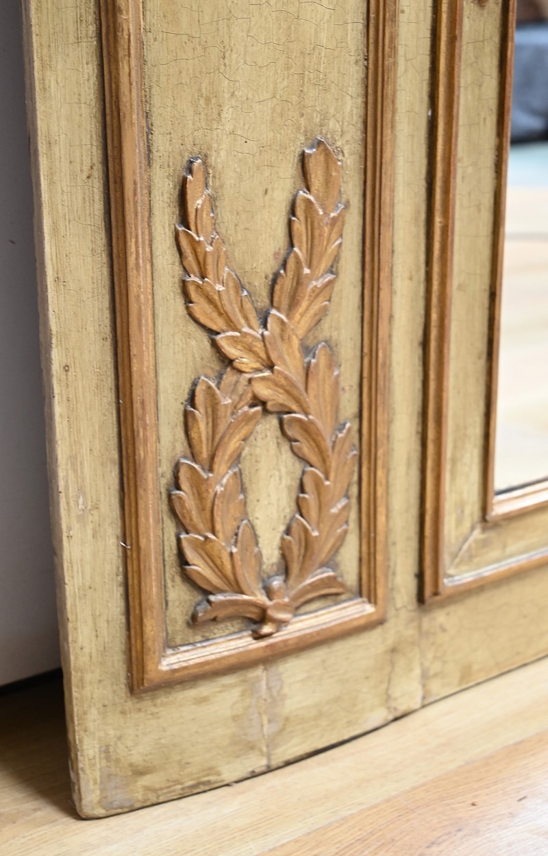 Cet important trumeau en bois laqué, couleur crème avec moulures dorées, arbore une peinture à l’huile sur bois de musiciens et danseurs dans un décor champêtre.