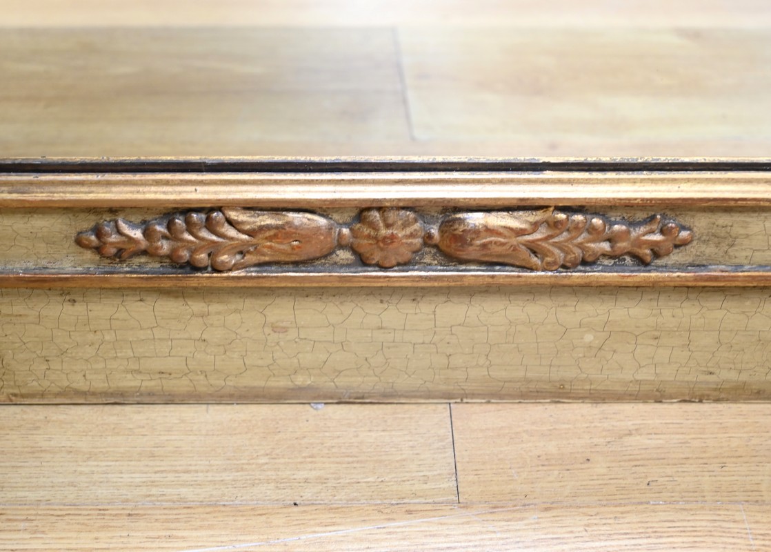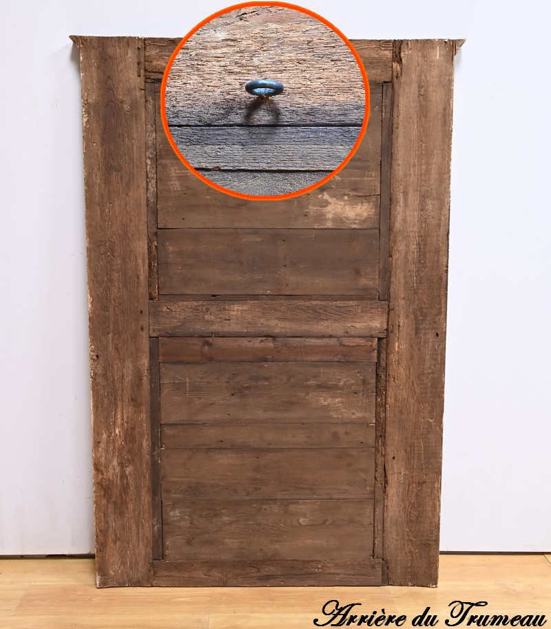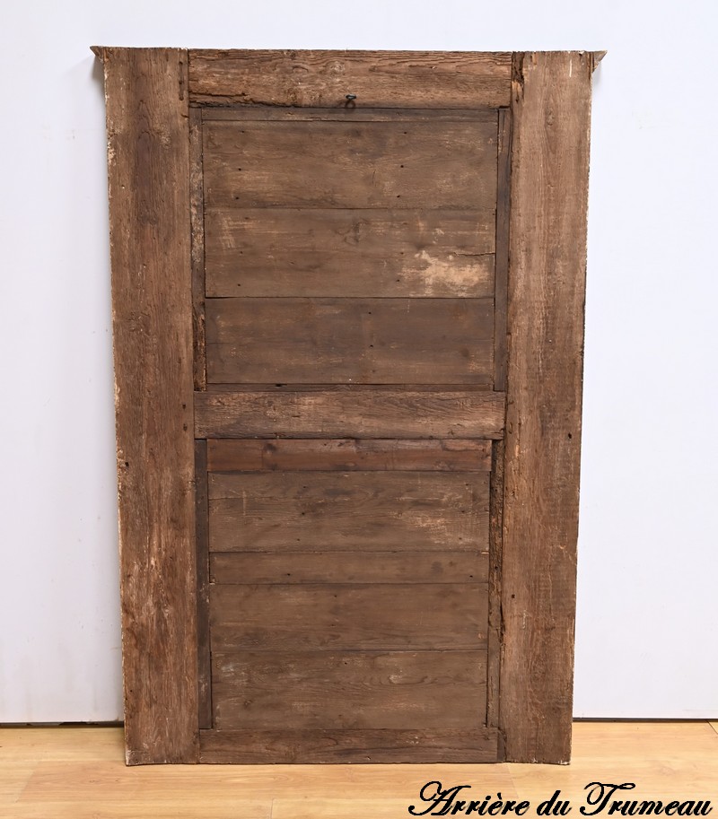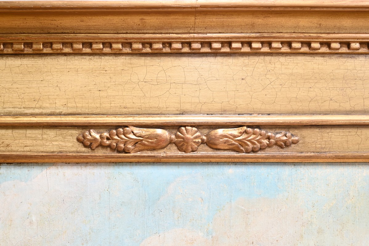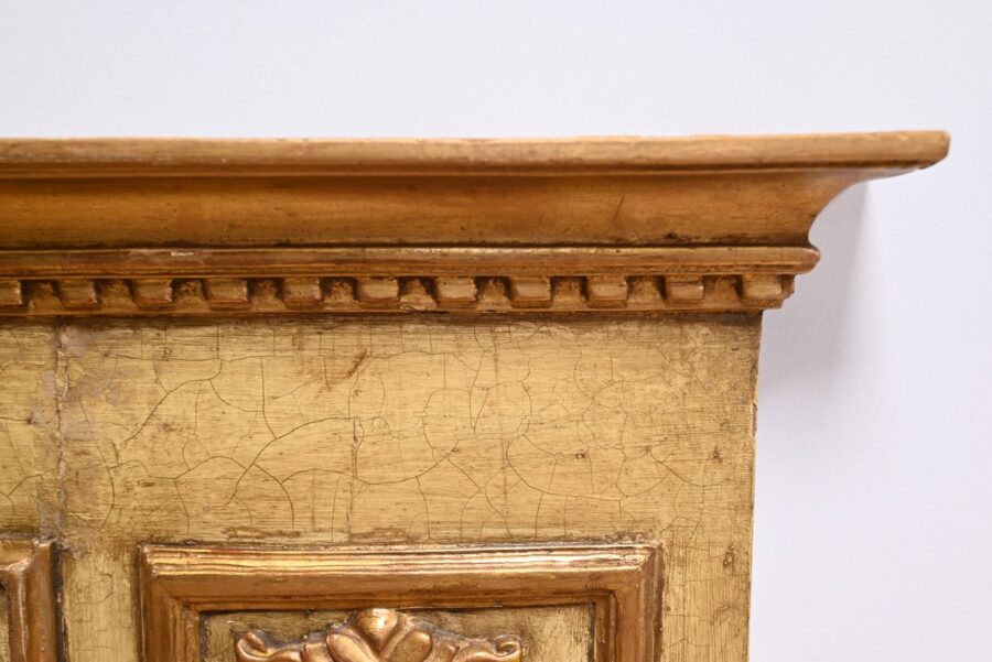 Richement mouluré, notamment de couronnes d’acanthes et de rosaces, ce trumeau comporte un miroir postérieur en partie basse.