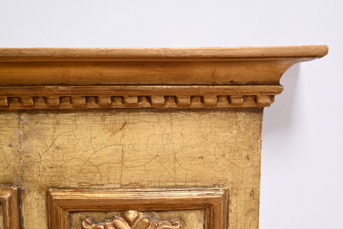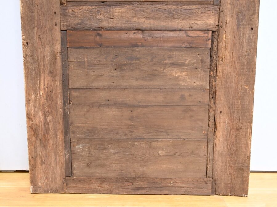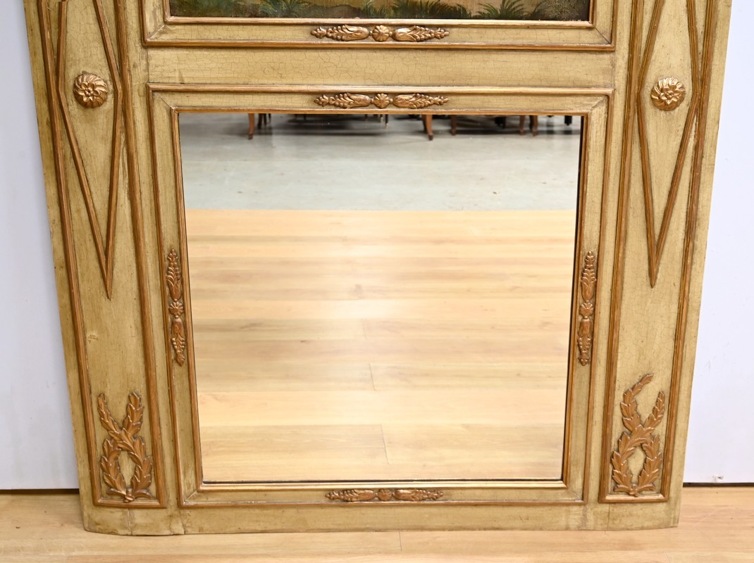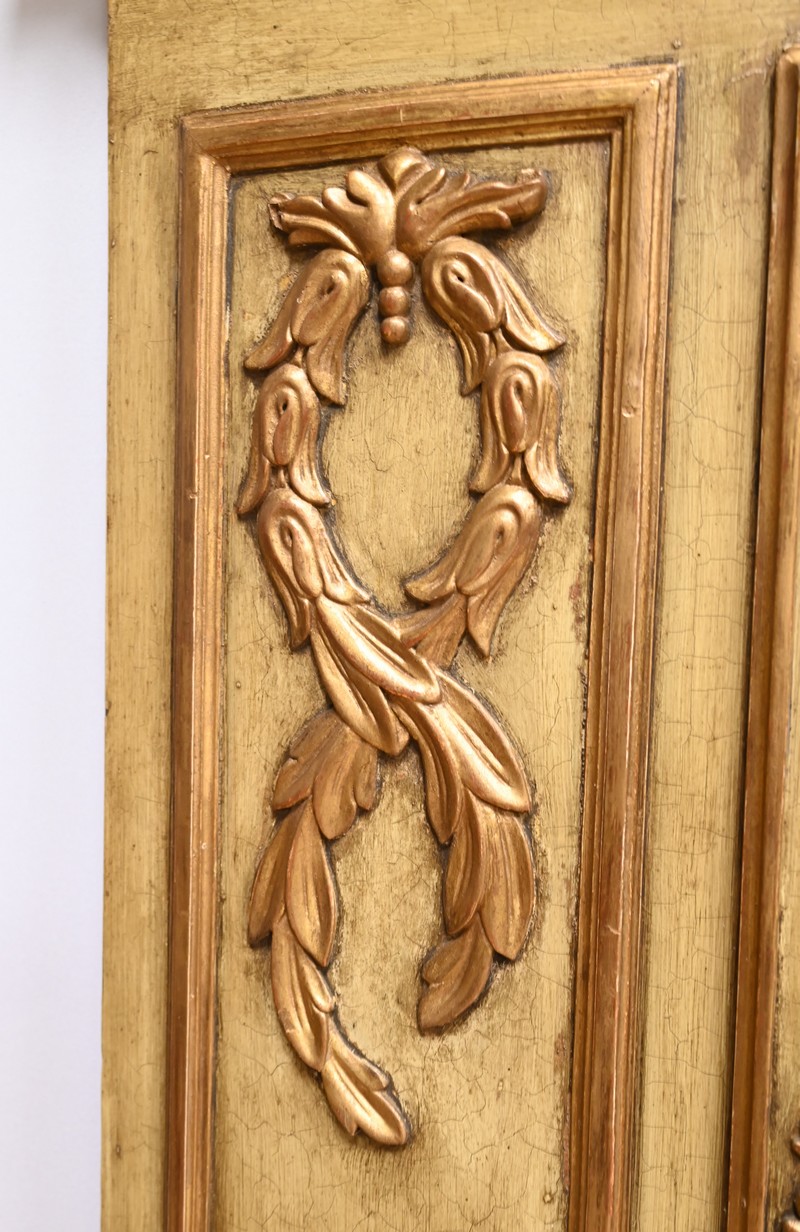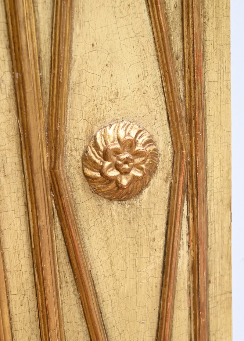 Richement mouluré, notamment de couronnes d’acanthes et de rosaces, ce trumeau comporte un miroir postérieur en partie basse.