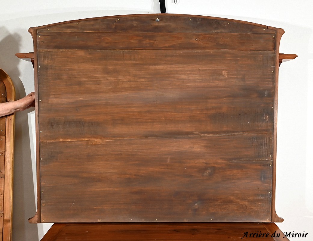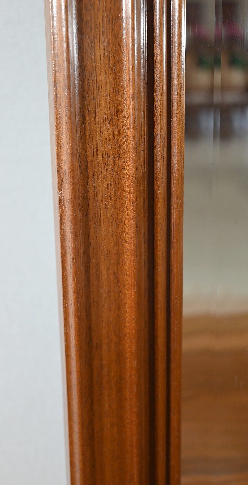 Miroir à encadrement en acajou massif, aux moulures formées par défoncement. La traverse haute est légèrement cintrée, et les quatre angles sont à ressaut.