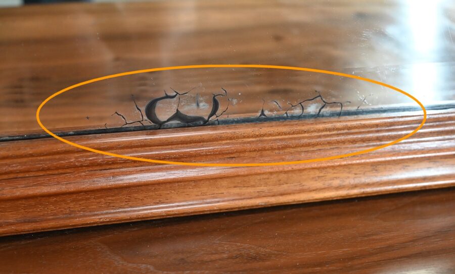 La glace, aux pourtours biseautés et au mercure, est d’origine. De ce fait, elle présente quelques traces d’ancienneté qui n’entravent en rien l’utilisation de ce miroir, mais attestent de son authenticité.