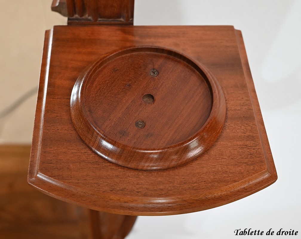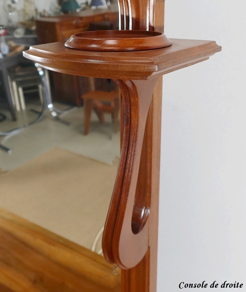 De part et d’autre, deux consoles en courbes supportent deux tablettes à bords en gorges. Deux ronds en acajou, vissés dans ces dernières, pourront servir de réceptacles à des bougies ou autres objets décoratifs.