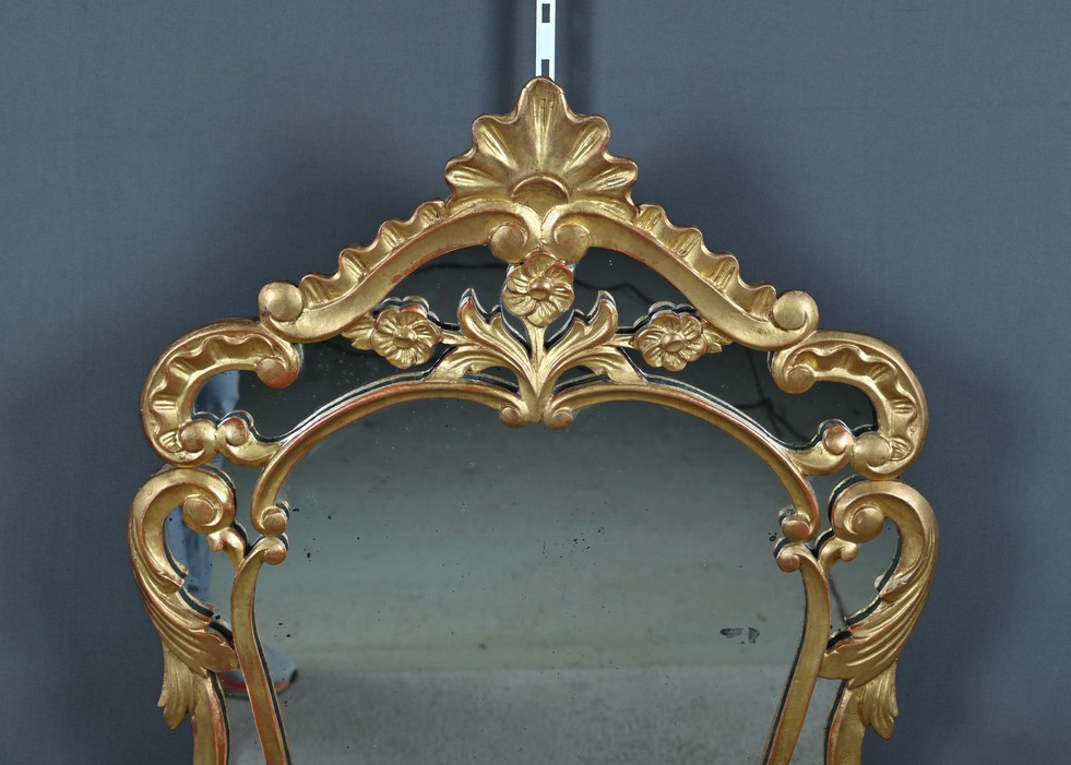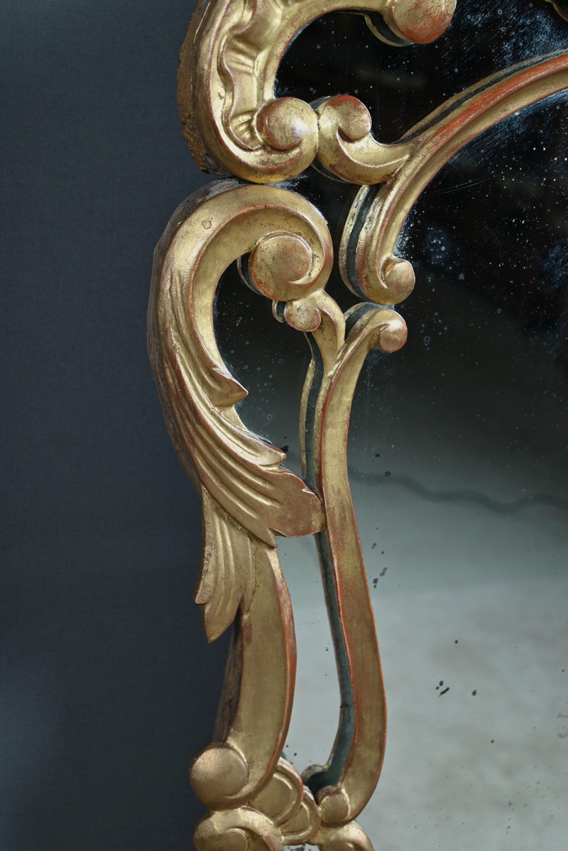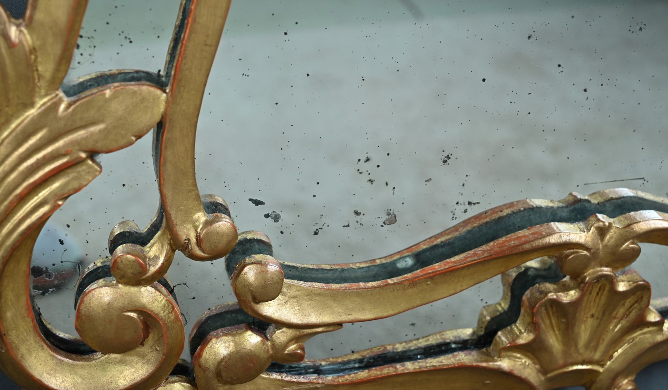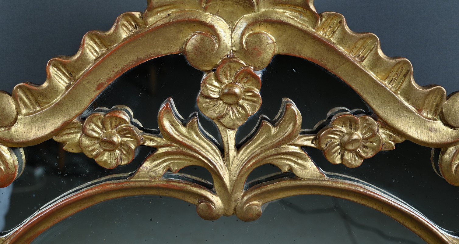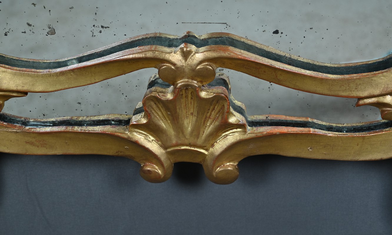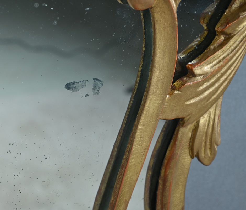 Le fronton est couronné de trois fleurs stylisées, délicatement sculptées, sommées d’une coquille centrale en relief, emblème décoratif emblématique du style rocaille. Cette coquille est encadrée de volutes sinueuses et de feuilles d’acanthe nervurées, qui se déploient avec grâce le long de l’entourage, conférant à l’ensemble une dynamique végétale et asymétrique caractéristique du style Louis XV. Les parcloses, encadrant le miroir central, accentuent la légèreté et la sophistication de la pièce, tout en mettant en valeur la dorure patinée d’origine, subtilement rehaussée par le jeu des reliefs et des ombres.