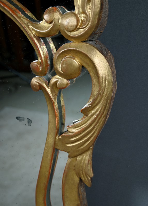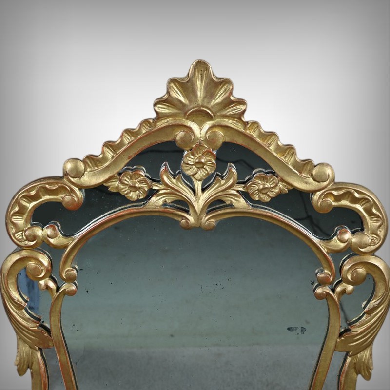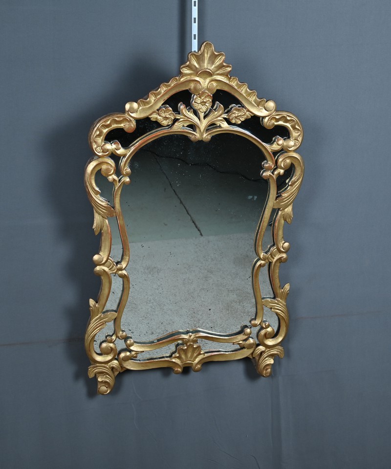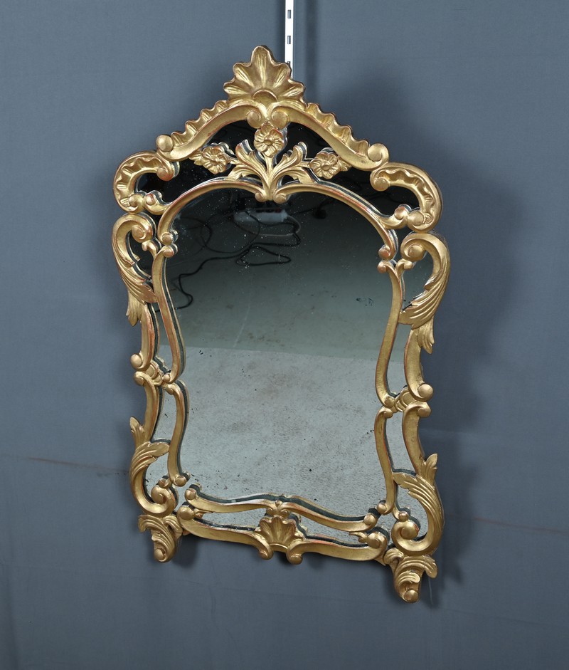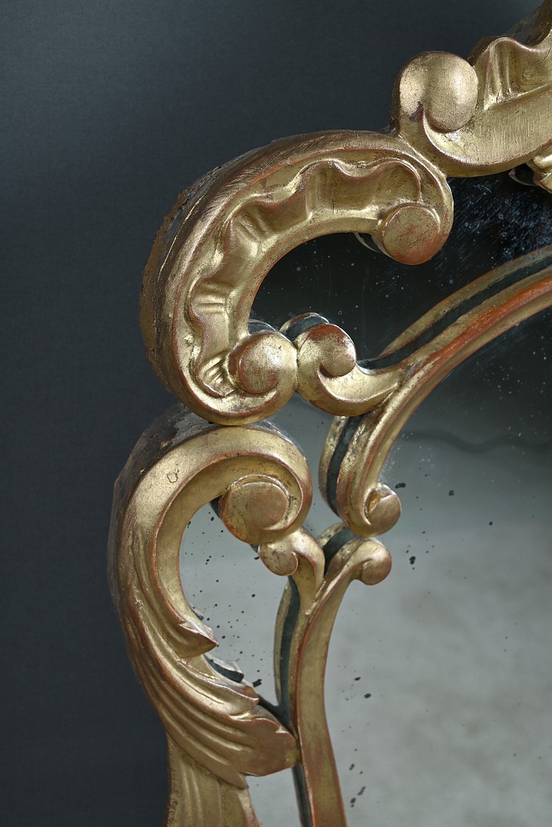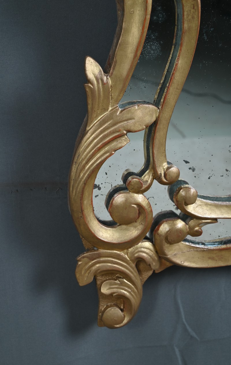 Élégant miroir à parcloses de forme chantournée, typique du goût rocaille. L’encadrement en bois sculpté et doré à la feuille d’or présente une riche ornementation d’une grande finesse, révélant le savoir-faire des ateliers de l’époque.