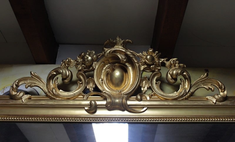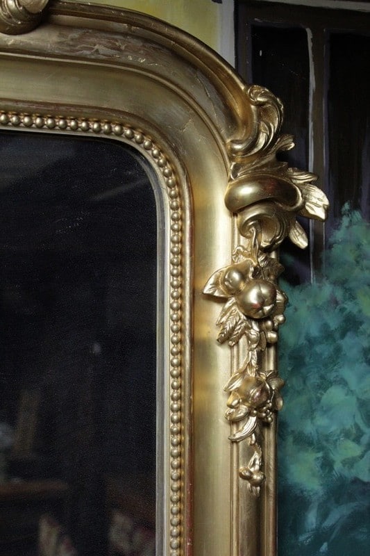 Important miroir NAPOLÉON III , son cadre mouluré et doré est orné en bandeau d’un cartouche flanqué de fruits et de crosses d’acanthe, épaulé de chutes de fruits, les flancs sont à agrafes rocaille, et enfin, la ceinture est flanquée de tulipes d’acanthe et ornée d’une agrafe rocaille. Seconde moitié du XIXe