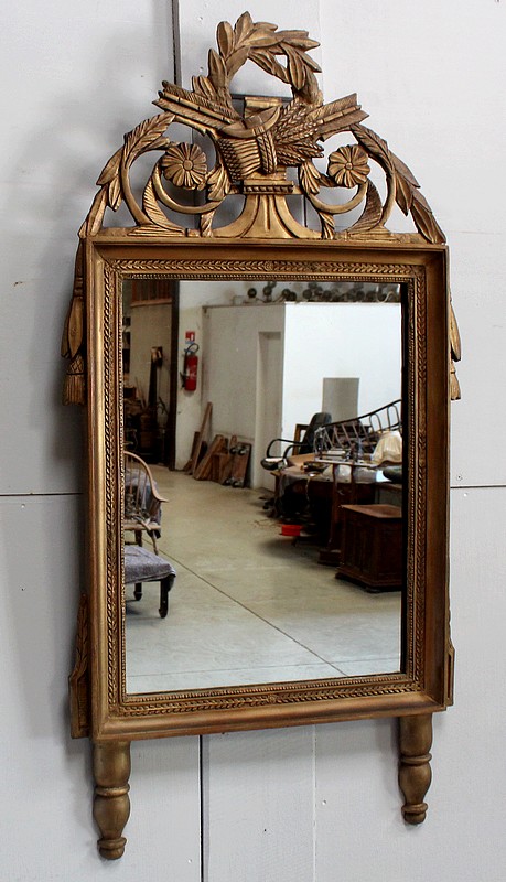 Beau Miroir en Bois Doré mouluré de style Louis XVI muni d’une Glace au Mercure Rectangulaire bordée de Frises Perlées et Florales.