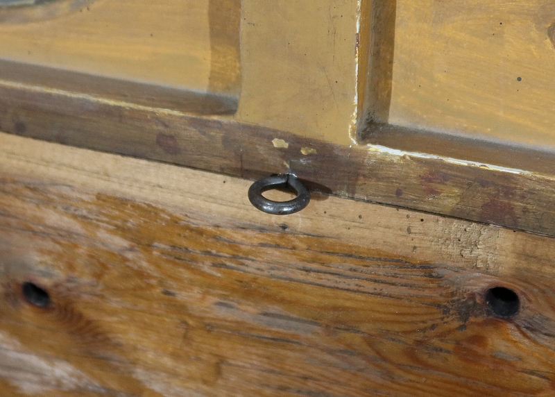 Ce miroir rectangulaire est muni d’un entourage peu large formé d’une gorge et d’un chapelet de perles vers l’intérieur du miroir. Vers l’extérieur de ce cadre, une bande de bois en retrait de couleur sombre se termine en partie basse par un motif de feuillage accompagné d’une pomme de pin. En partie haute, deux chutes composées de feuillage sont surmontées d’un fronton très décoratif composé d’une base avec cannelures verticales et au dessus d’un encadrement ovale recevant un miroir. Sur le cadre, un important ruban entrelacé est accompagné de chaque côté de deux cordons. Le plus long va rejoindre l’extérieur de la glace. Nous retrouvons de chaque côté un important branchage composé de feuilles retombants sur l’extérieur.
