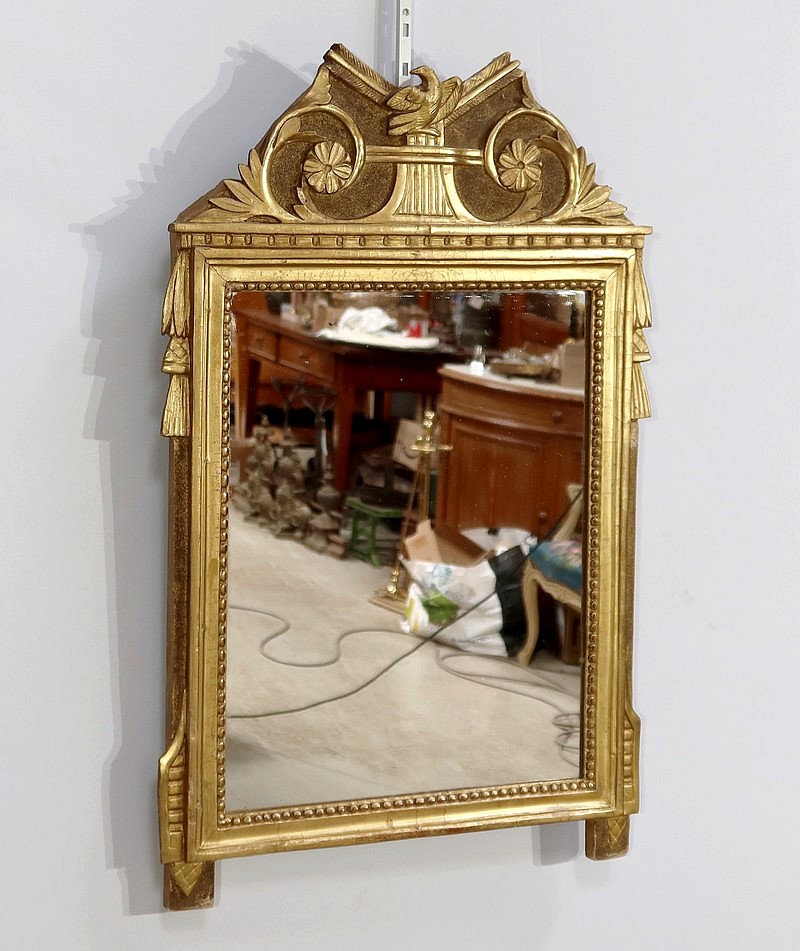 Charmant miroir rectangulaire en bois doré à cadre mouluré et perlé, sommé d’un grand fronton représentant une colombe entourée de flèches, de volutes et de fleurs. De chaque côté, des pompons forment des chutes sur le haut du cadre.