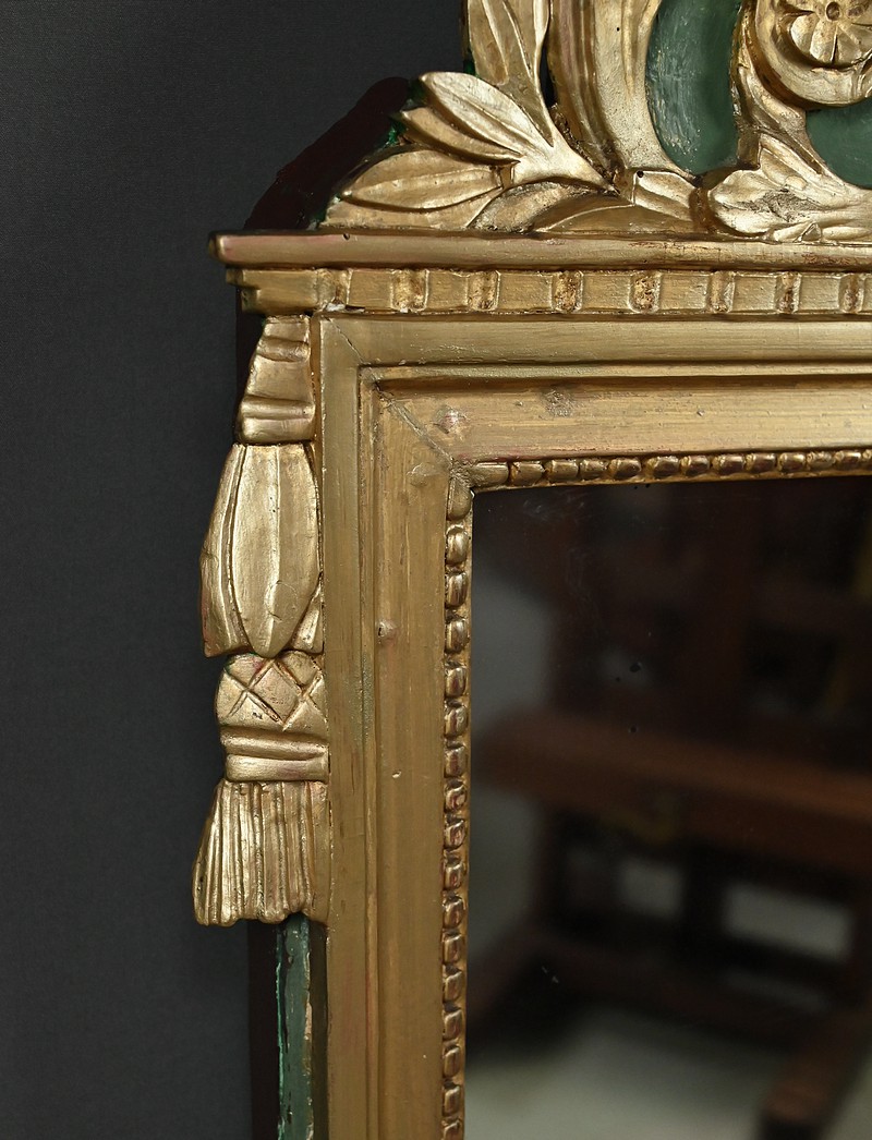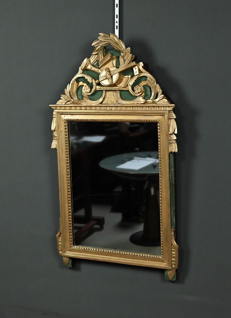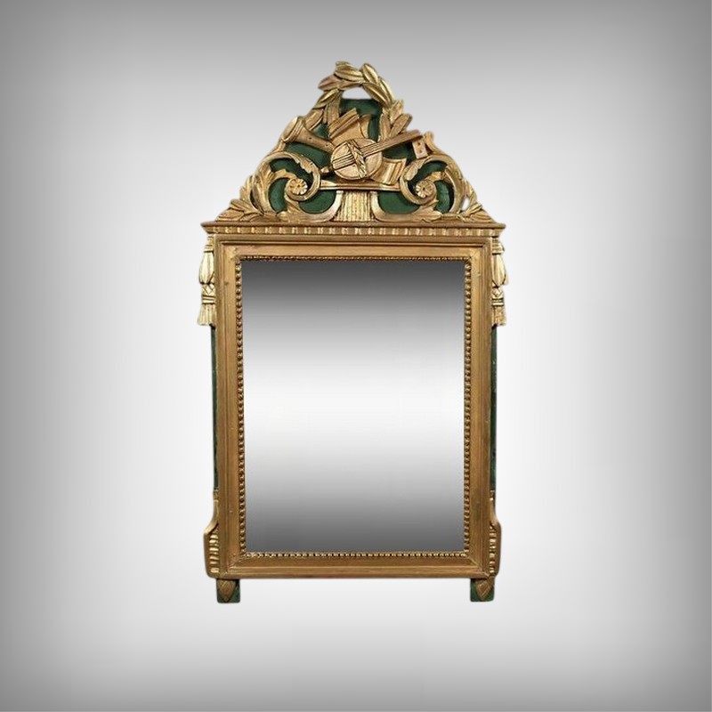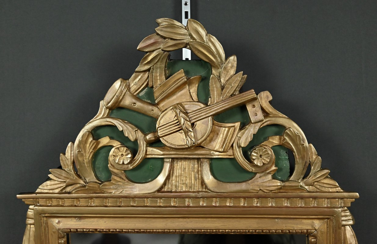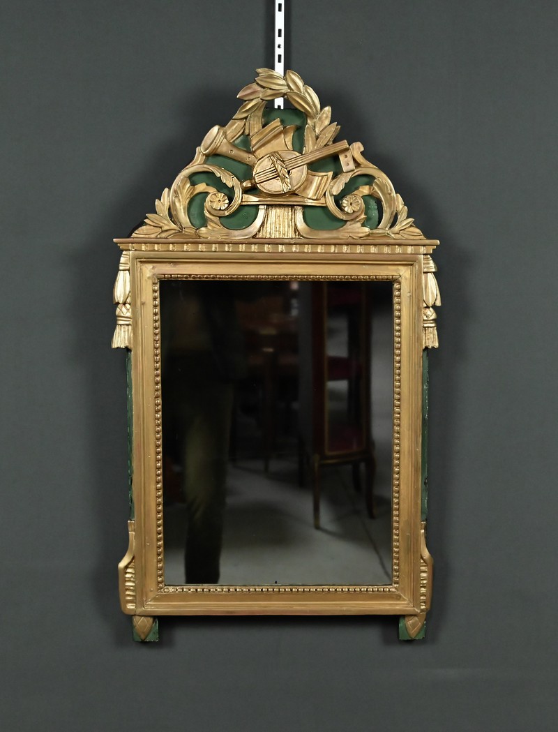 Ce miroir de style Louis XVI séduit par l’élégance de son encadrement sculpté et la richesse de ses ornements. Sa glace rectangulaire est sertie d’un cadre mouluré à la dorure mordorée, rythmé par une délicate guirlande de perles et surmonté d’une frise dentelée finement travaillée. Le fronton supérieur célèbre les arts avec une allégorie musicale sculptée en relief : mandoline, flûte, feuillage et fleurettes s’entrelacent dans une composition harmonieuse, évoquant le raffinement des salons du XVIIIe siècle. Les angles supérieurs sont ponctués de houppes suspendues, apportant une touche de fantaisie et de mouvement à l’ensemble. Le fond peint en vert Empire souligne avec panache la dorure du bois et confère à la pièce une profondeur visuelle. Ce miroir conjugue avec brio noblesse des matériaux, finesse d’exécution et poésie décorative. Un objet de caractère, idéal pour sublimer un intérieur classique ou créer un contraste audacieux dans une décoration contemporaine.