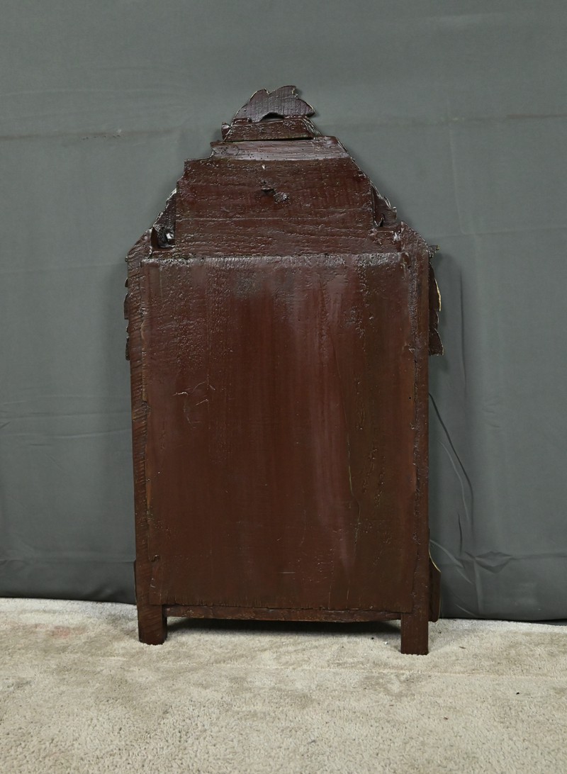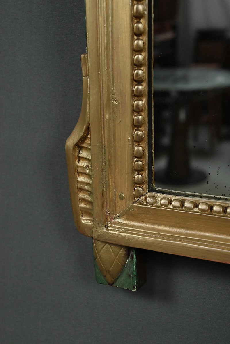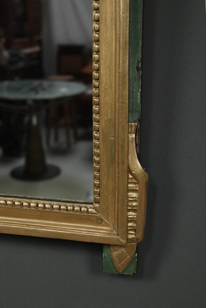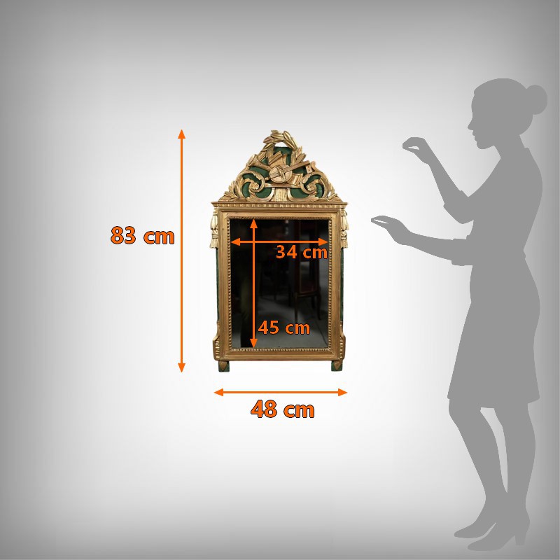Ce miroir de style Louis XVI séduit par l’élégance de son encadrement sculpté et la richesse de ses ornements. Sa glace rectangulaire est sertie d’un cadre mouluré à la dorure mordorée, rythmé par une délicate guirlande de perles et surmonté d’une frise dentelée finement travaillée. Le fronton supérieur célèbre les arts avec une allégorie musicale sculptée en relief : mandoline, flûte, feuillage et fleurettes s’entrelacent dans une composition harmonieuse, évoquant le raffinement des salons du XVIIIe siècle. Les angles supérieurs sont ponctués de houppes suspendues, apportant une touche de fantaisie et de mouvement à l’ensemble. Le fond peint en vert Empire souligne avec panache la dorure du bois et confère à la pièce une profondeur visuelle. Ce miroir conjugue avec brio noblesse des matériaux, finesse d’exécution et poésie décorative. Un objet de caractère, idéal pour sublimer un intérieur classique ou créer un contraste audacieux dans une décoration contemporaine.