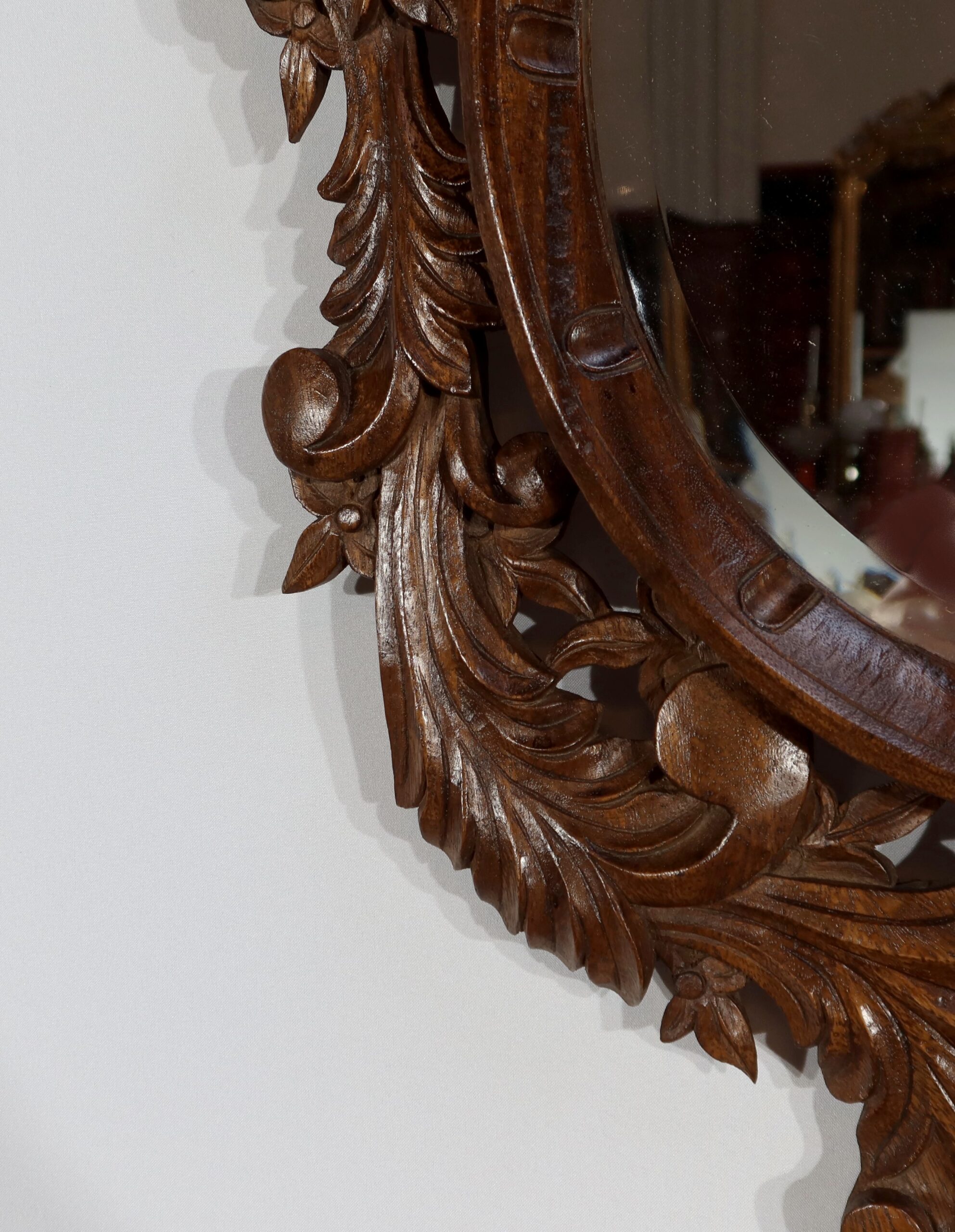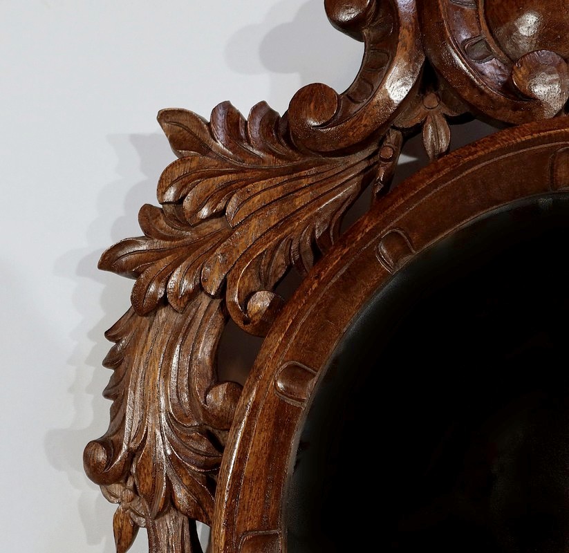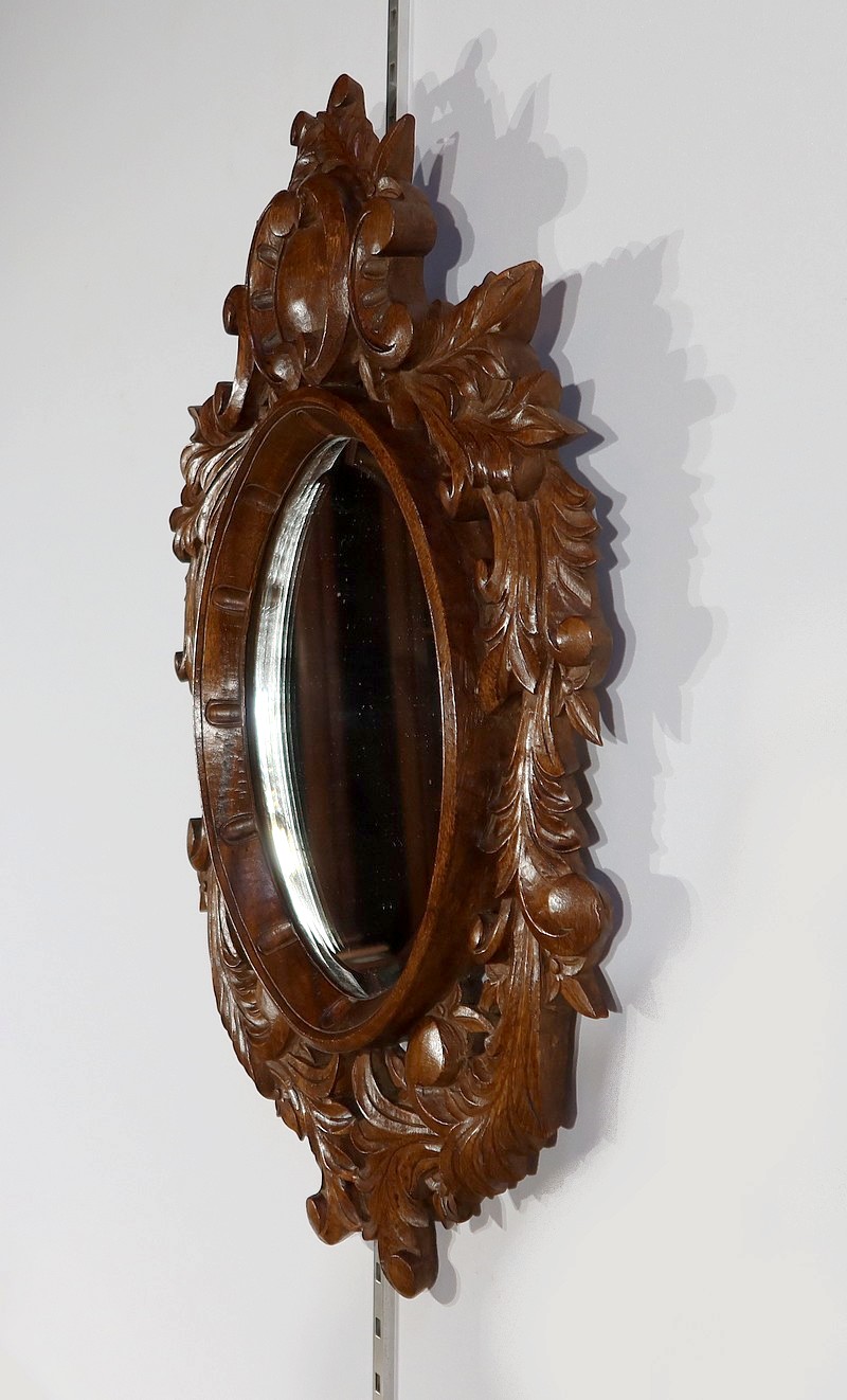 Élégant miroir en chêne de forme ovalisée, bénéficiant d’un cadre sculpté et d’une glace biseauté.
