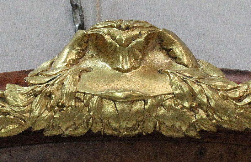 Ce Miroir, épais de 7cm, présente une Glace au Mercure avec une partie supérieure au léger Galbe, épousant la forme du Cadre. Sur sa Traverse la plus haute présentant des Moulures, il arbore un Bronze conséquent avec des motifs de Feuillages. De chaque côté, sur les Montants découpés en Quart de Cercle, on retrouve une Chute, en Bronze également.