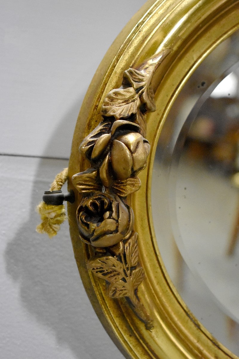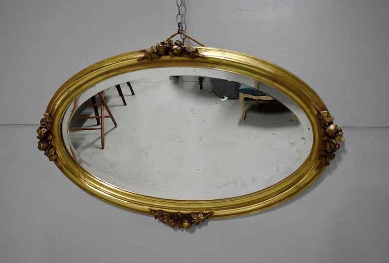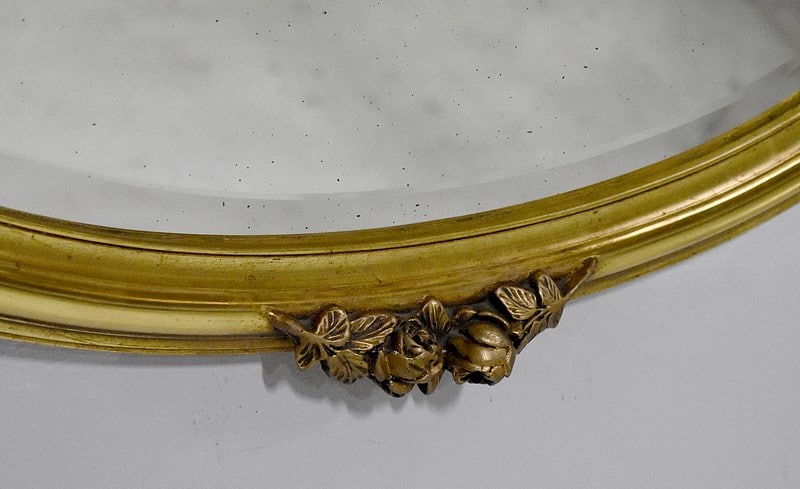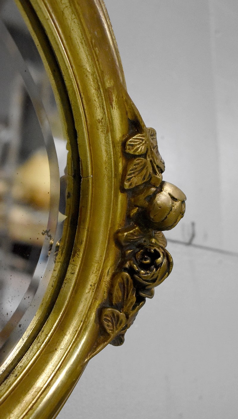 Élégant miroir ovale en bois doré arborant une paire de boutons de roses entrecroisés à chaque point cardinal.