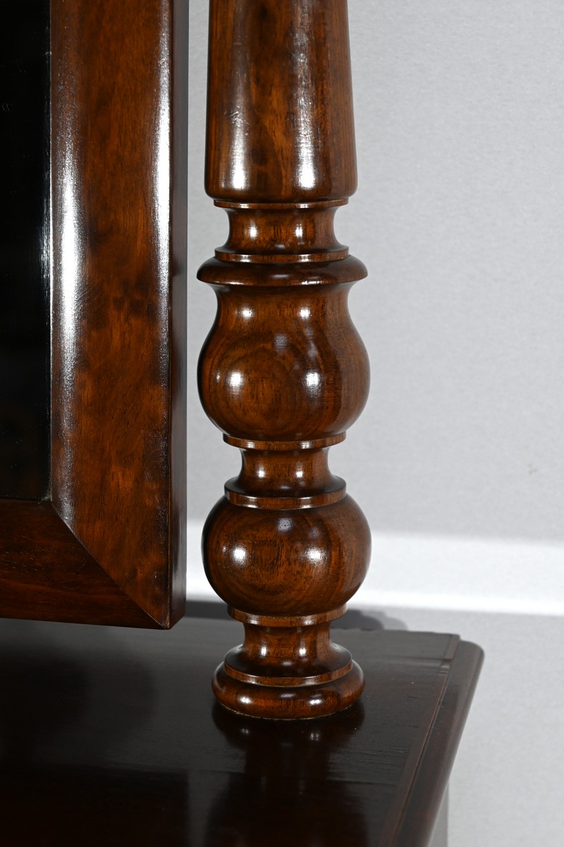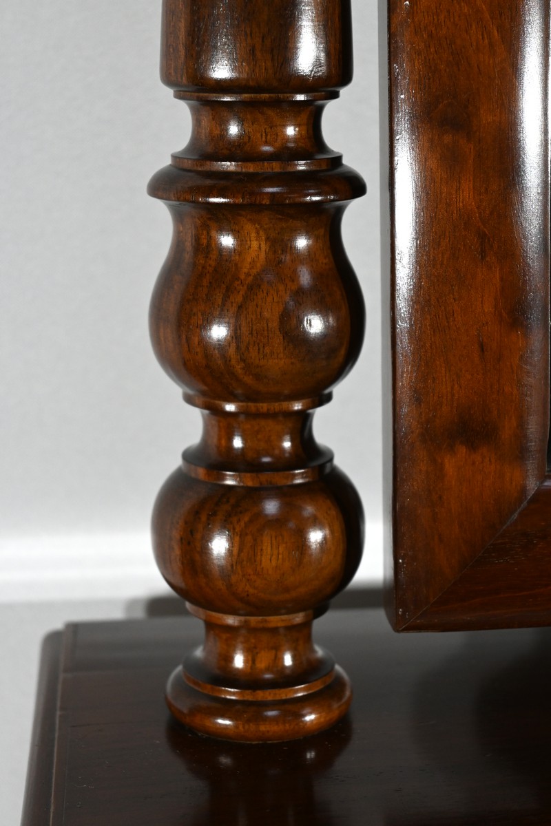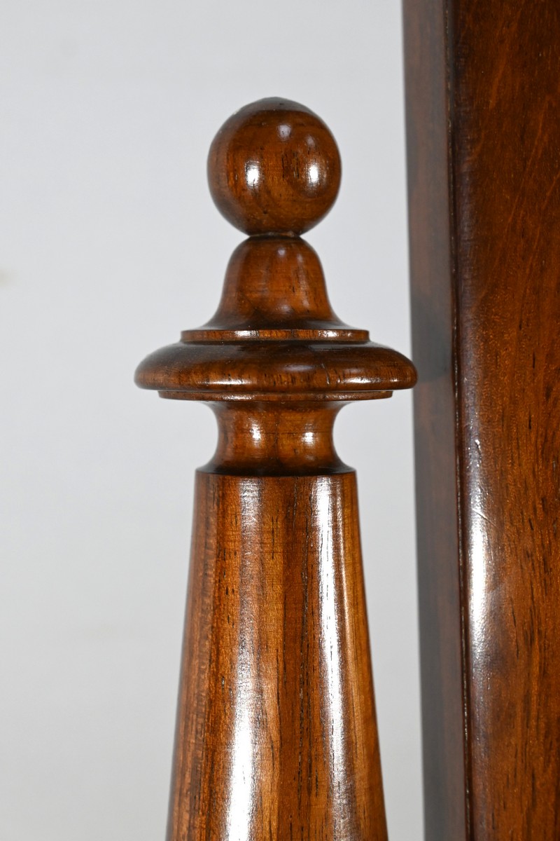 Les montants, tournés à étranglement, sont surmontés de toupies, ce qui accentue le style classique et sophistiqué de la pièce.