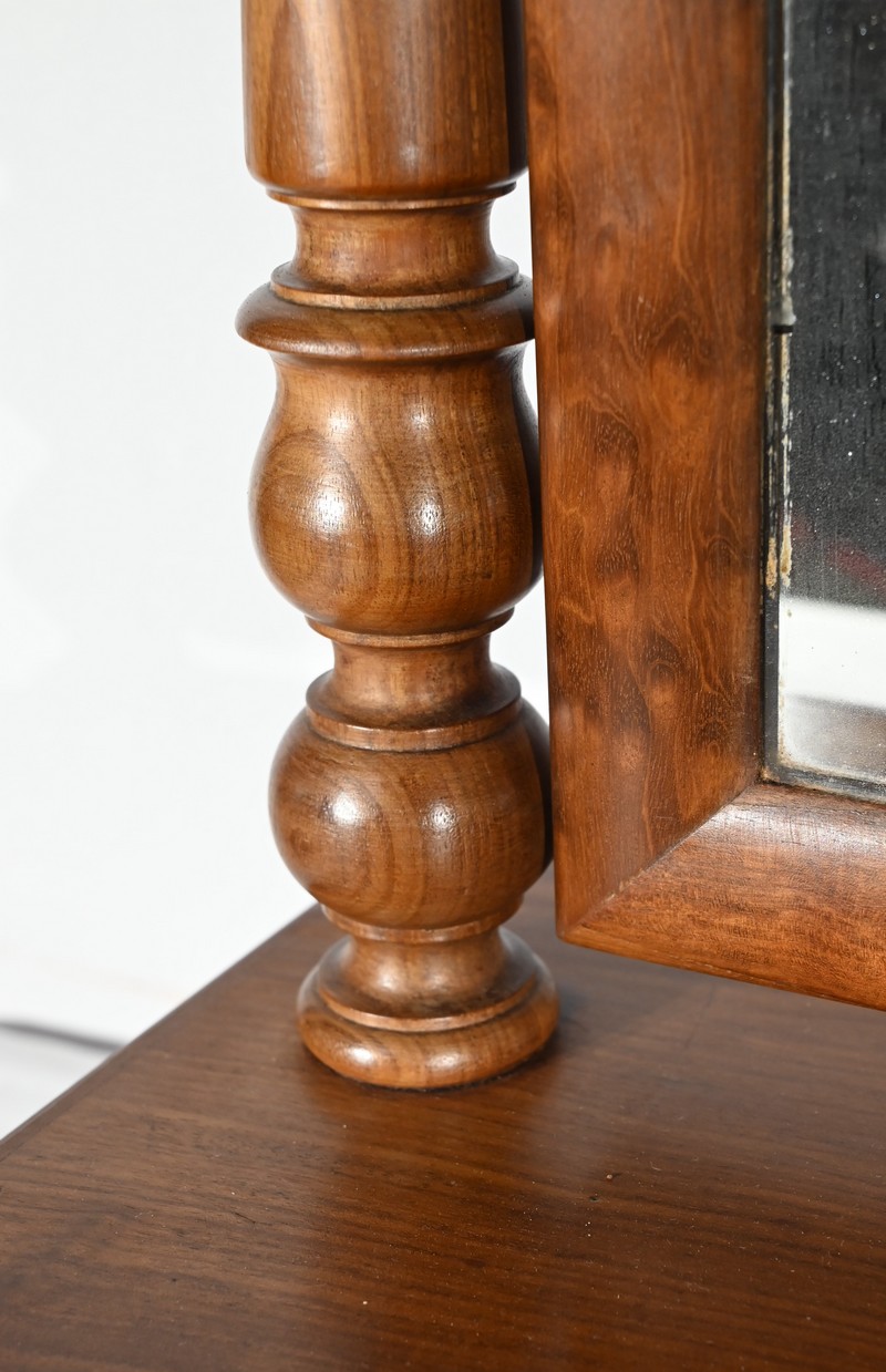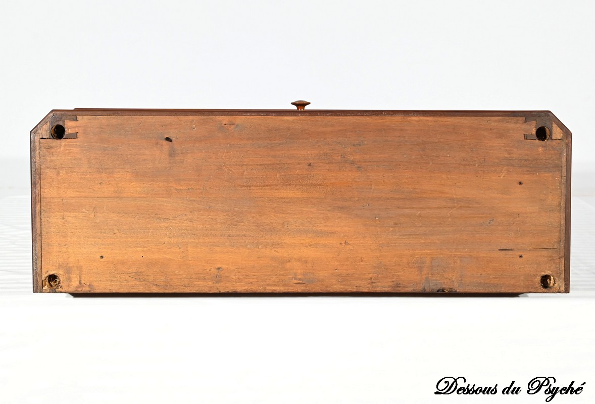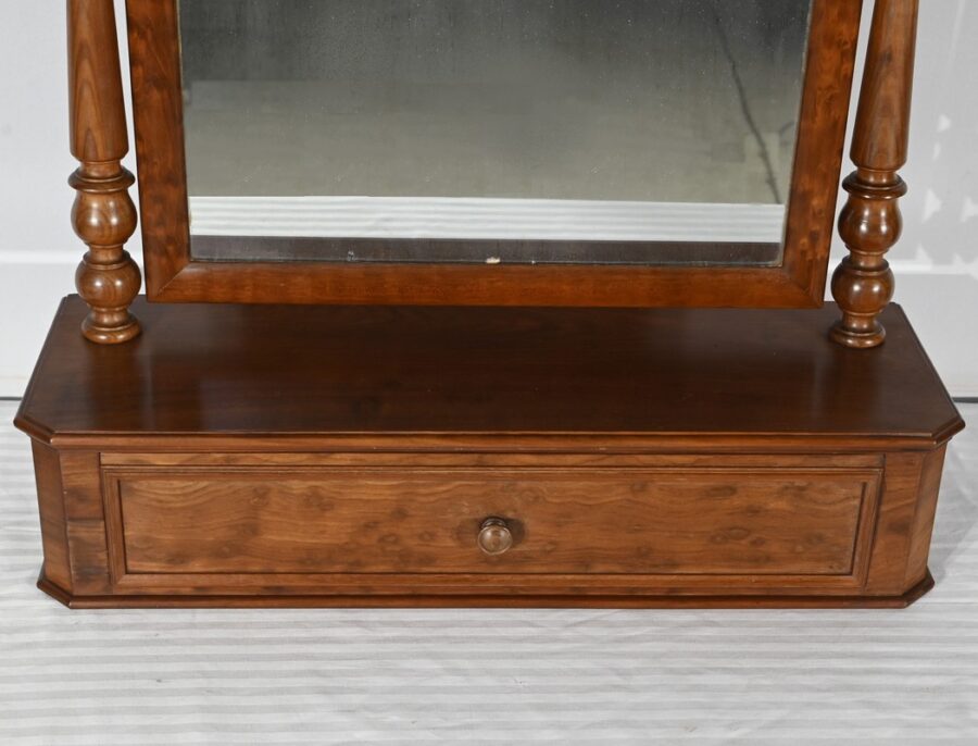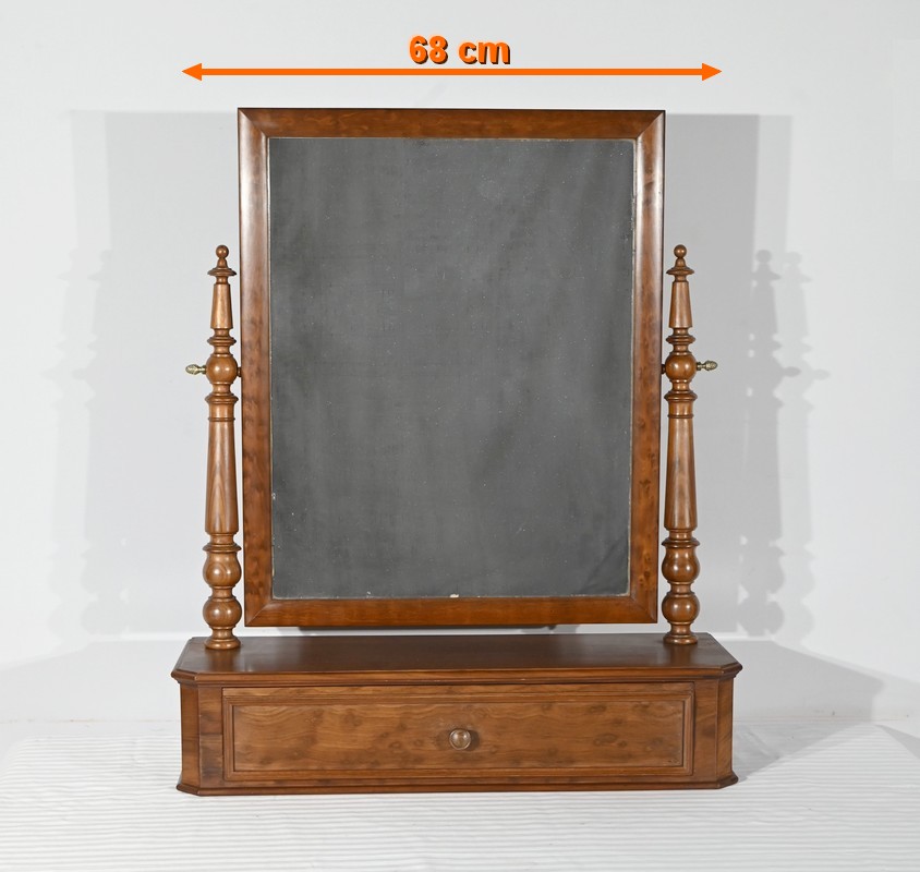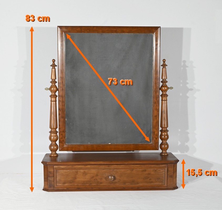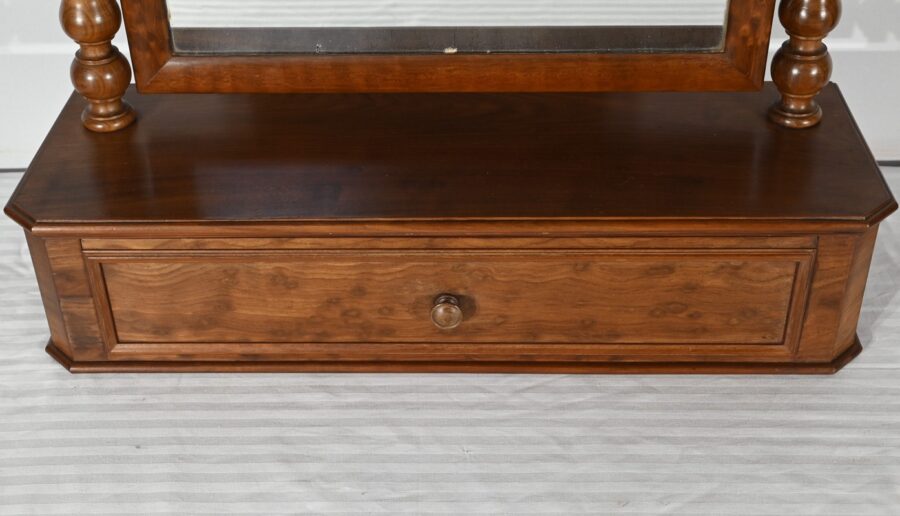 Ce miroir psyché ouvre par un tiroir à bouton bois tourné à façade en moucheté d’acajou.