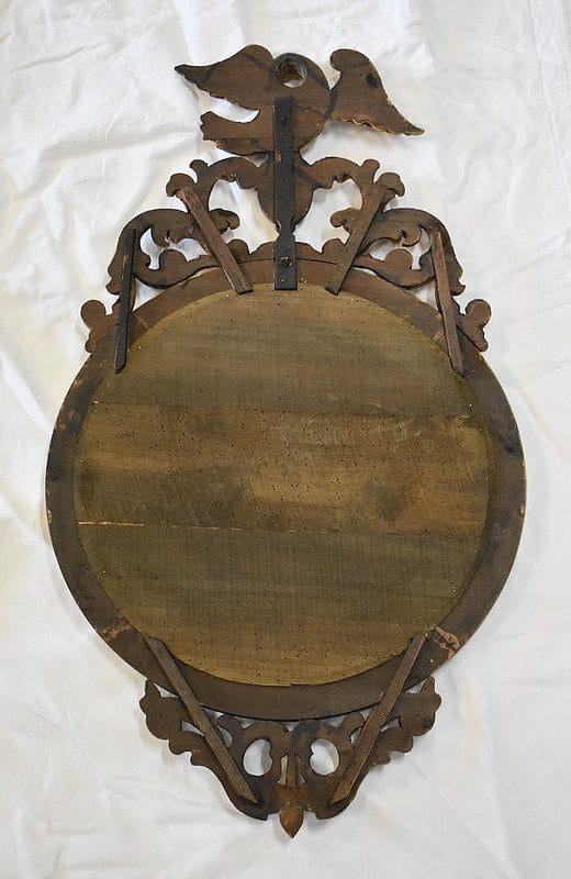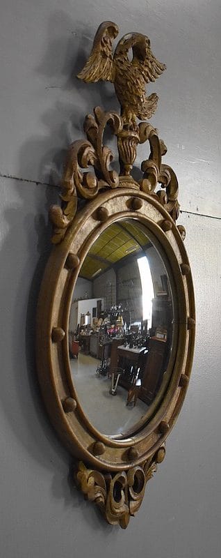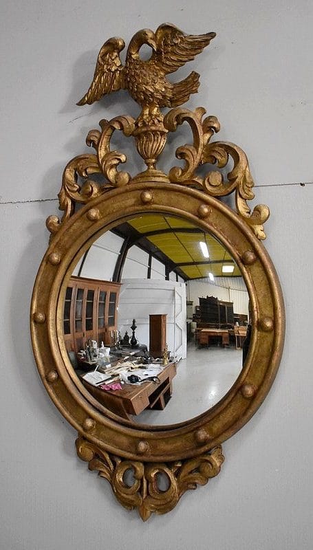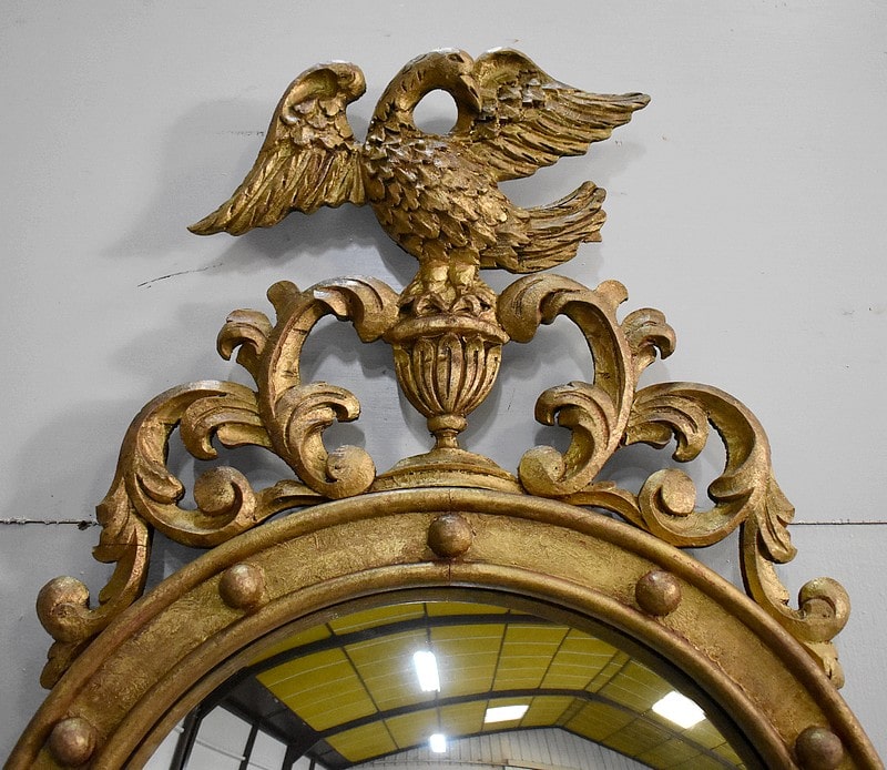 Cet entourage est sommé d’un Généreux Fronton, dominé par un Aigle aux ailes déployées. Le rapace est campé sur un Vase au corps évasé, placé au milieu de Volutes Feuillagées. La partie basse de ce Miroir est également Sculptée de motifs aux lignes arrondies.