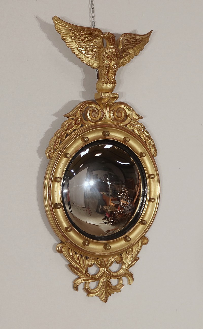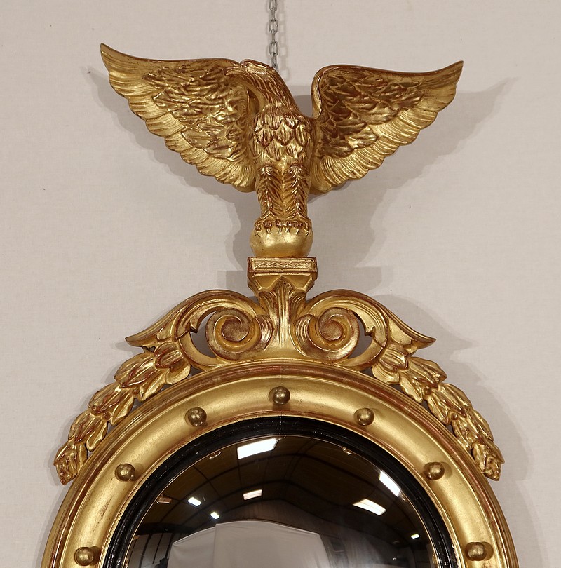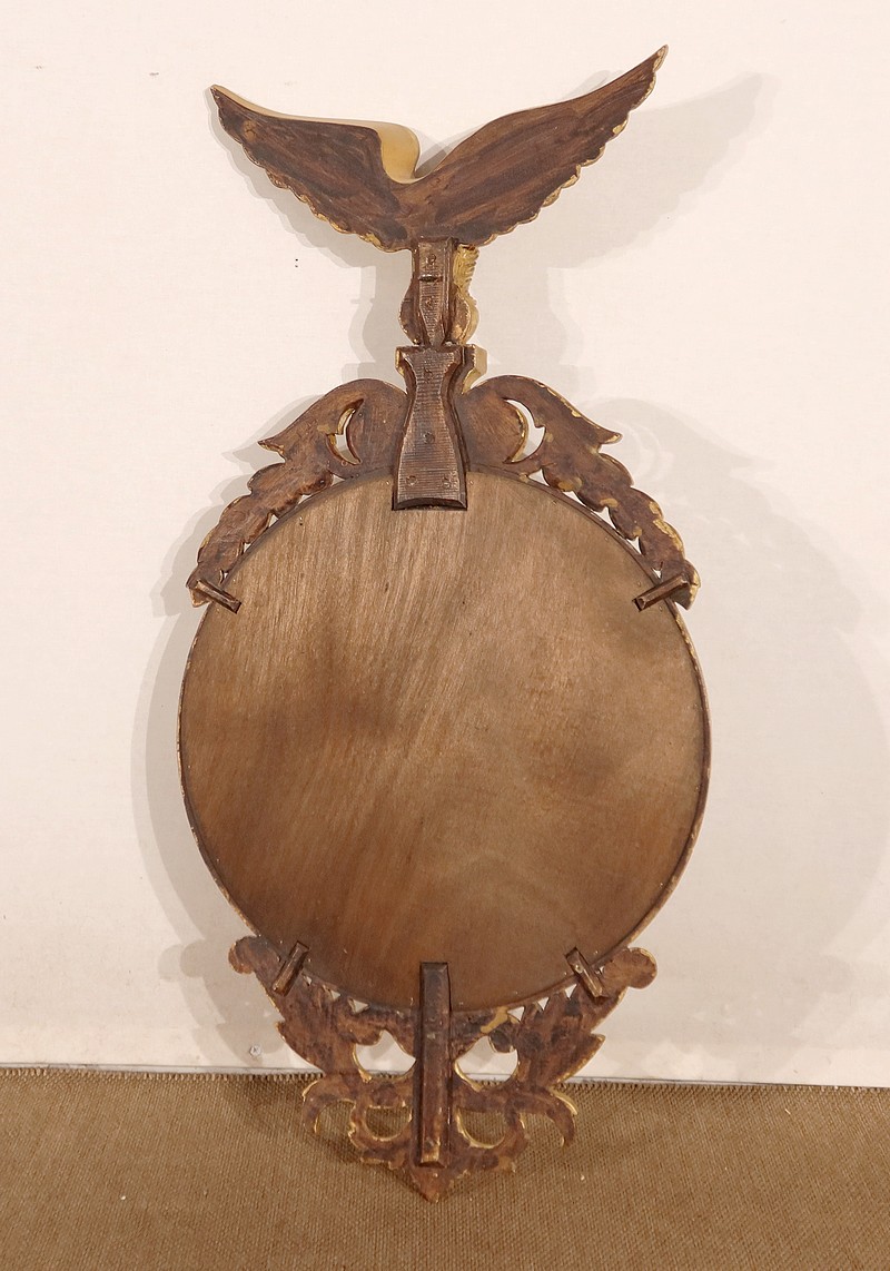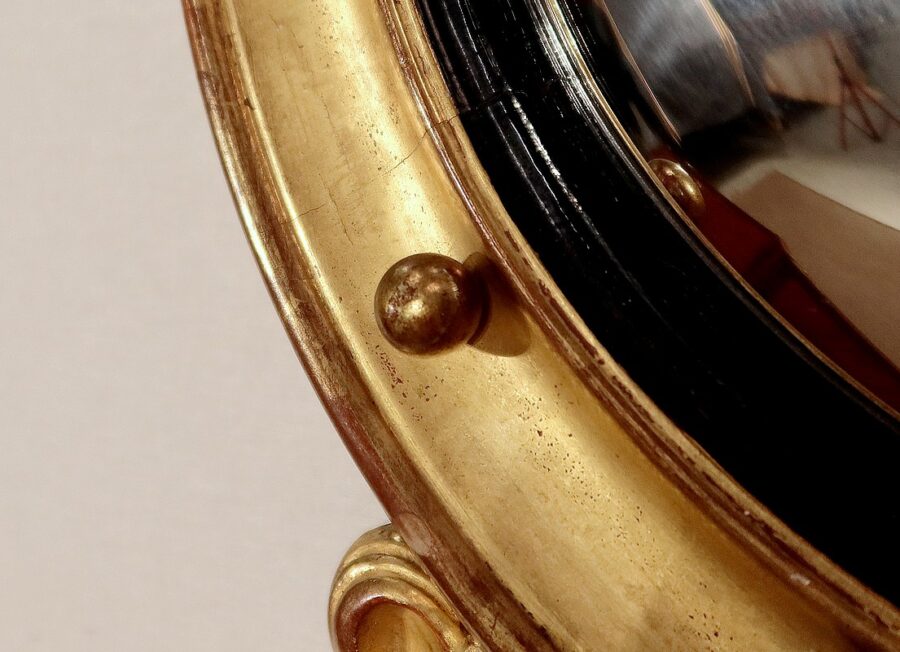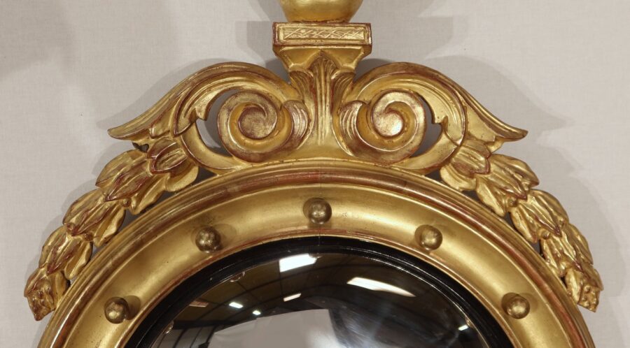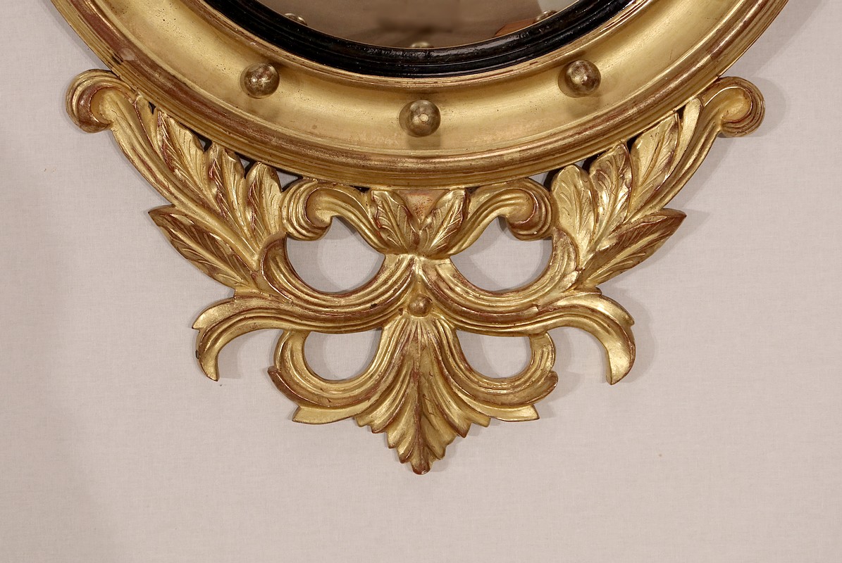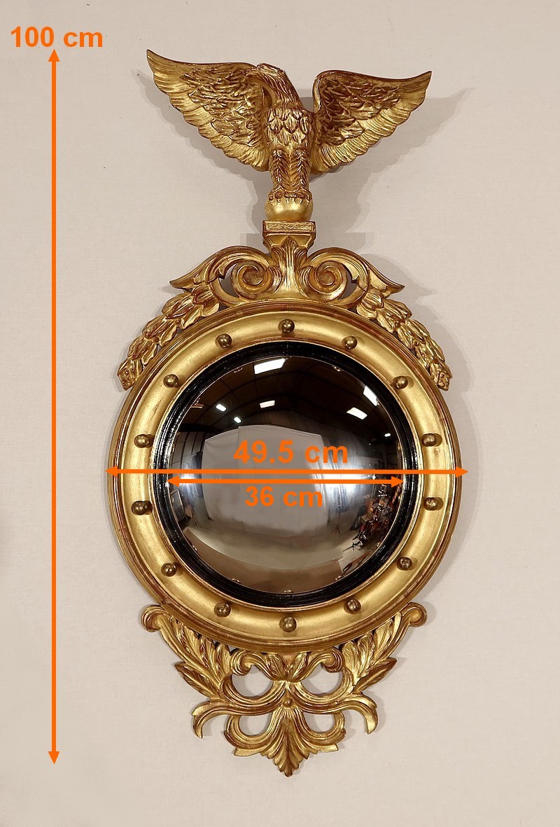 Miroir Sorcière de style Empire, muni d’une glace ronde en verre mercurisé et convexe à effet déformant.