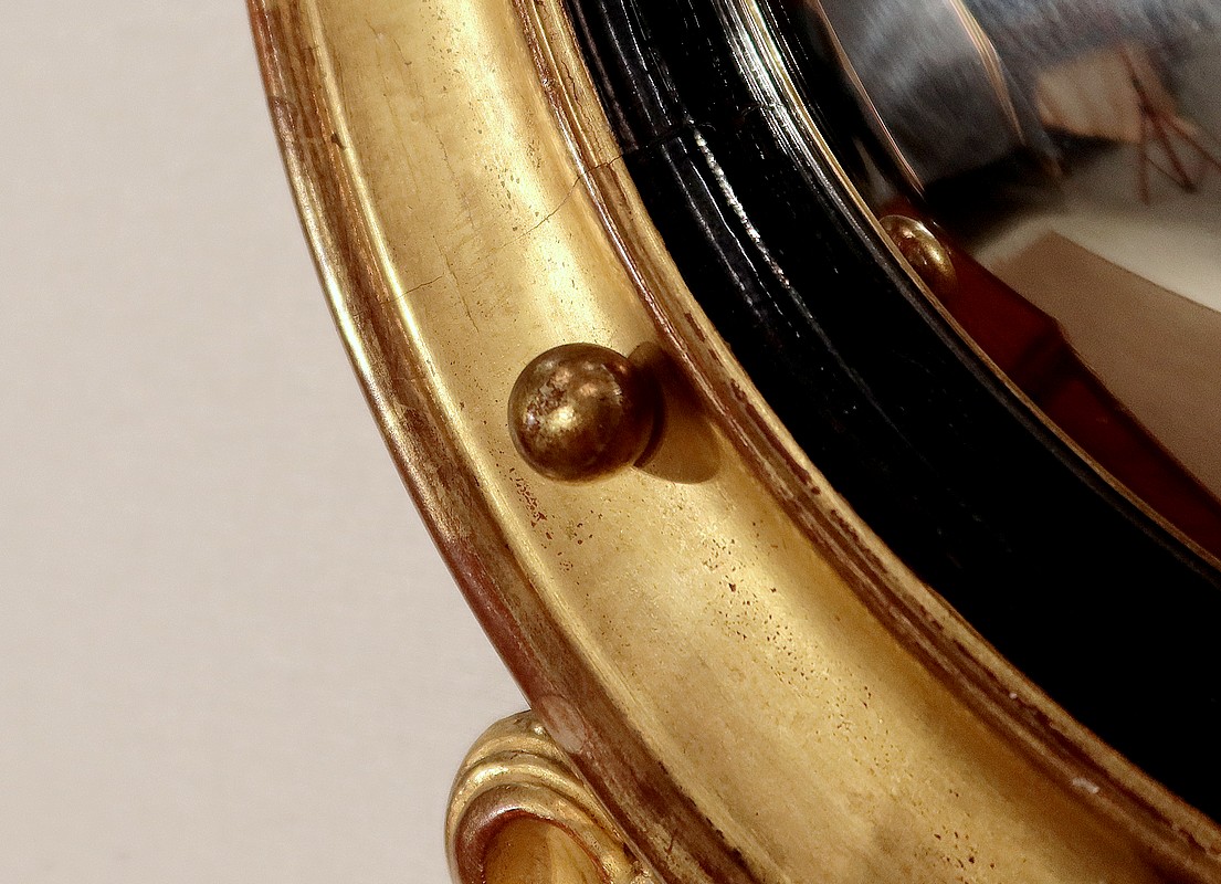 Cette dernière est positionnée dans un cadre doré avec partie creusée, agrémenté de boules saillantes disposées à intervalles réguliers.