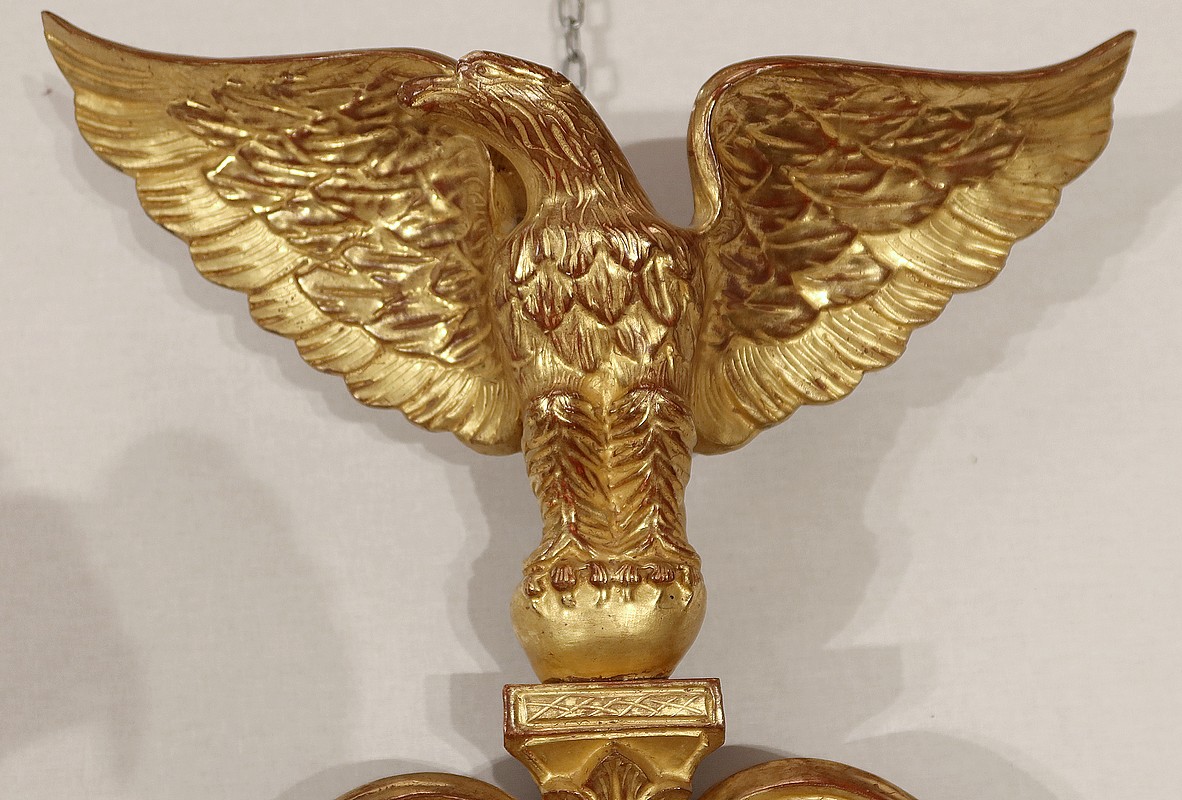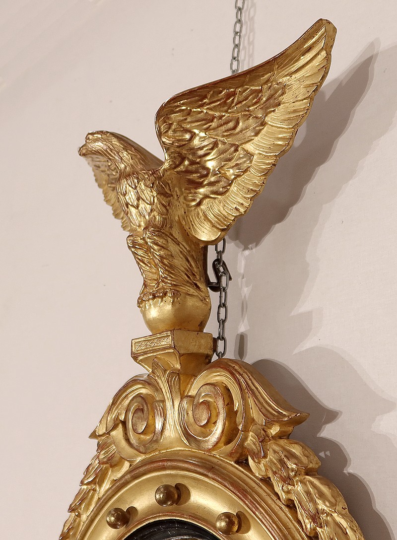Cet entourage est sommé d’un généreux fronton figurant un aigle, ailes déployées et tête tournée en un port altier. Il se dresse au-dessus d’une riche décoration de feuilles de lauriers et de volutes.