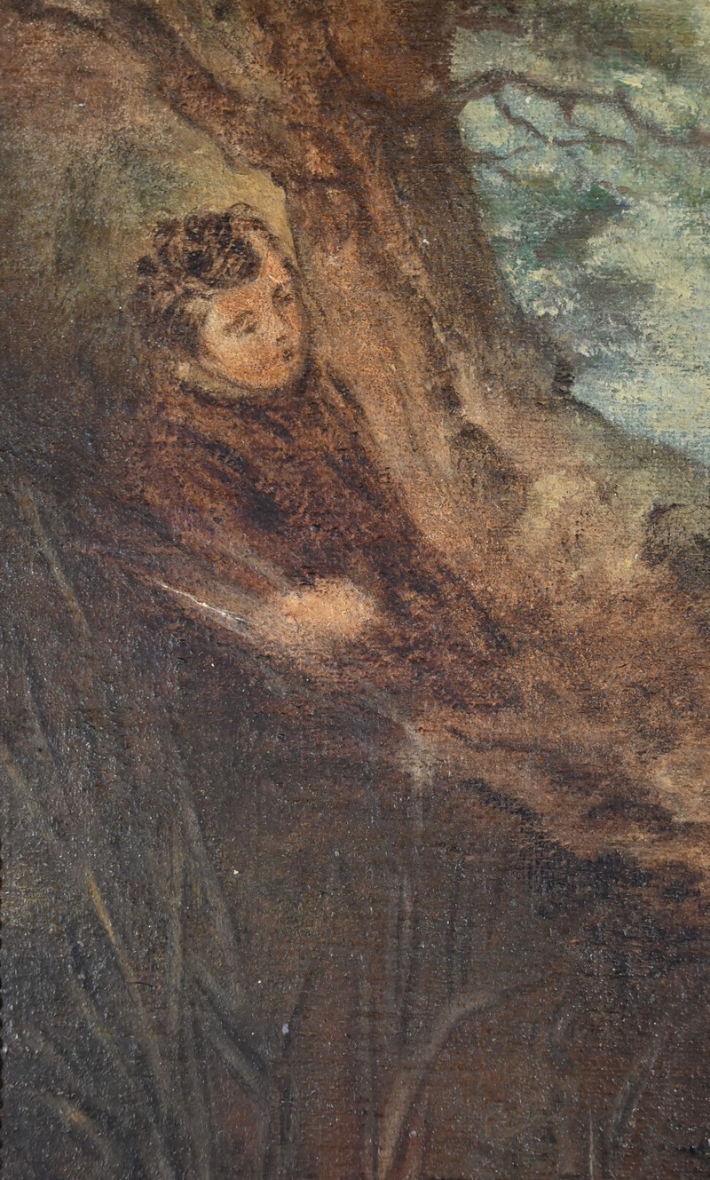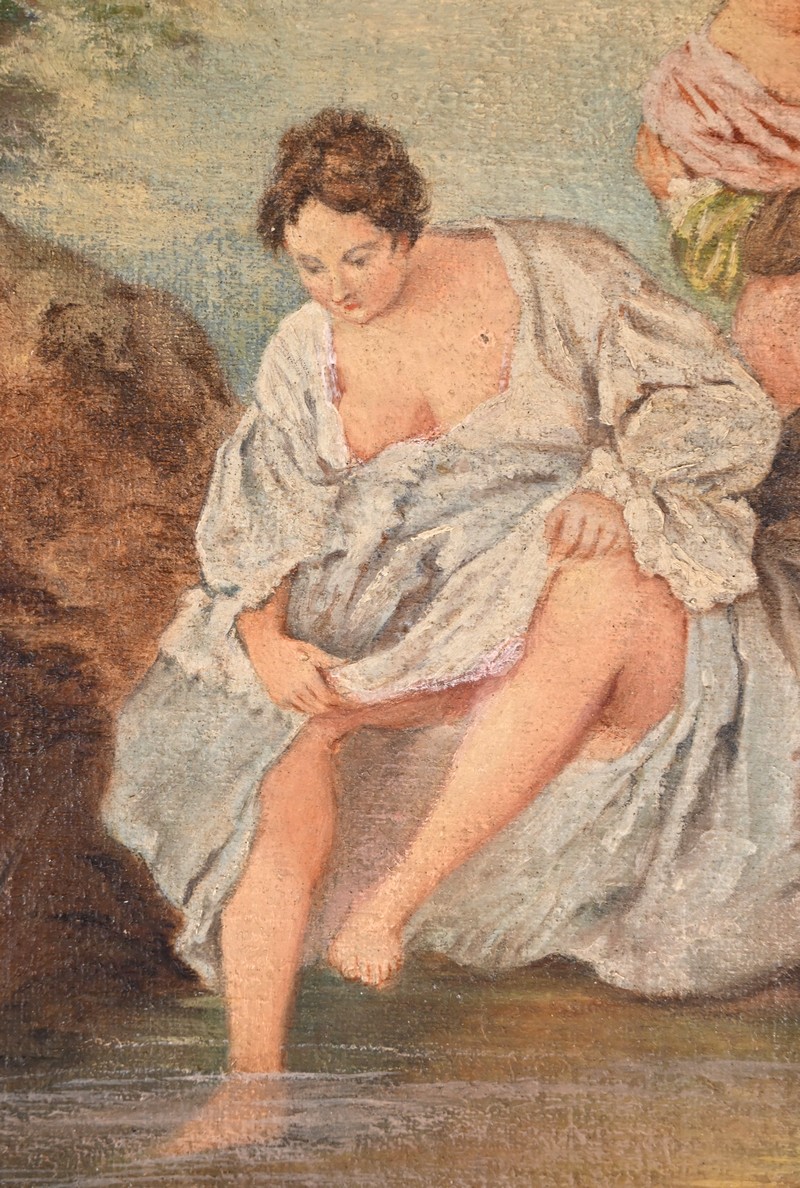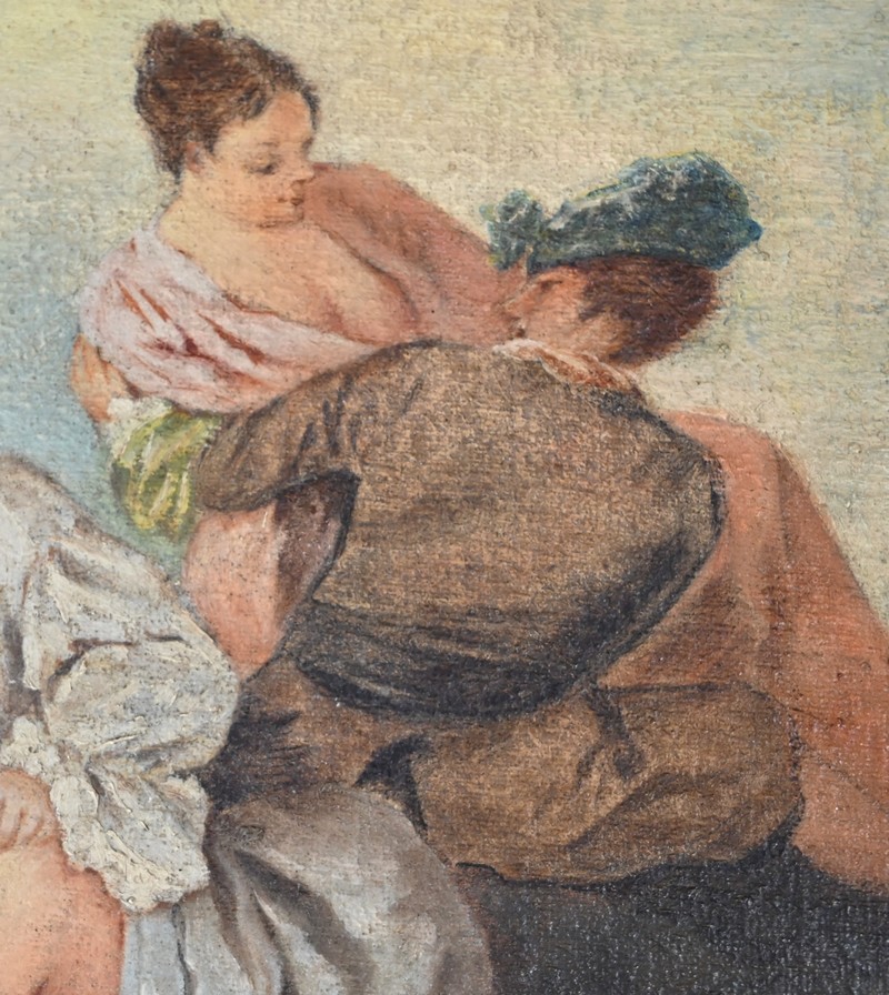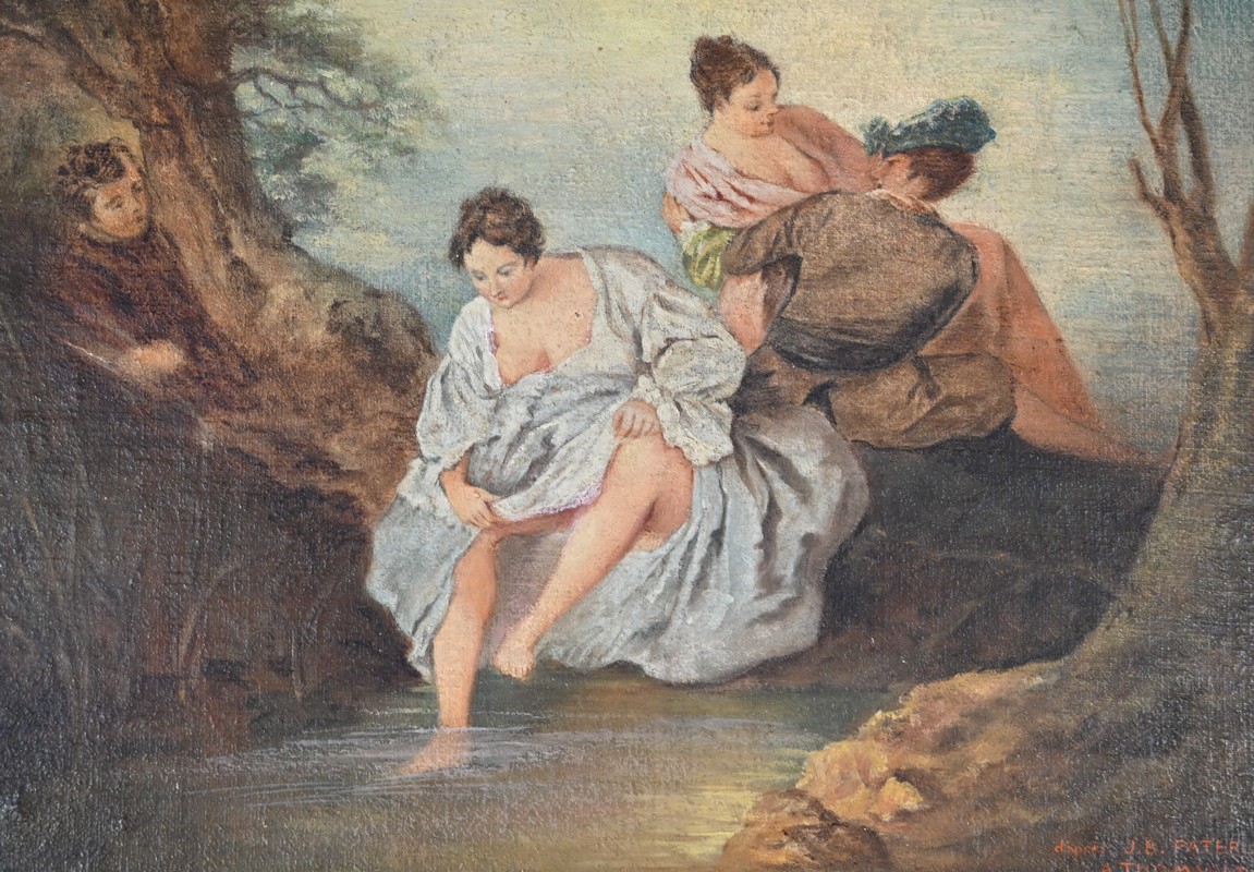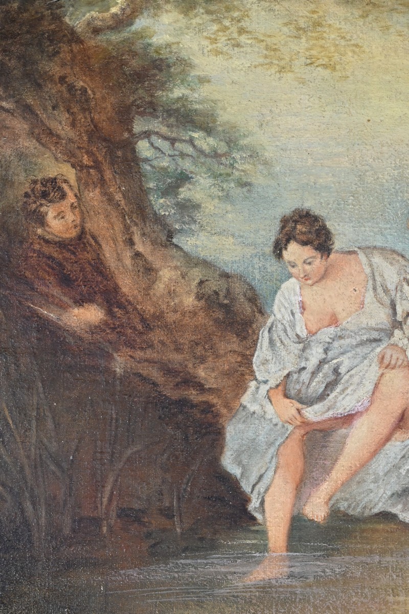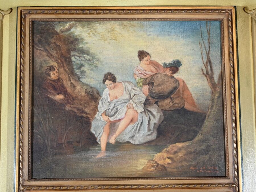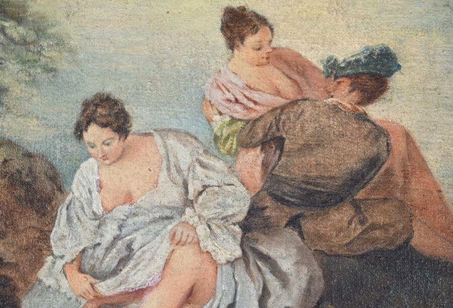 Cette peinture, présente en partie haute, illustre une baignade galante entre deux femmes et deux hommes.