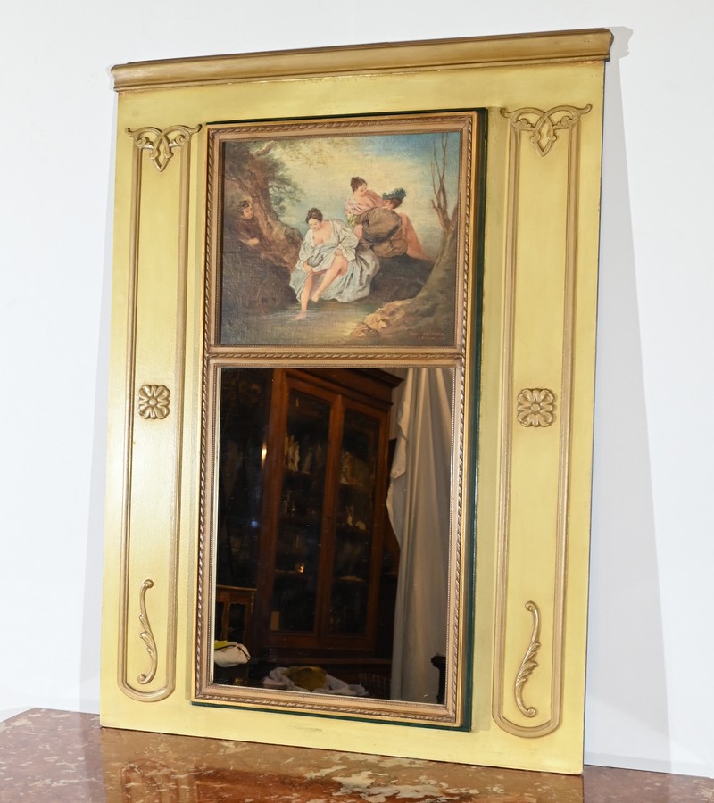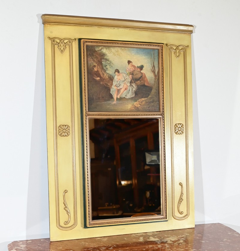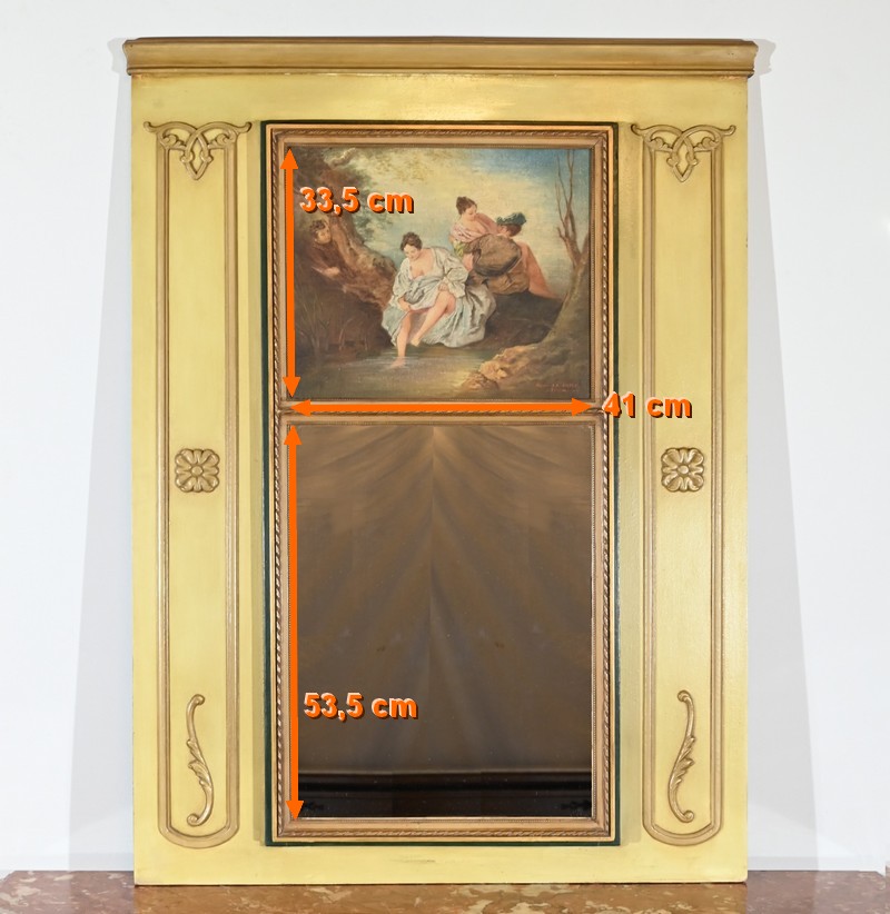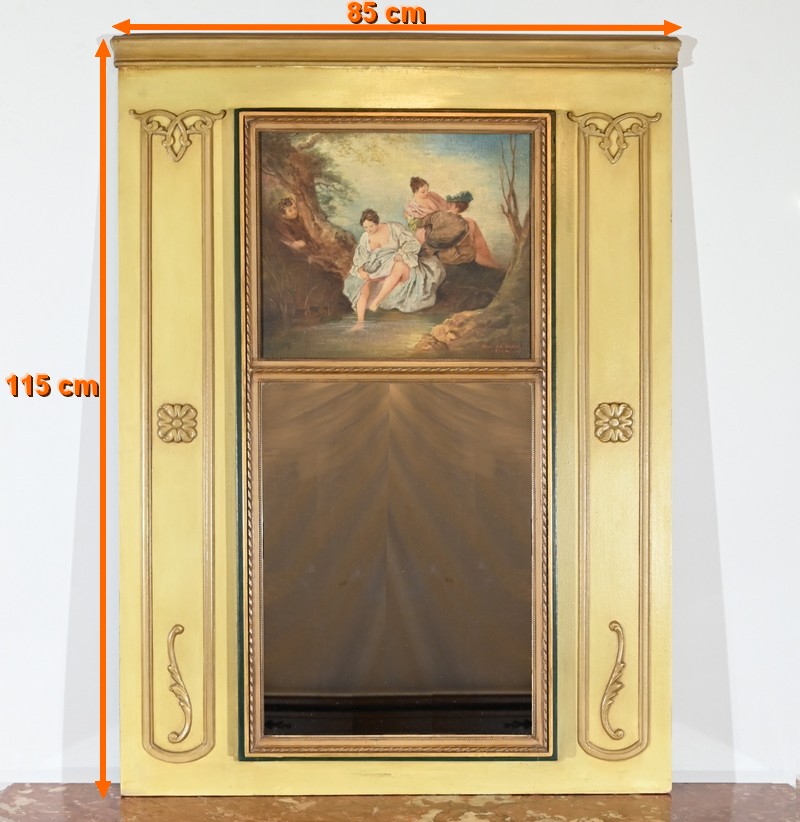 Ce miroir trumeau en bois laqué, couleur crème avec moulures dorées, arbore une peinture à l’huile sur bois, signée A.Thomaray, d’après une œuvre de Jean-Baptiste Pater (1695-1736). Académicien royal de peinture et de sculpture, élève d’Antoine Watteau, Jean-Baptiste Pater est considéré comme un maître du mouvement Rococo.