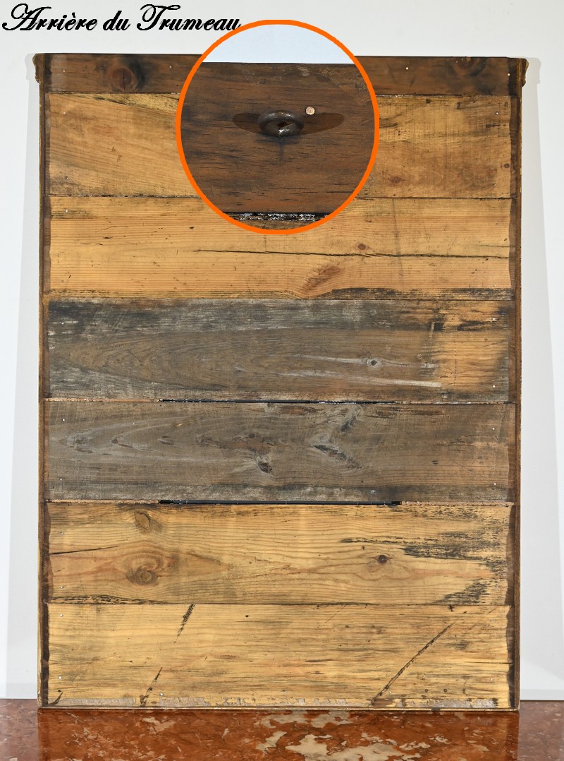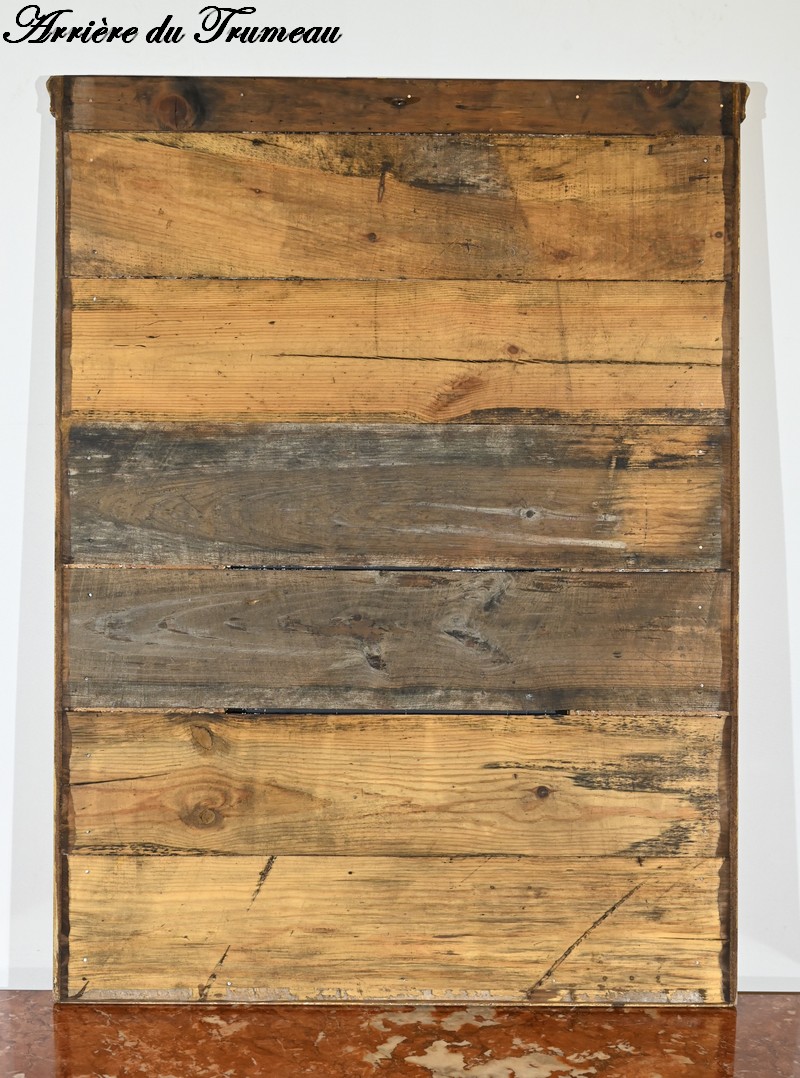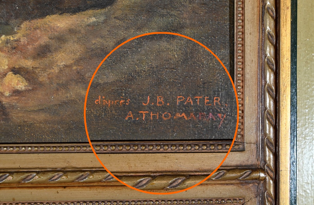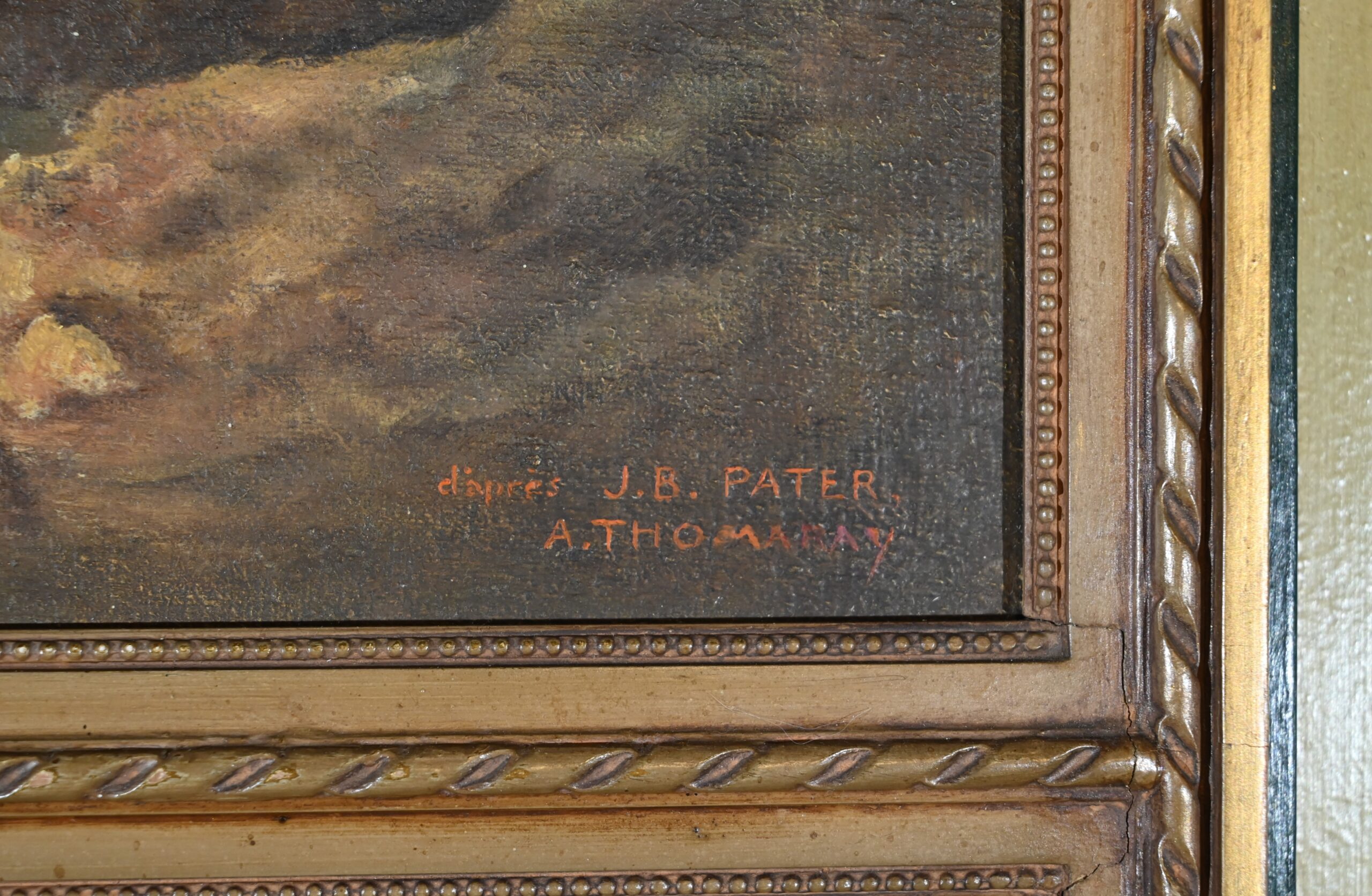 Ce miroir trumeau en bois laqué, couleur crème avec moulures dorées, arbore une peinture à l’huile sur bois, signée A.Thomaray, d’après une œuvre de Jean-Baptiste Pater (1695-1736). Académicien royal de peinture et de sculpture, élève d’Antoine Watteau, Jean-Baptiste Pater est considéré comme un maître du mouvement Rococo.