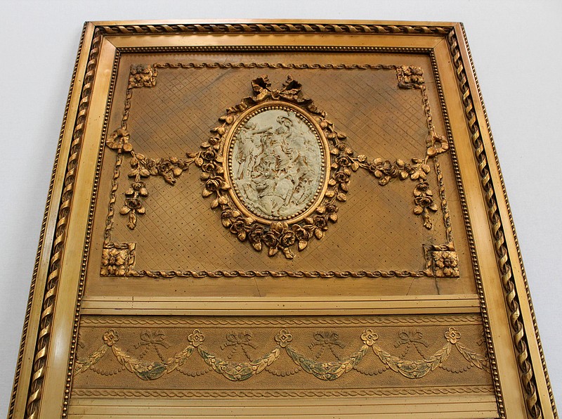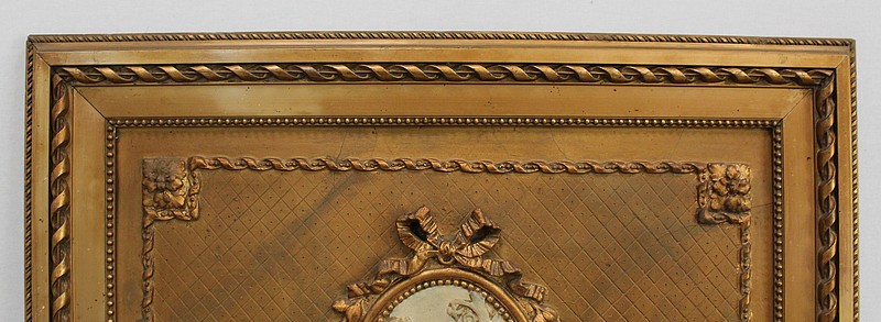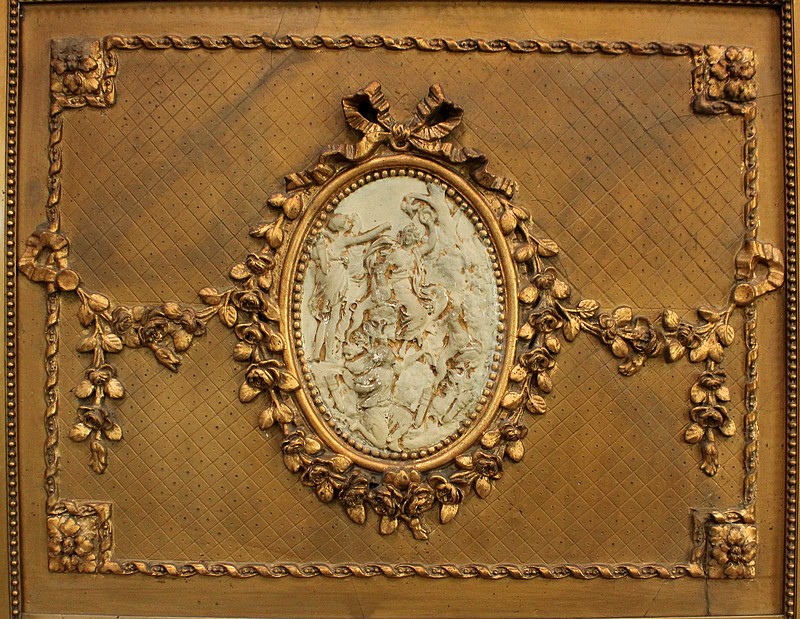 En partie supérieure, un Bas-relief en Albâtre de forme Ovale représente une Scène Romantique animée de Femmes et d’Animaux. Surmontée d’ un Nœud, entourée d’une Guirlande Perlée et d’une Couronne de Fleurs, cette Sculpture centrale est encadrée de Rubans et d’Ornementations florales.