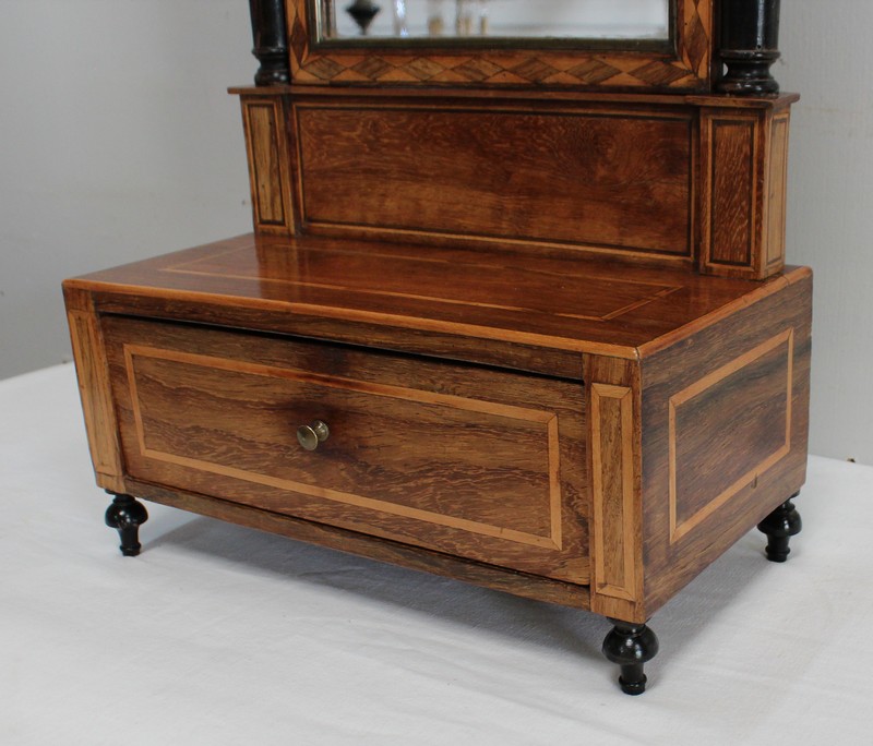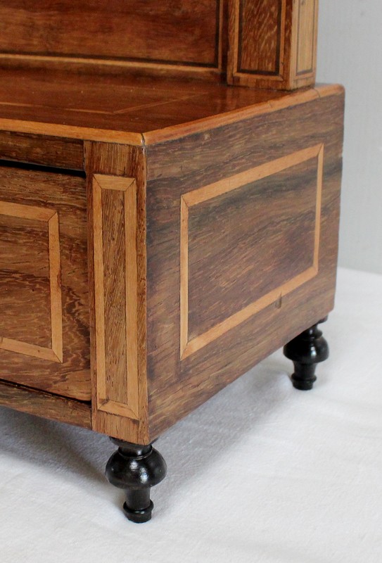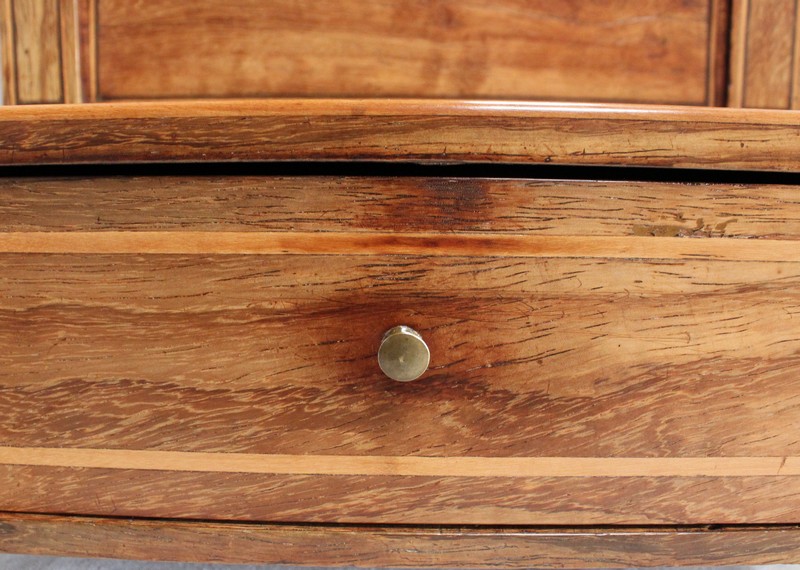 La partie basse de ce Bien offre un petit tiroir de 9 cm de profondeur. Sa façade est enjolivée d’un Joli Filet de Citronnier formant encadrement, que l’on retrouve sur le dessus, les côtés et les montants avant de cet élément inférieur.